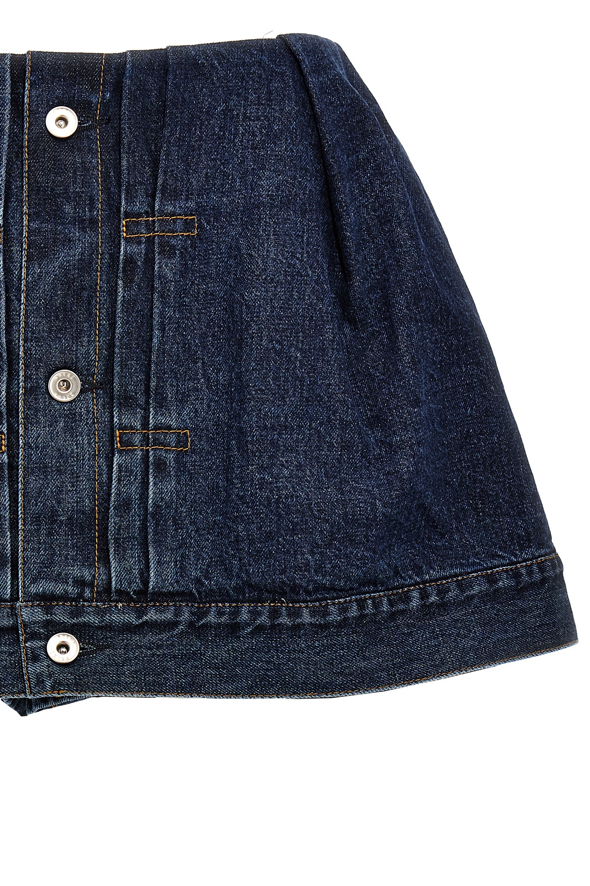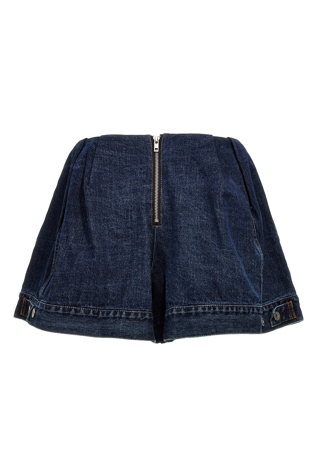 Denim skort with front buttons, back zip closure, contrast stitching, side pockets.