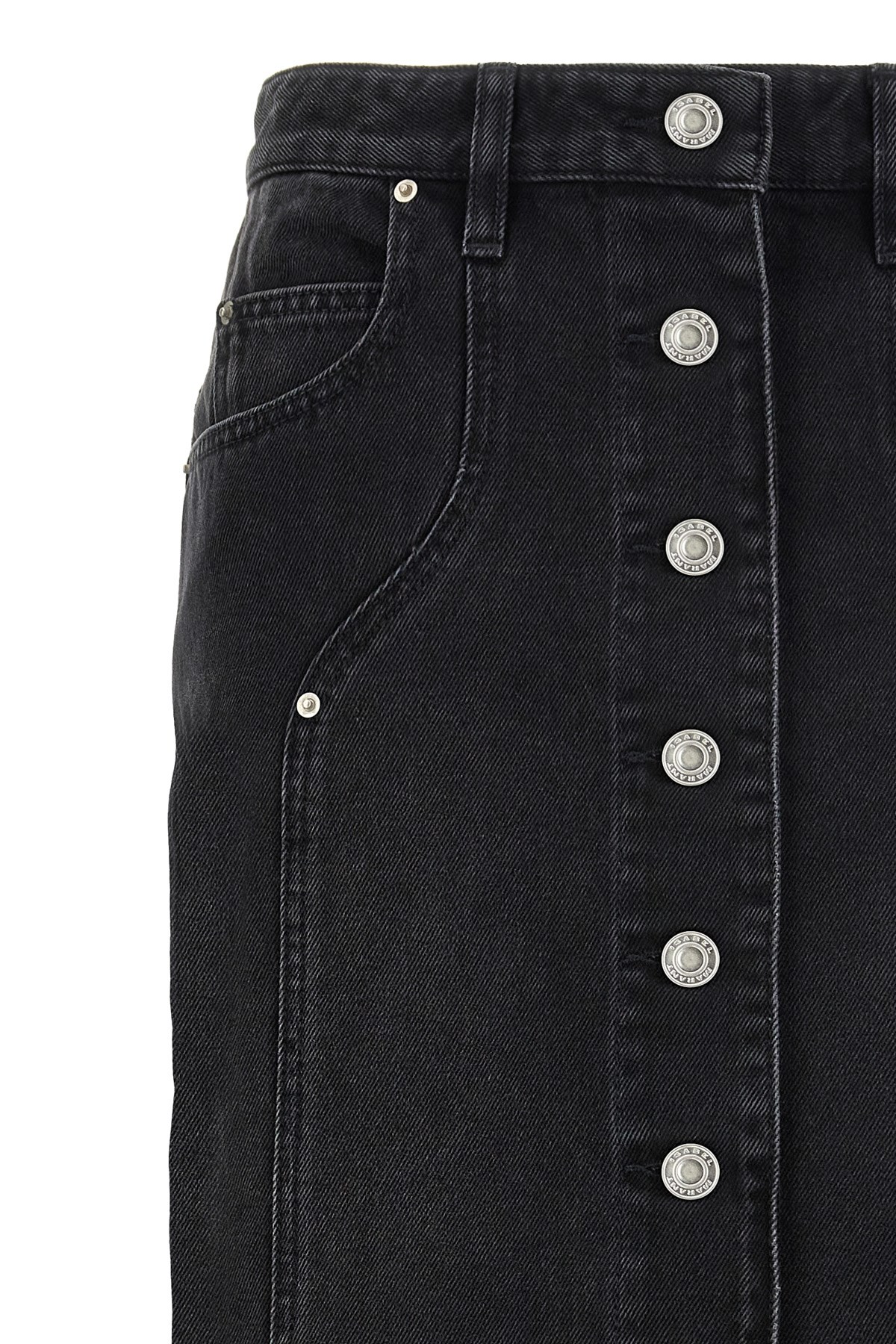 'Vandy' cotton denim skirt with front button closure, five pockets, leather logo tag.