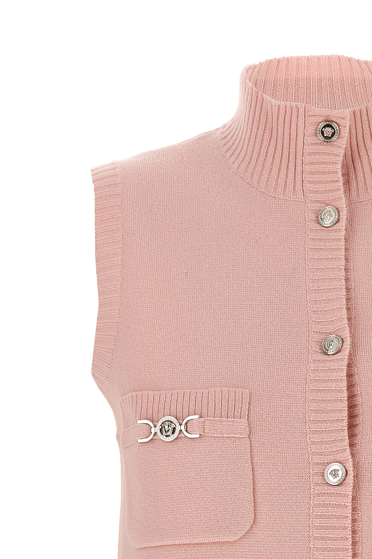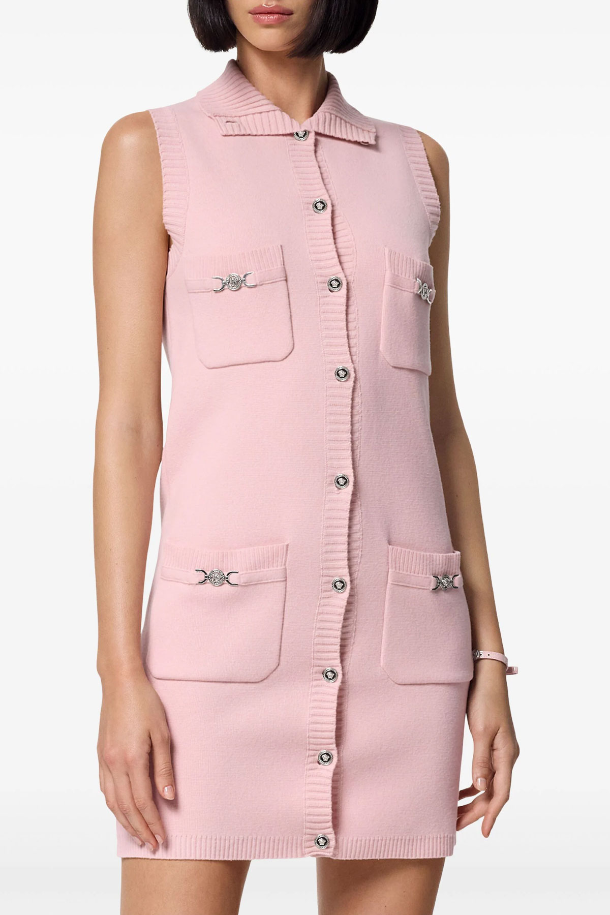 Wool blend knit dress, pockets with 'Medusa '95' detail, Medusa button closure on the front, sleeveless.