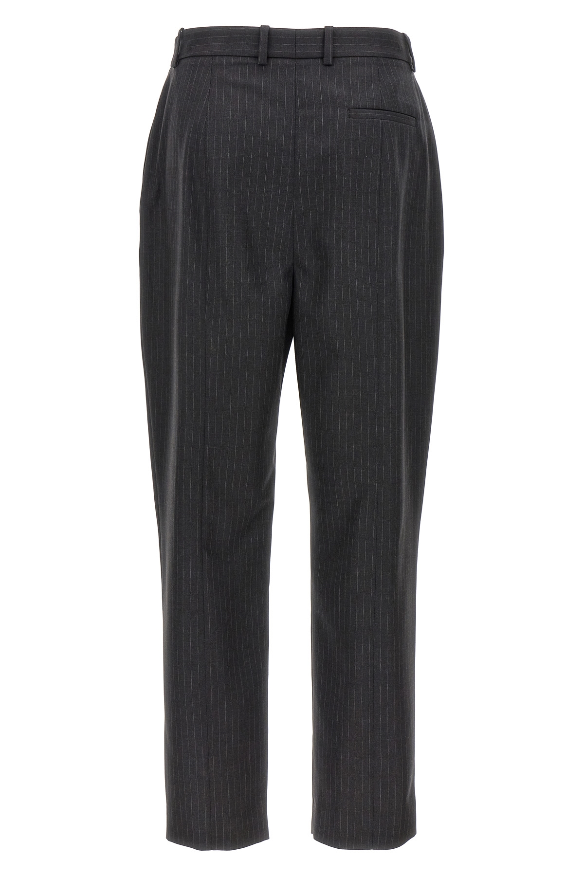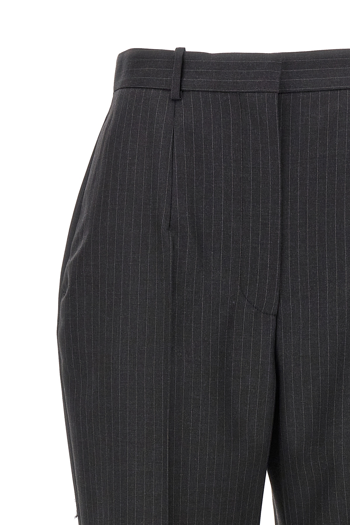 Pinstripe wool pants, hook and button zip closure, pockets, ironed pleat.