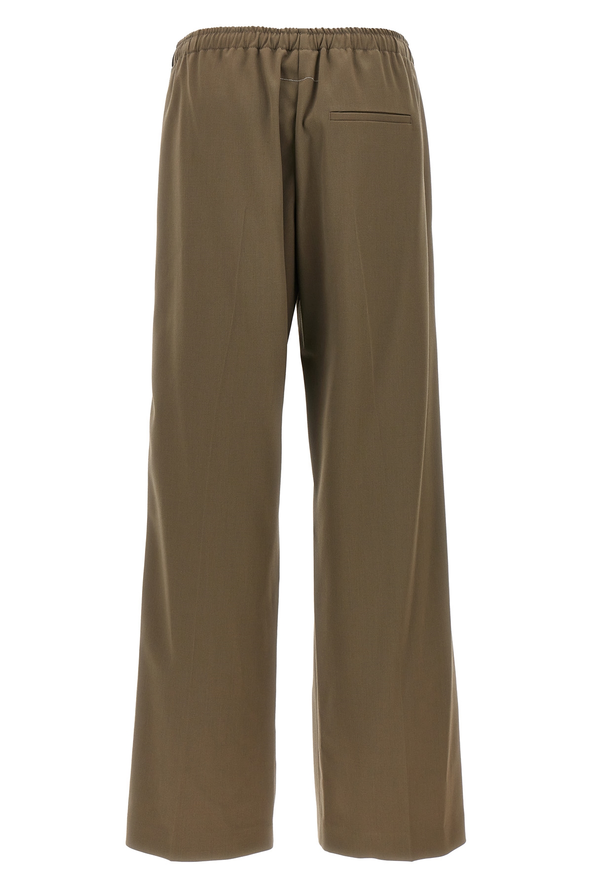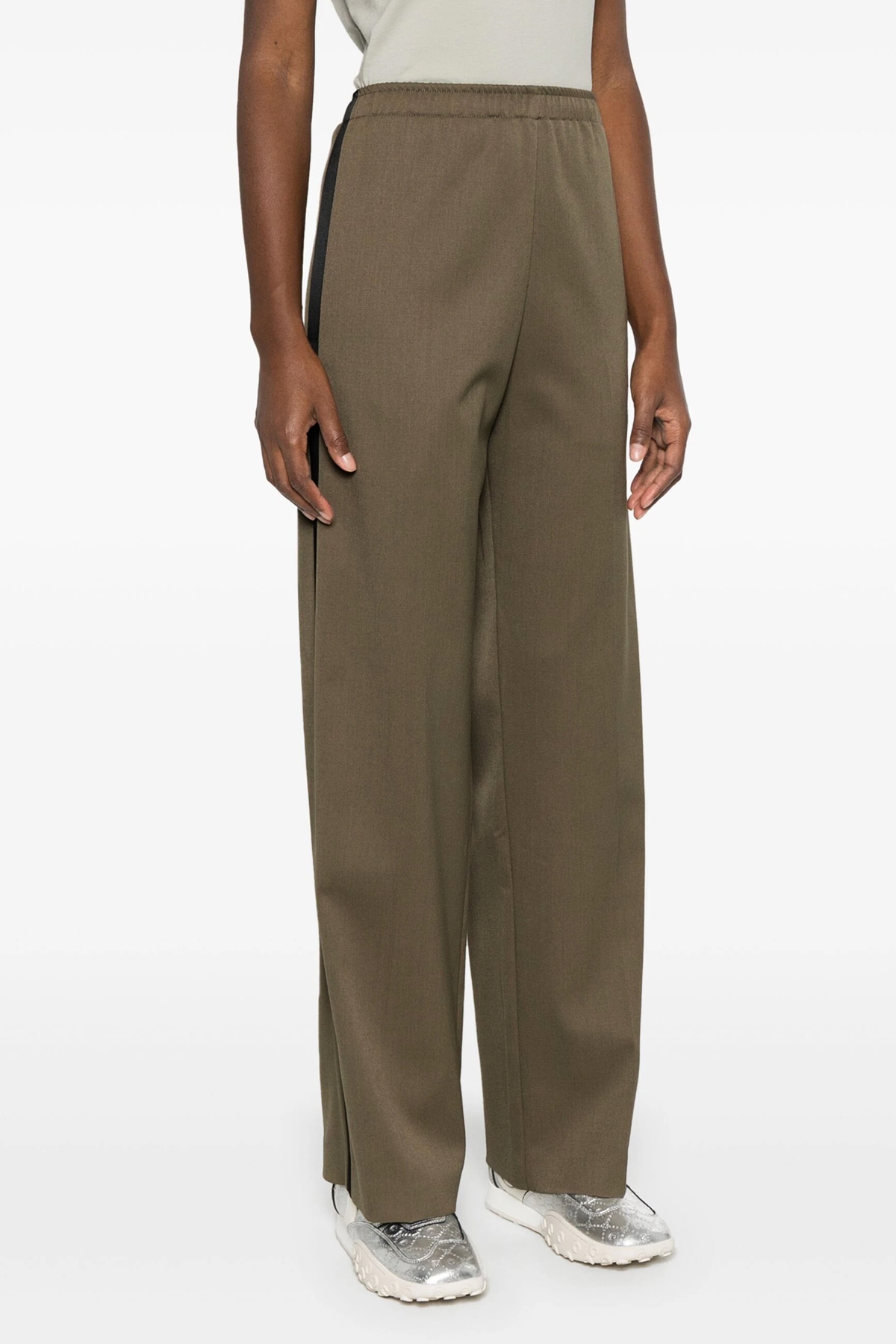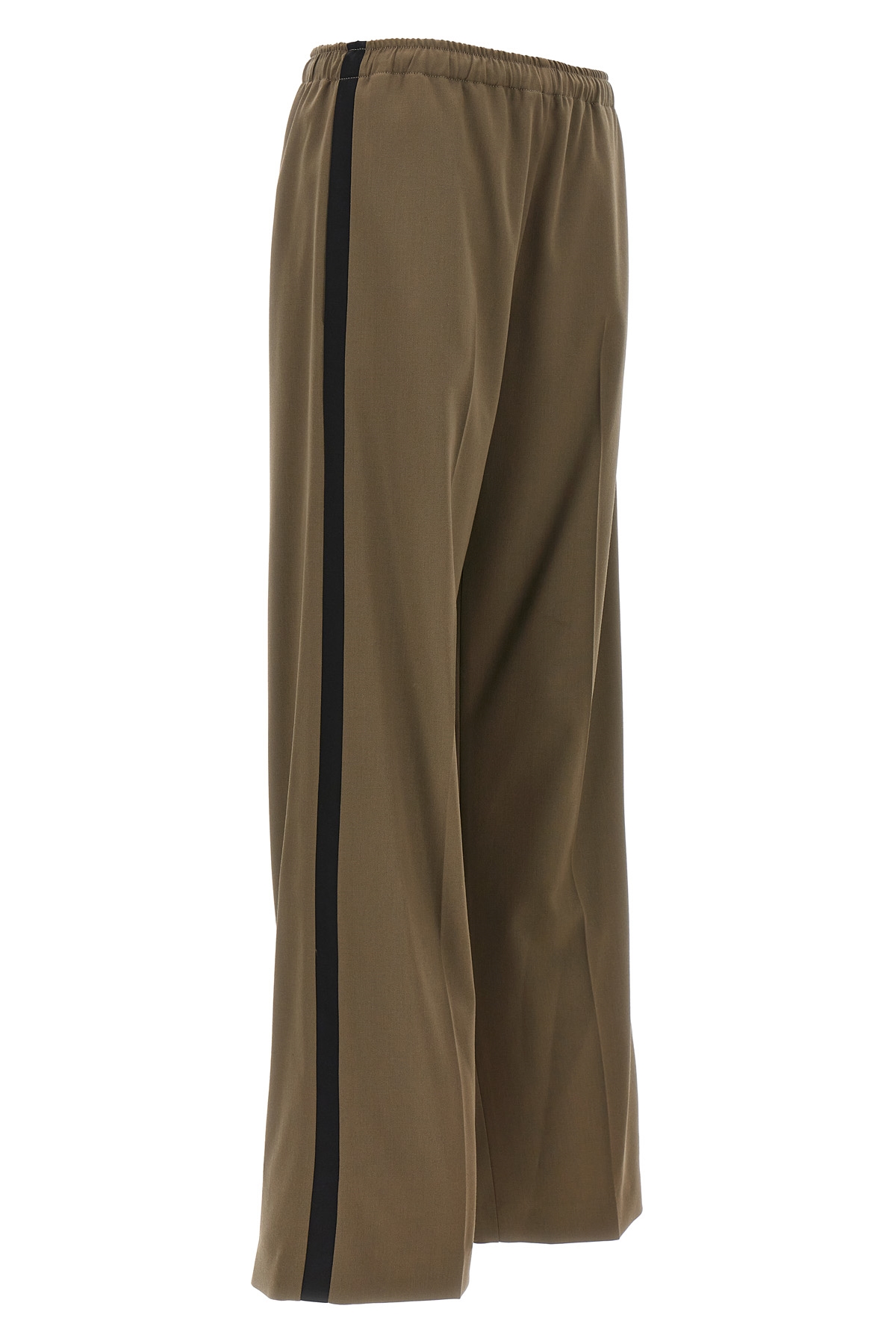 Wool blend trousers with contrast satin bands on the hips, elastic and drawstring at the waist, pockets, straight and wide leg with stretched pleat.