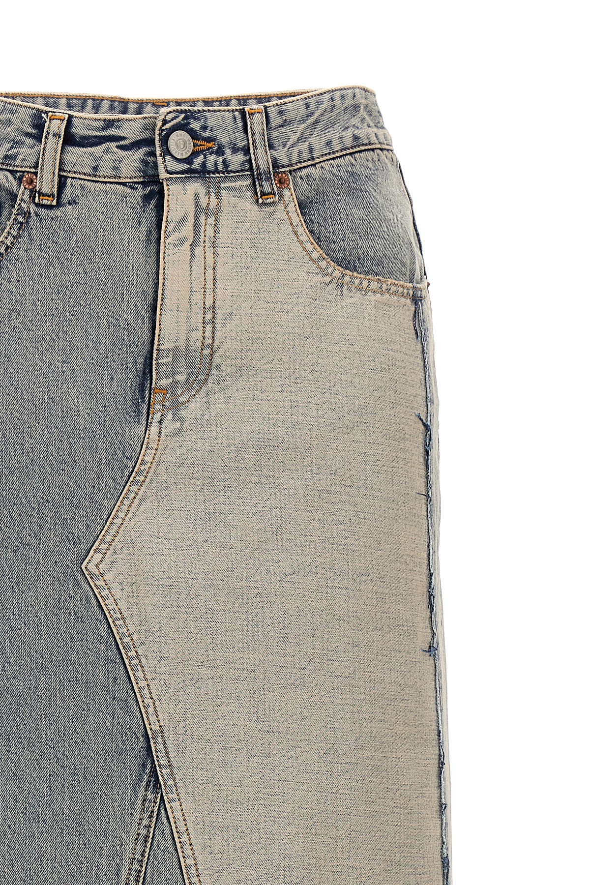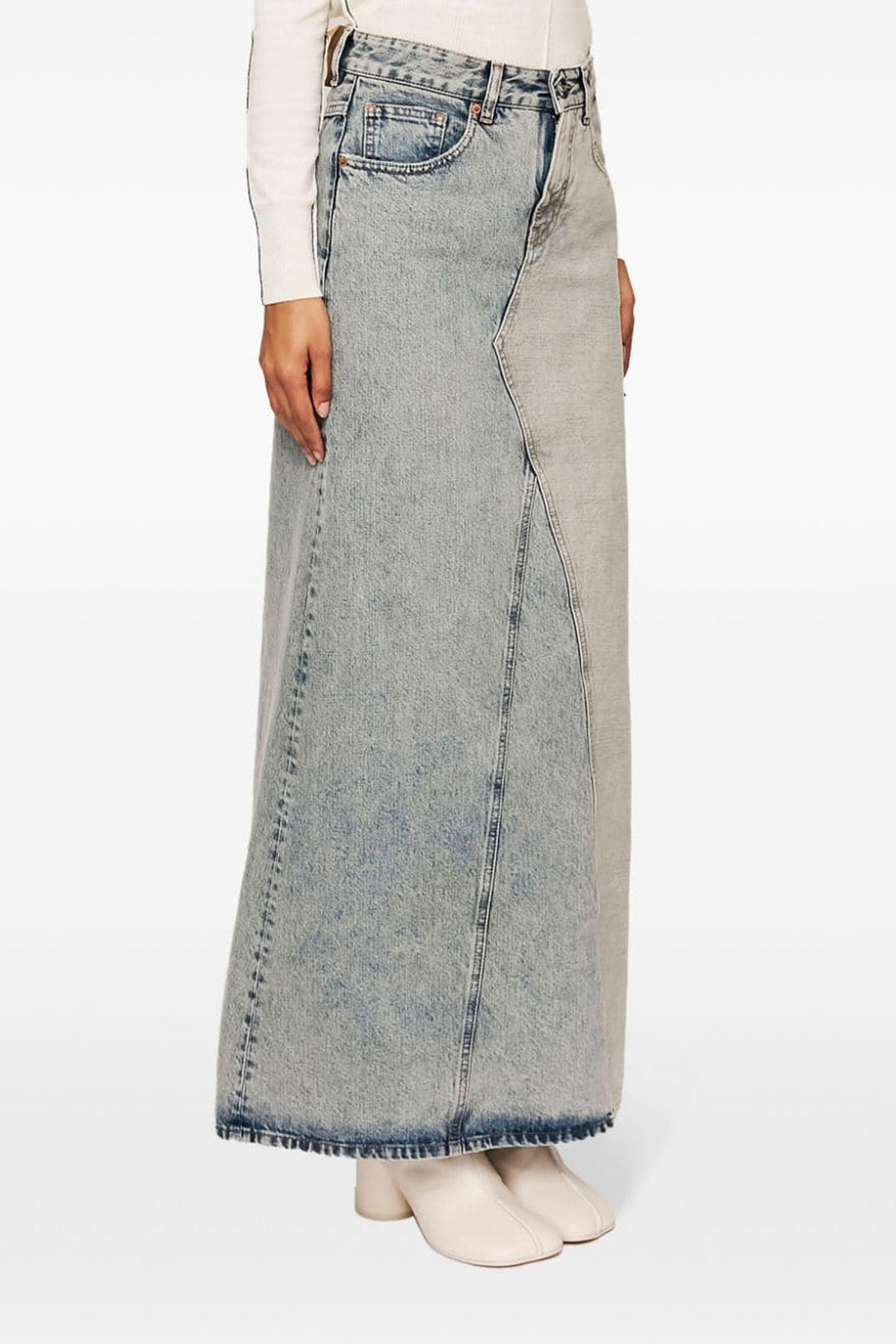 Long skirt in cotton denim with front stitching detail, zip and button closure, five pockets, back split.