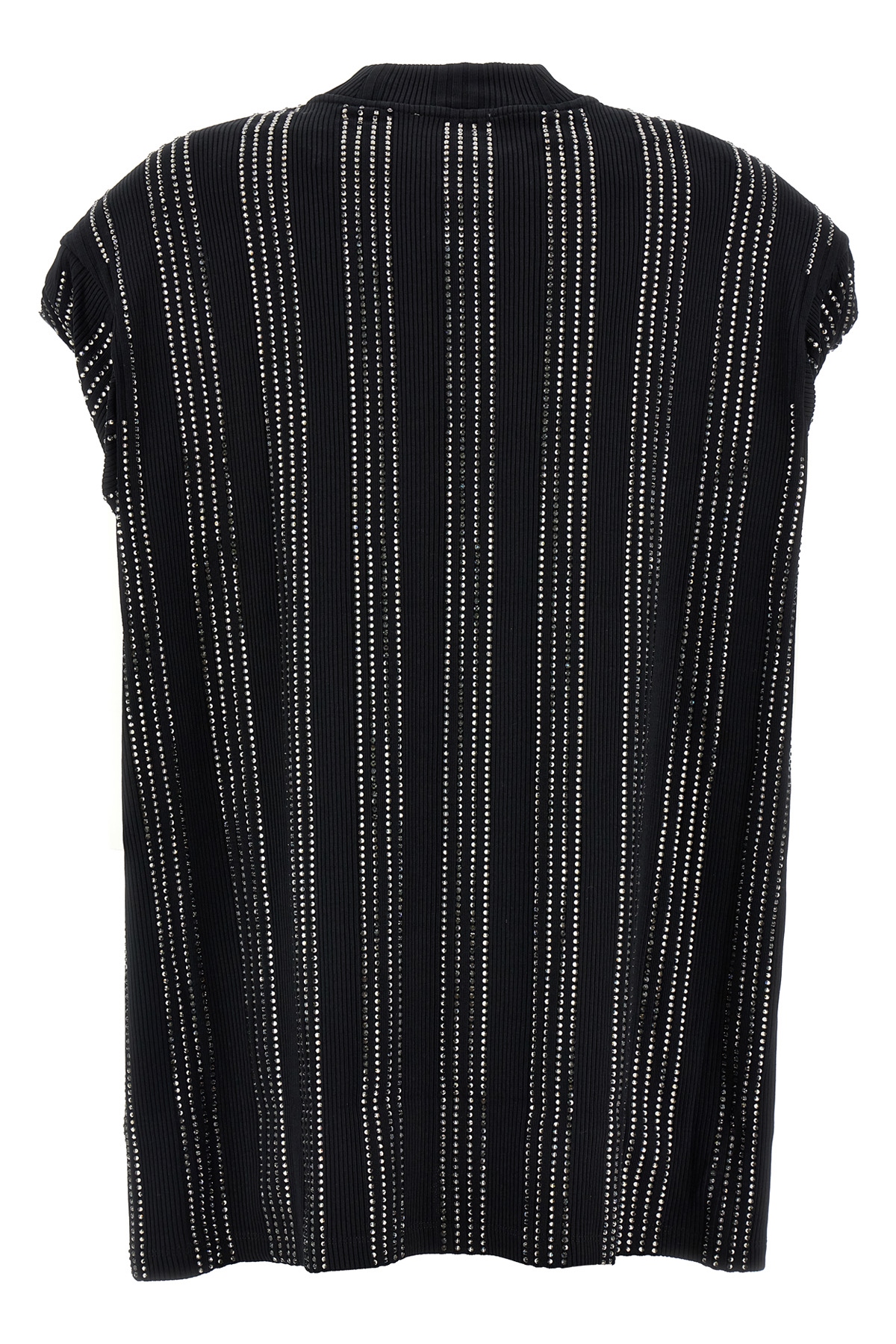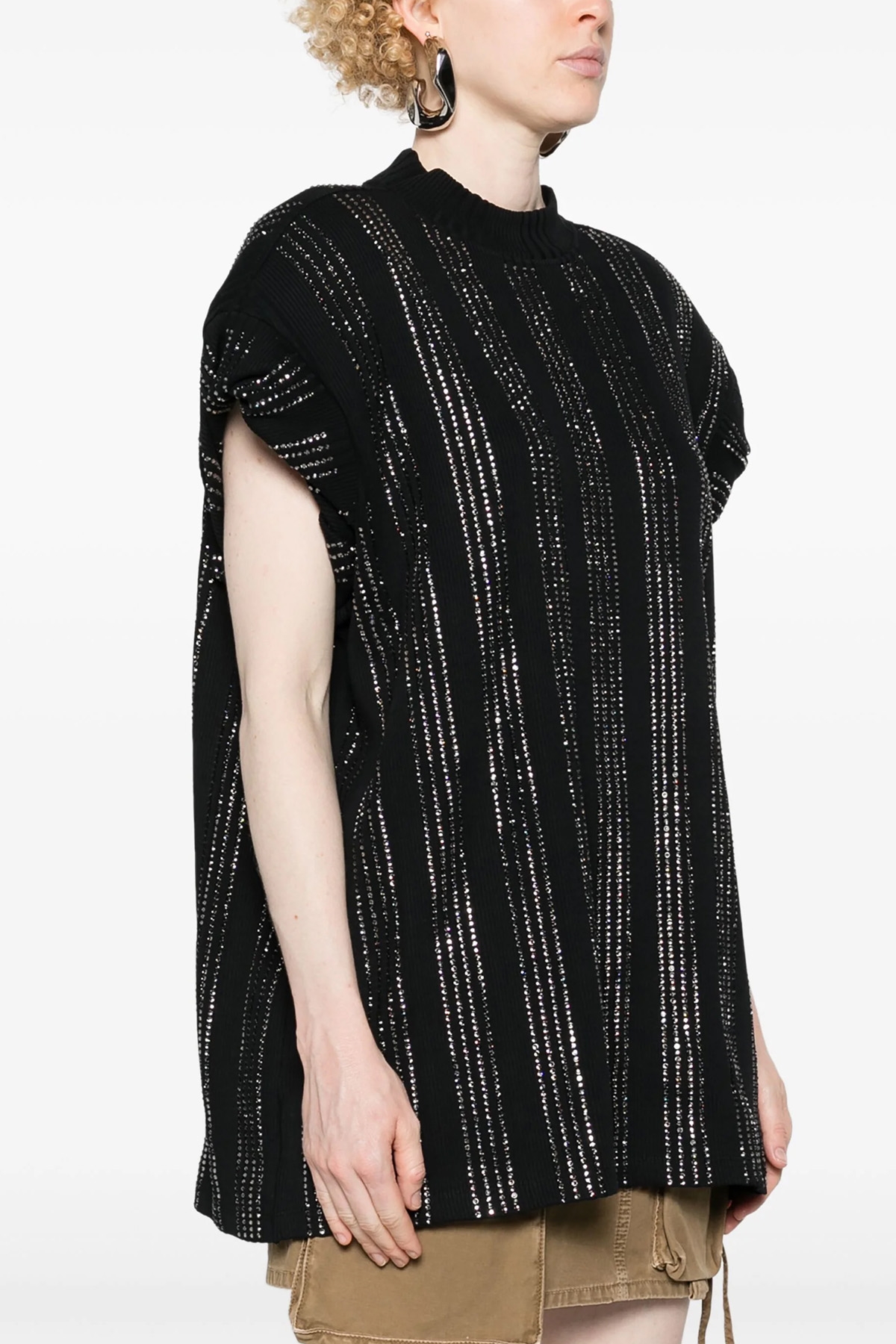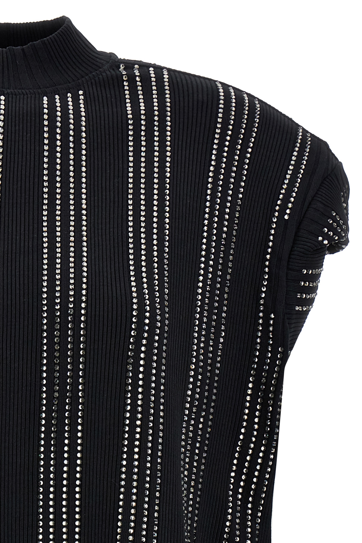 'Laurie' cotton jersey dress with thermorhinestone applique, padded shoulders, short sleeves with maxi torchons.