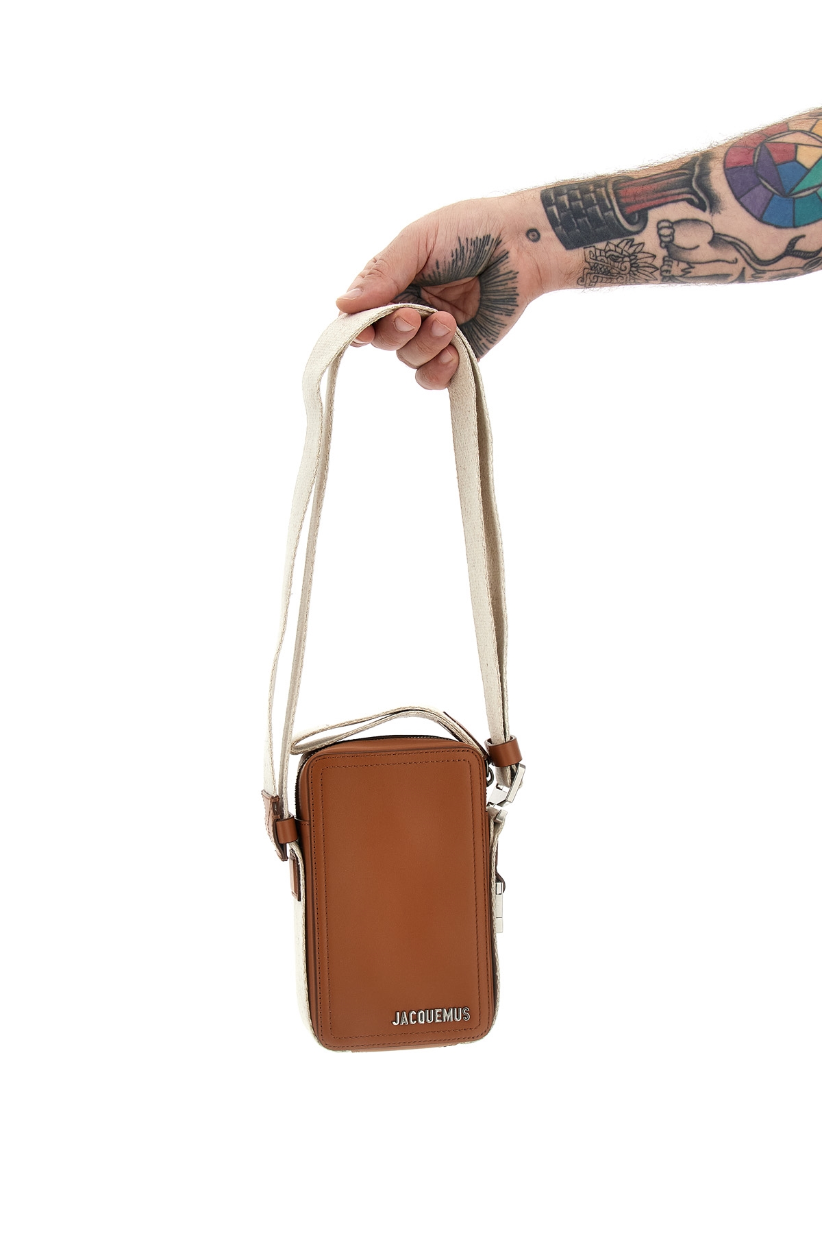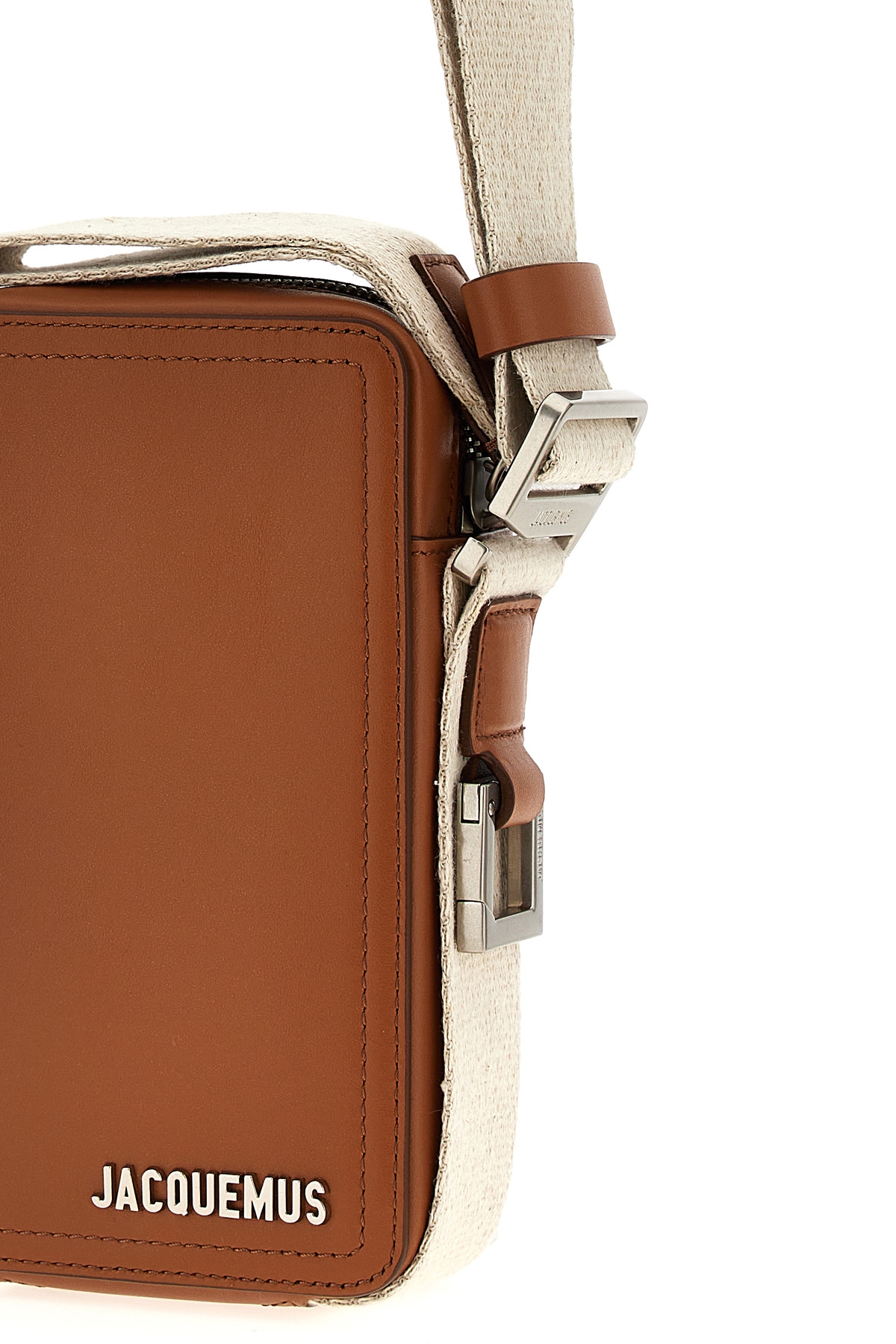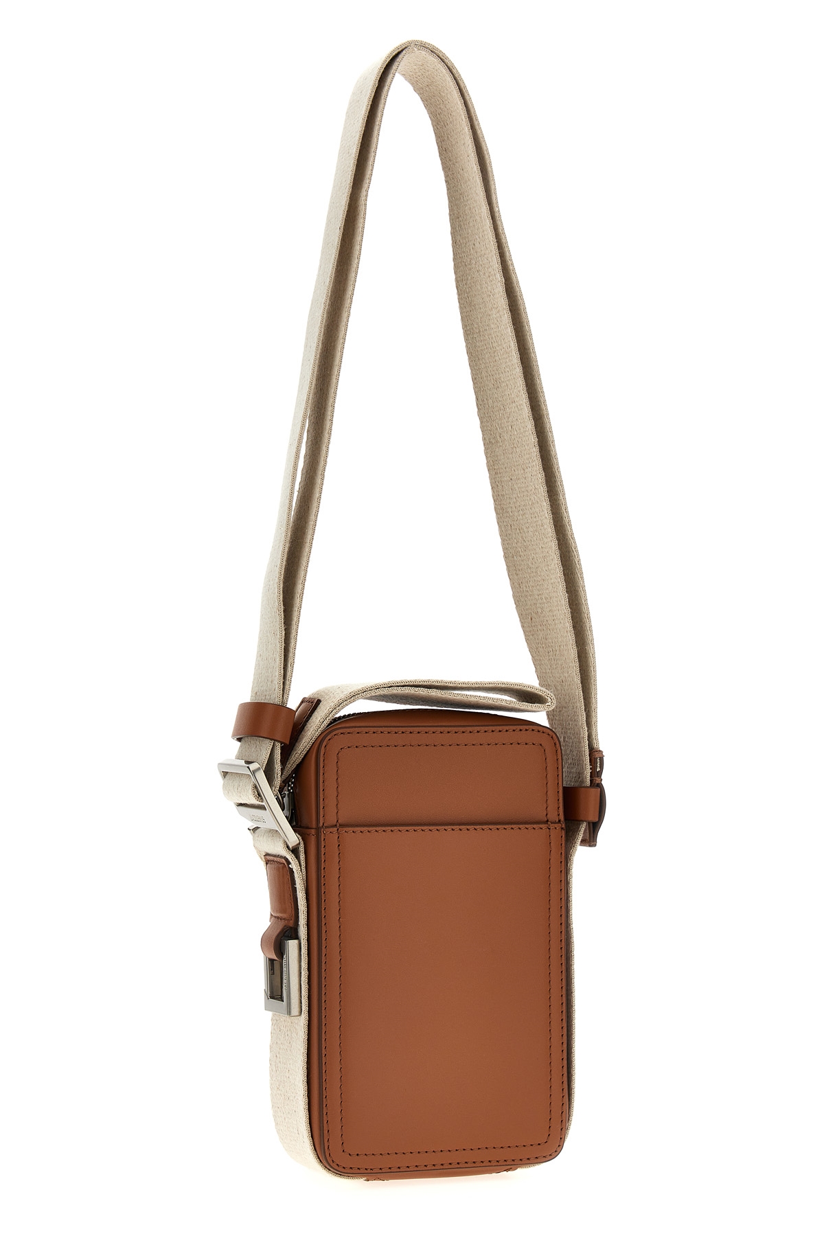 'Le Cuerda vertical' leather crossbody bag with front metal logo detail, zip closure, adjustable tape shoulder strap.