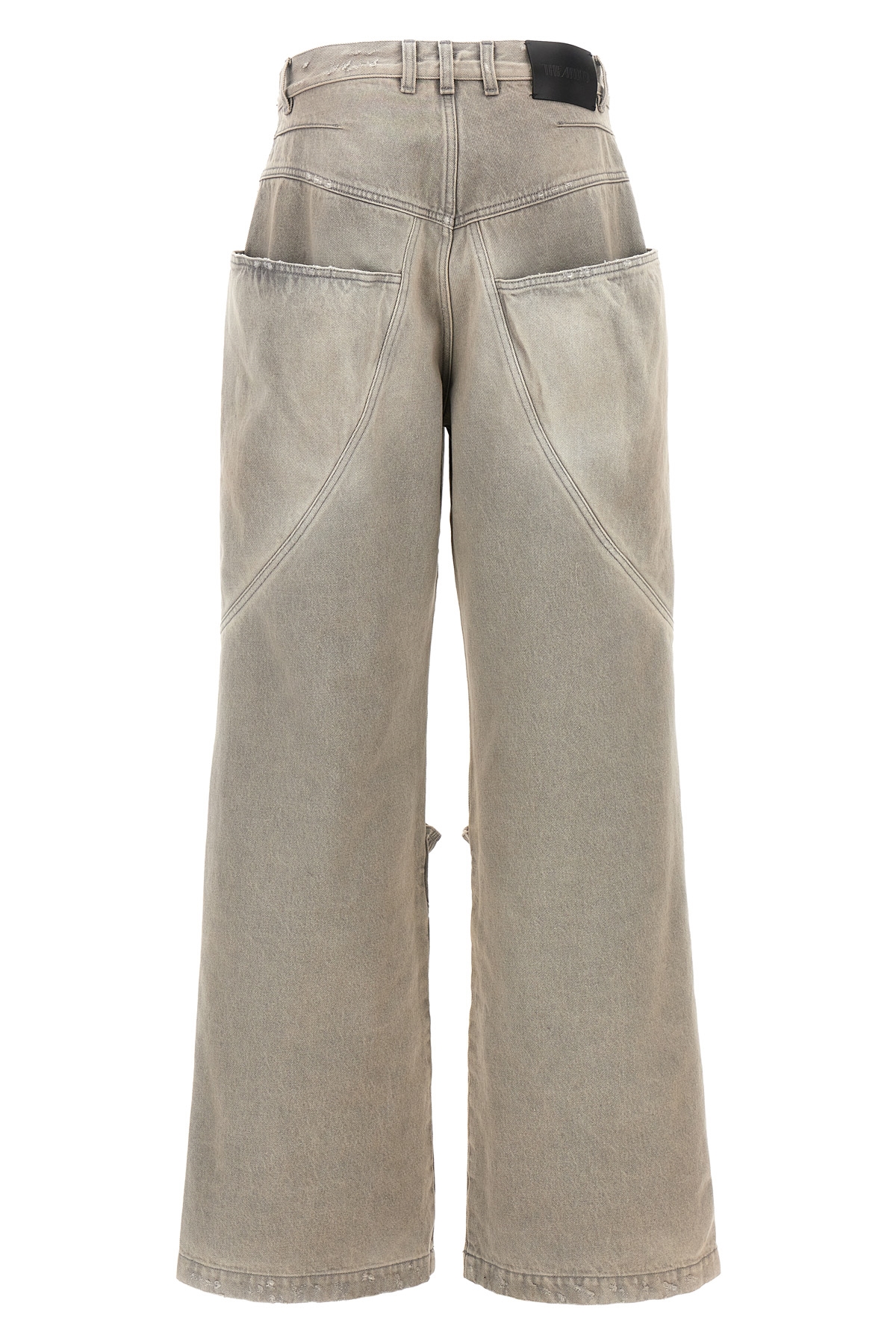 Used-effect cotton denim jeans, pockets, zip and button closure, leather logo tag, wide leg.