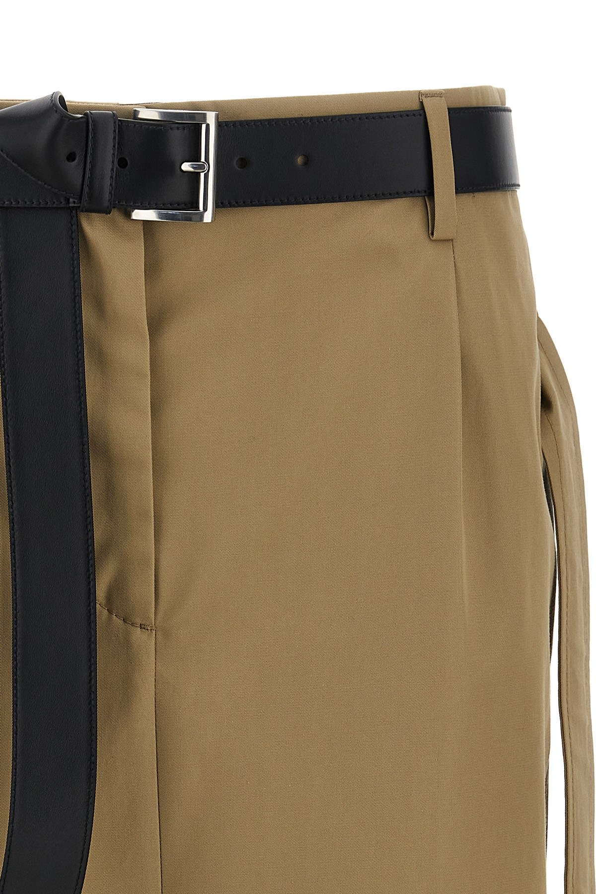 Cotton twill skirt with leather belt at the waist, zip and hook closure, pockets, back split.
