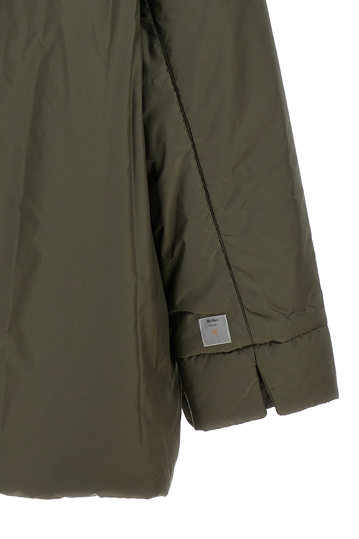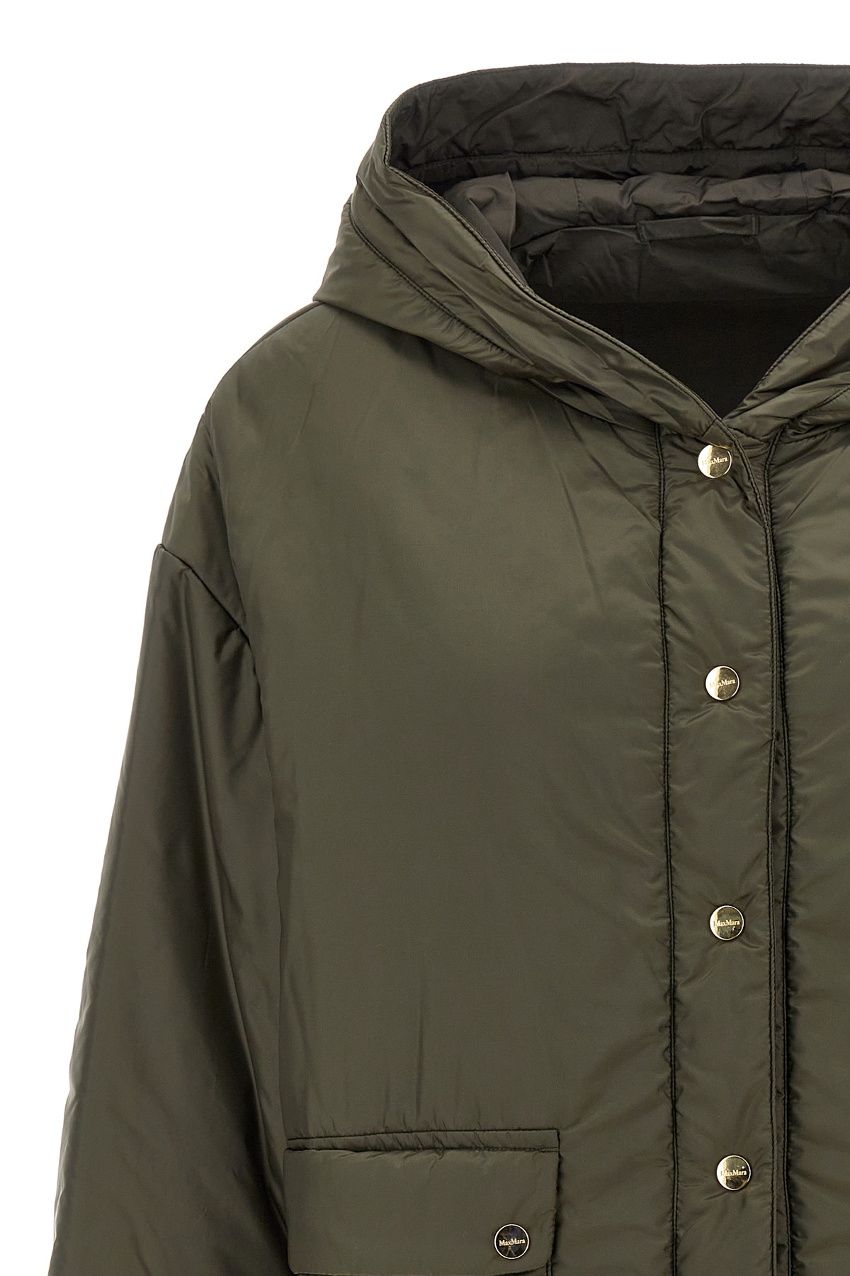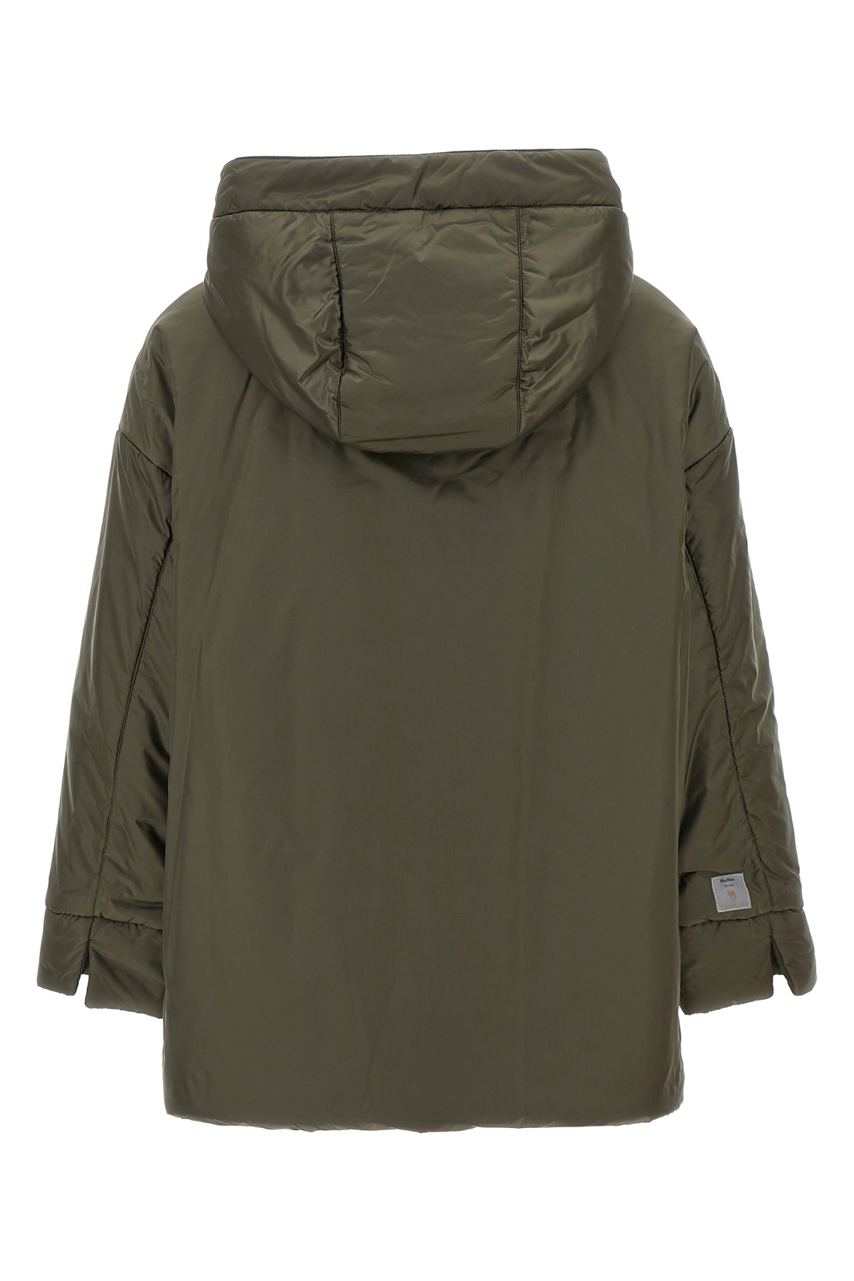 Upcycling reversible 'Greenmo' waterproof technical canvas down jacket, CameLuxe padding, with hood, button closure, pockets, long sleeves.