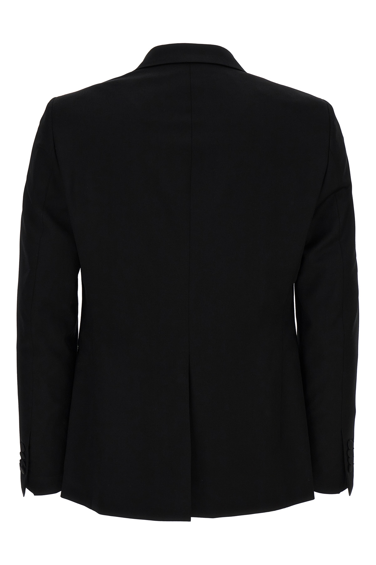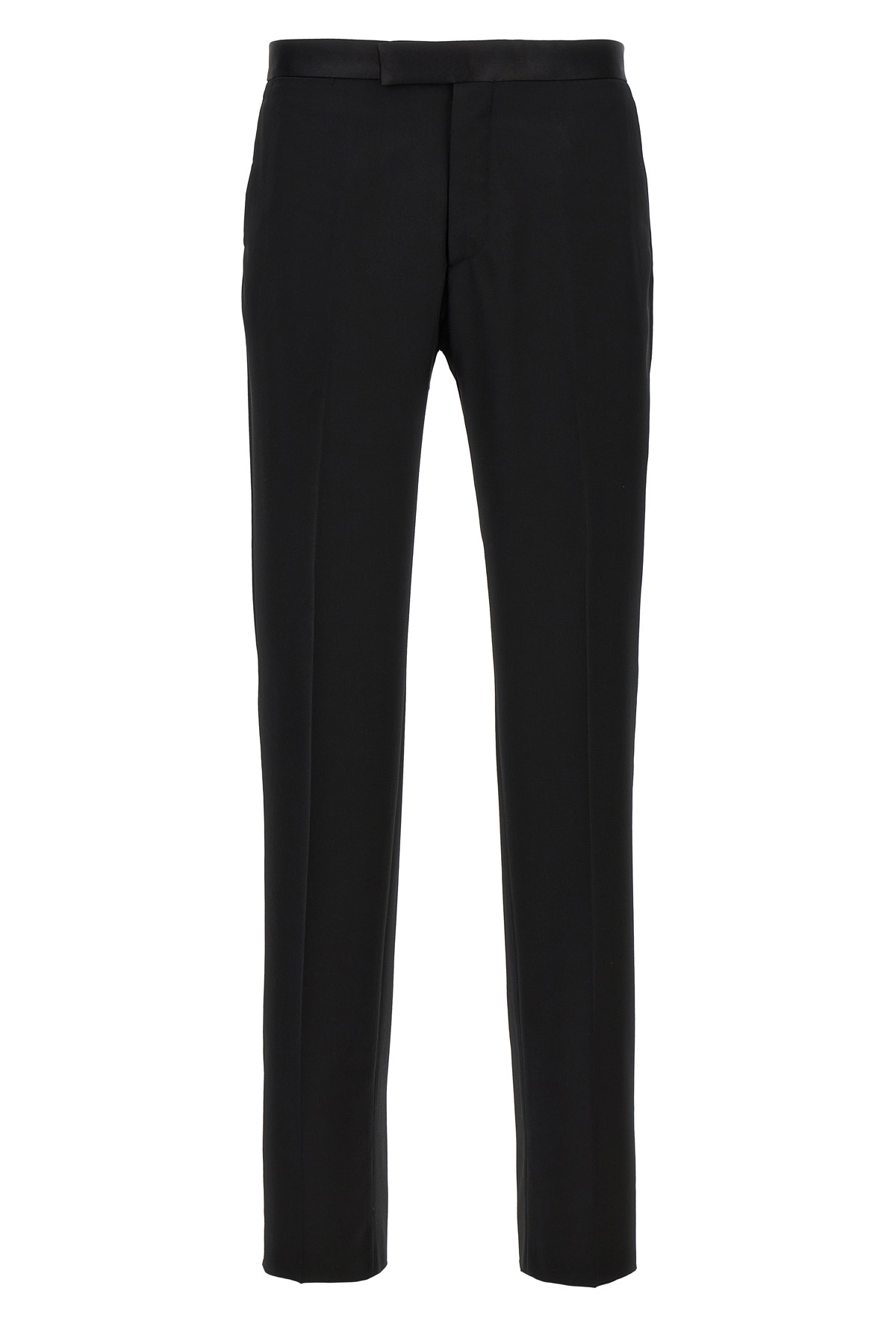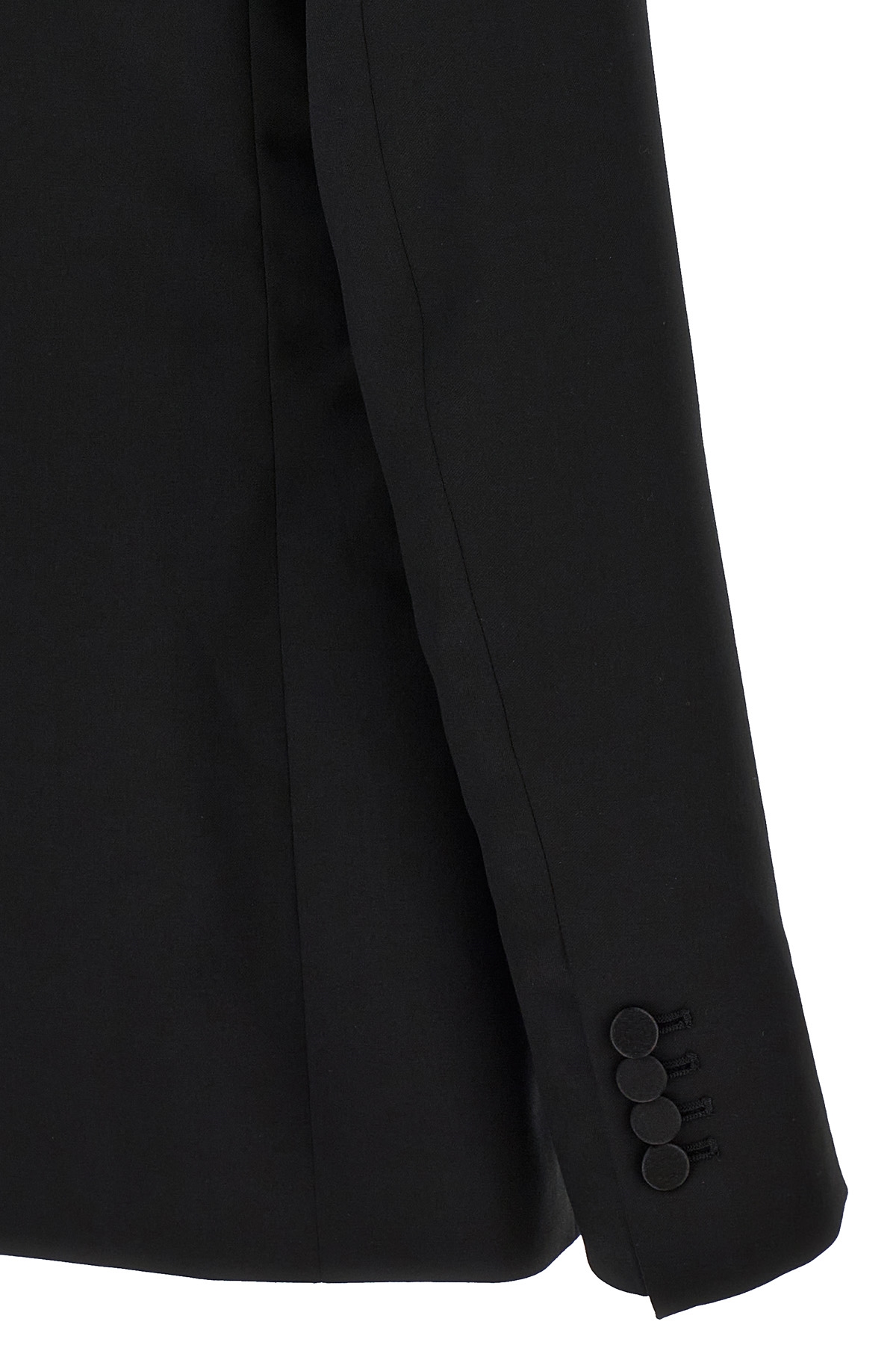 Super 110's wool tuxedo dress consisting of single-breasted blazer with button closure, pockets, back split and trousers with stretched pleat, hook and button zip closure.