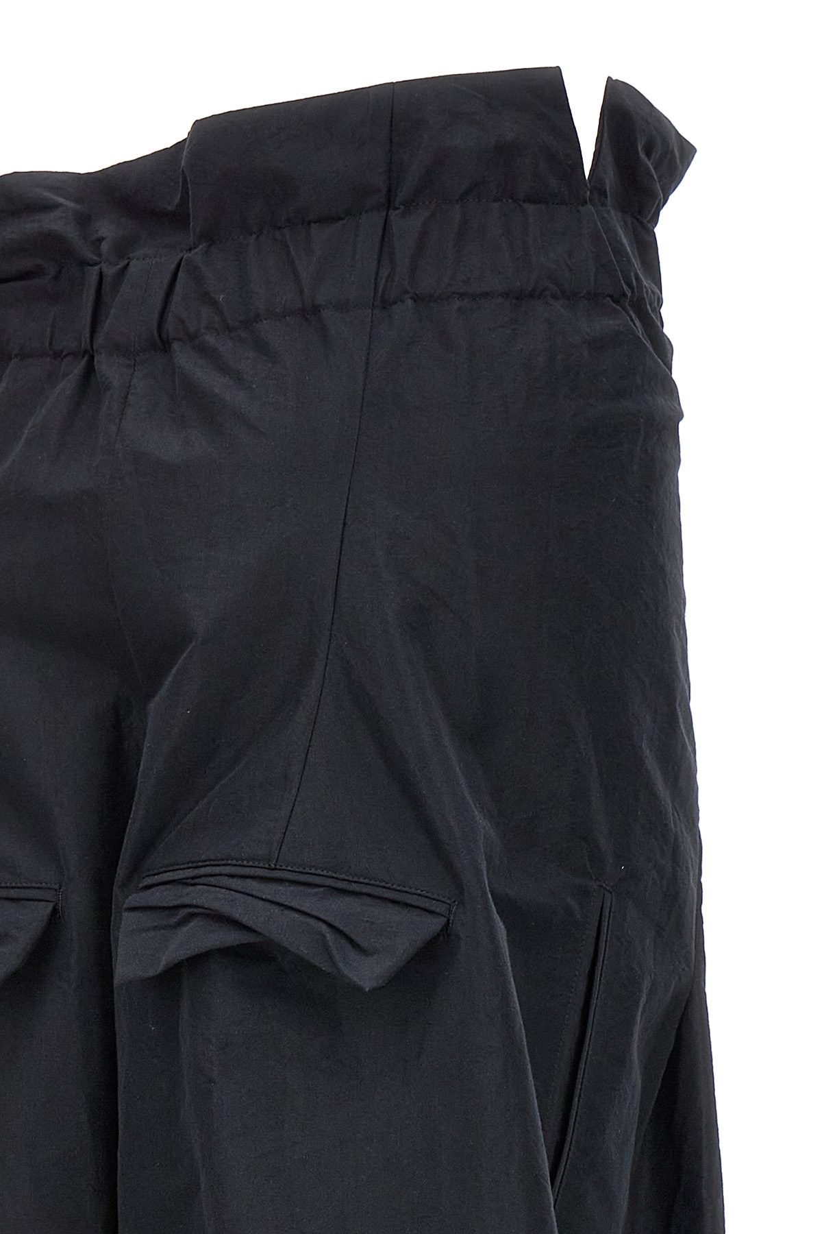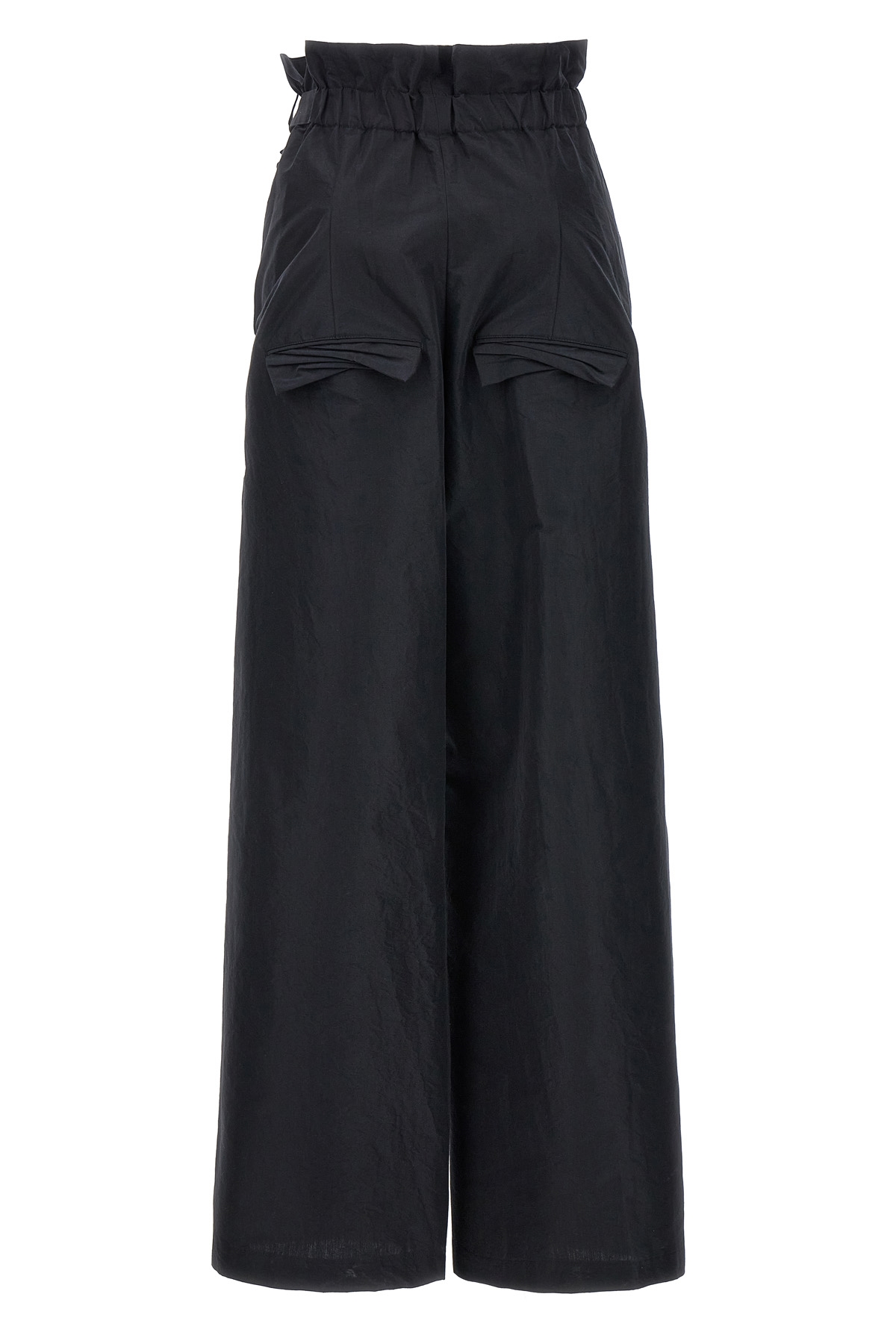 'Enfold' cotton blend trousers with elastic waistband, adjustable strap, pockets.