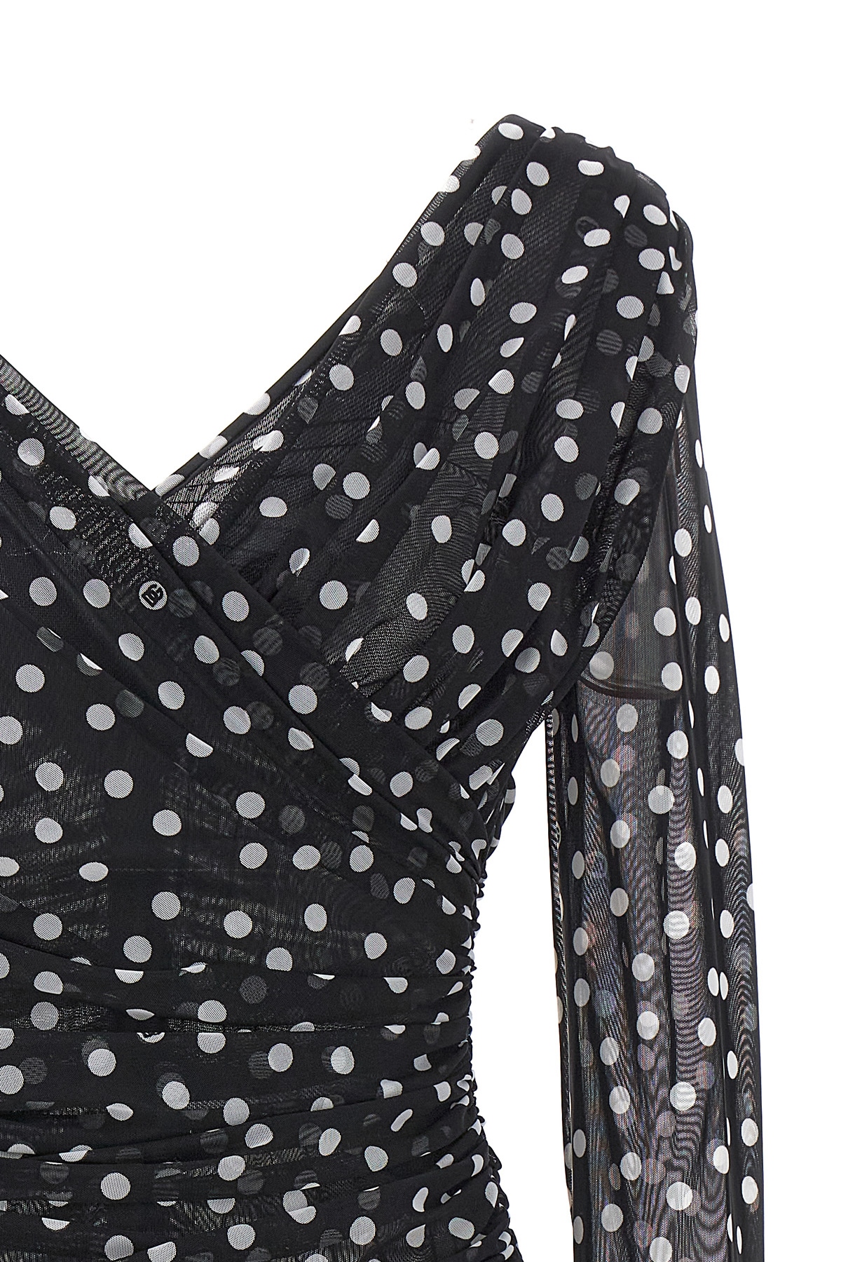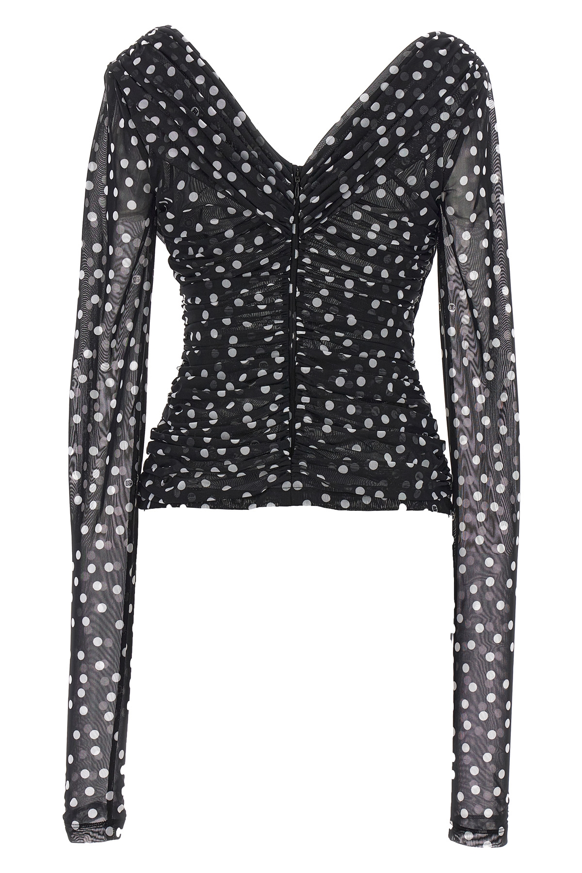 'Mambo' polka dot print stretch tulle top, crossed V-neck, long sleeves, back zip closure.