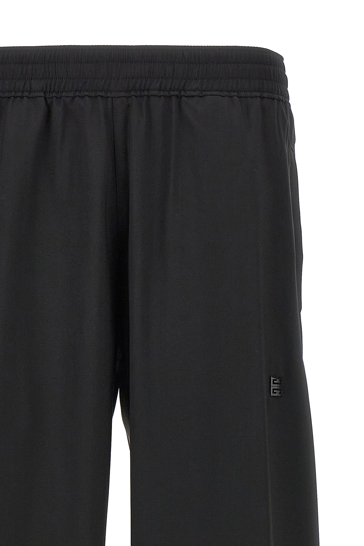 Wool trousers, tone-on-tone front logo veneer, elastic and drawstring at the waist, pockets, elastic ankle cuffs.