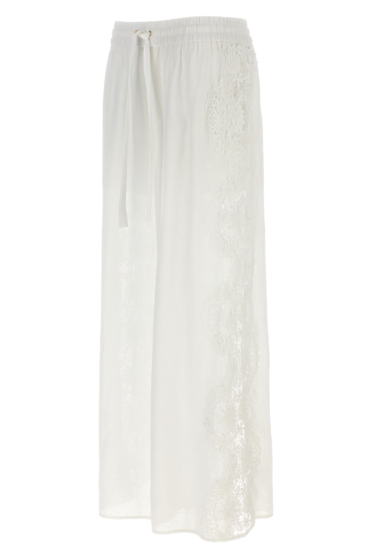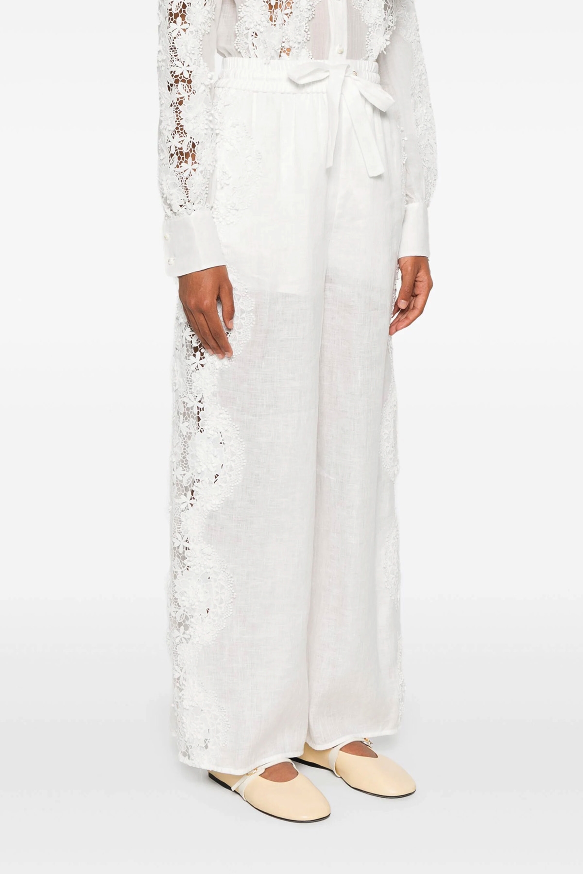 'Halliday Lace Flower' linen pants with lace inserts, elastic and drawstring at the waist, wide leg.