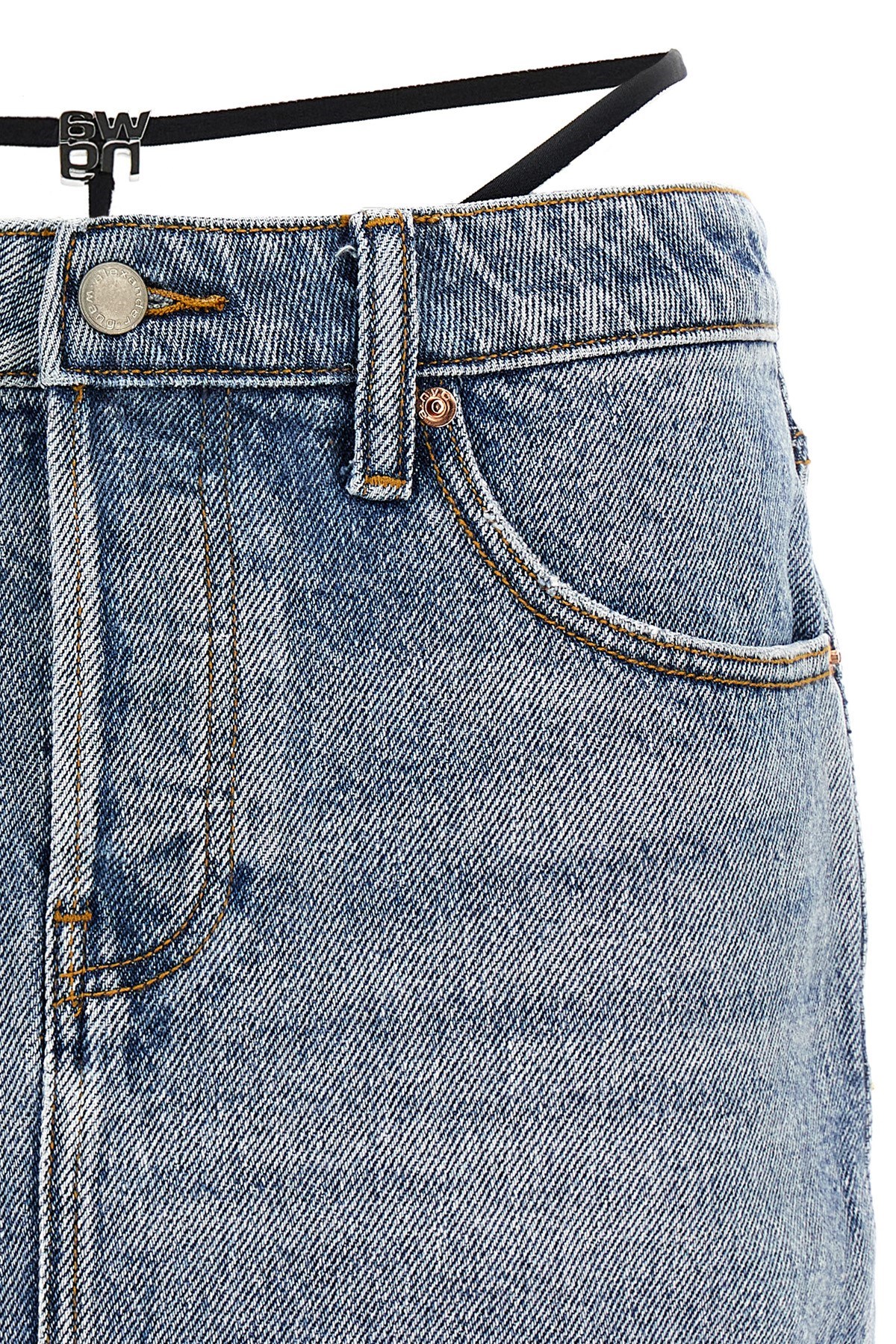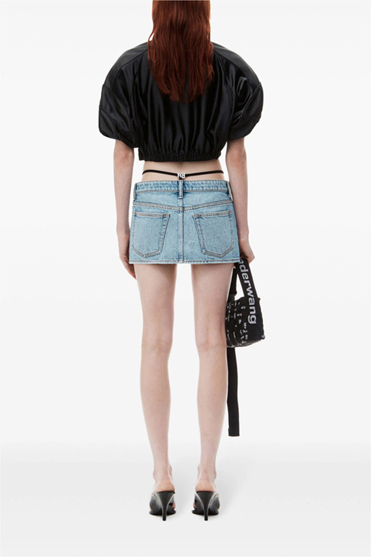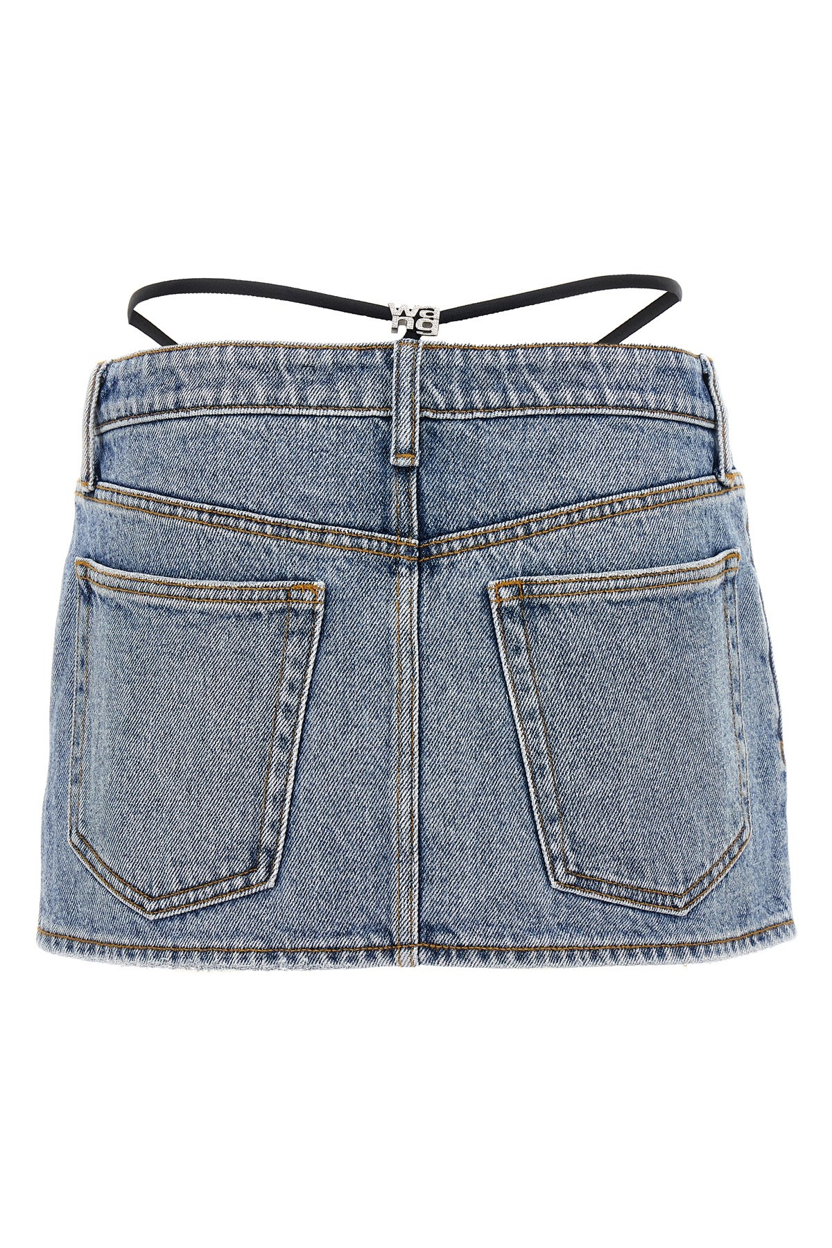 'Prestyle Diamante Charm' cotton denim skirt with button closure, five pockets, visible thong detail with logo and crystals at the waist.