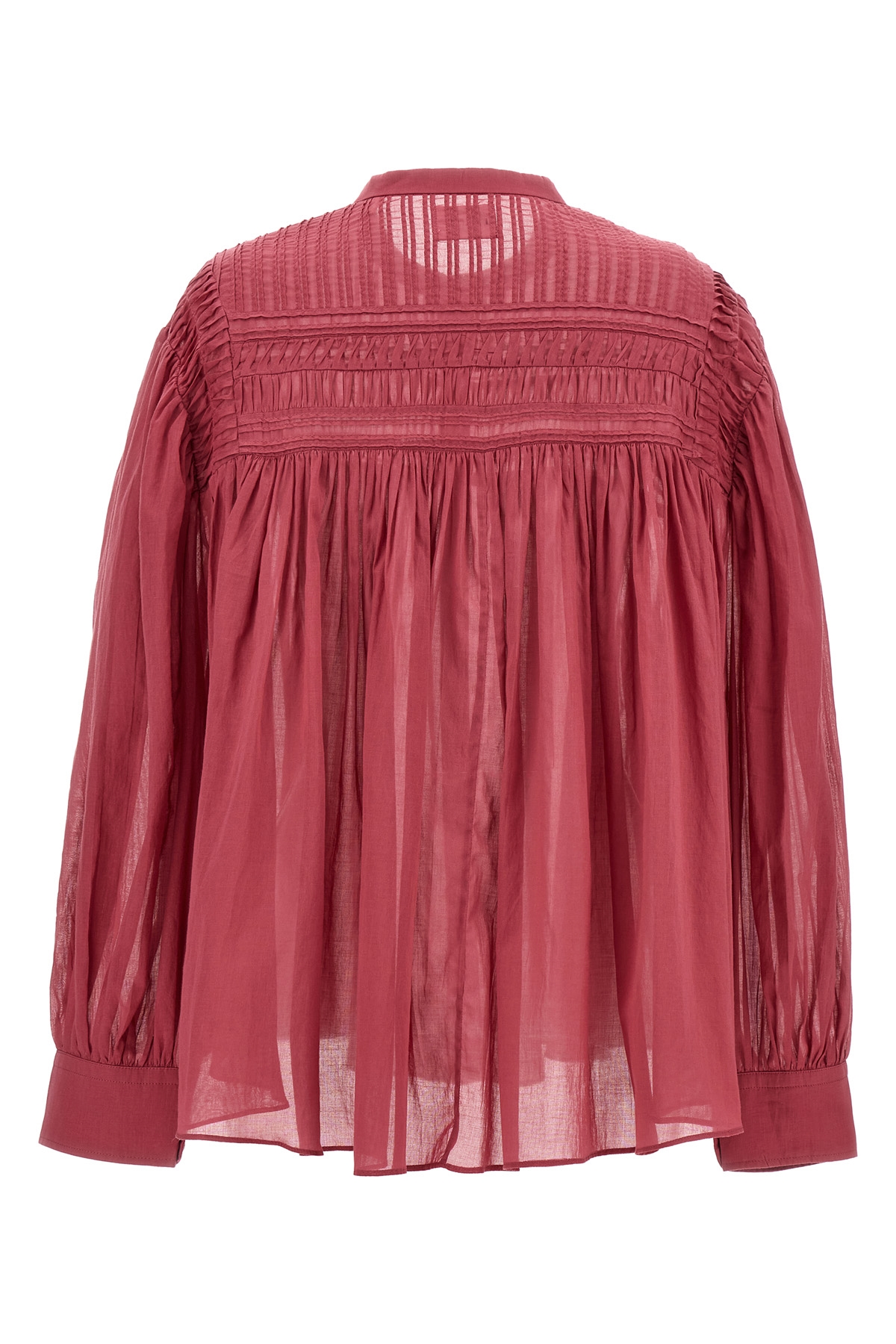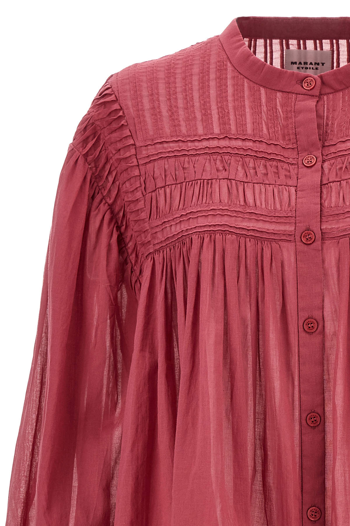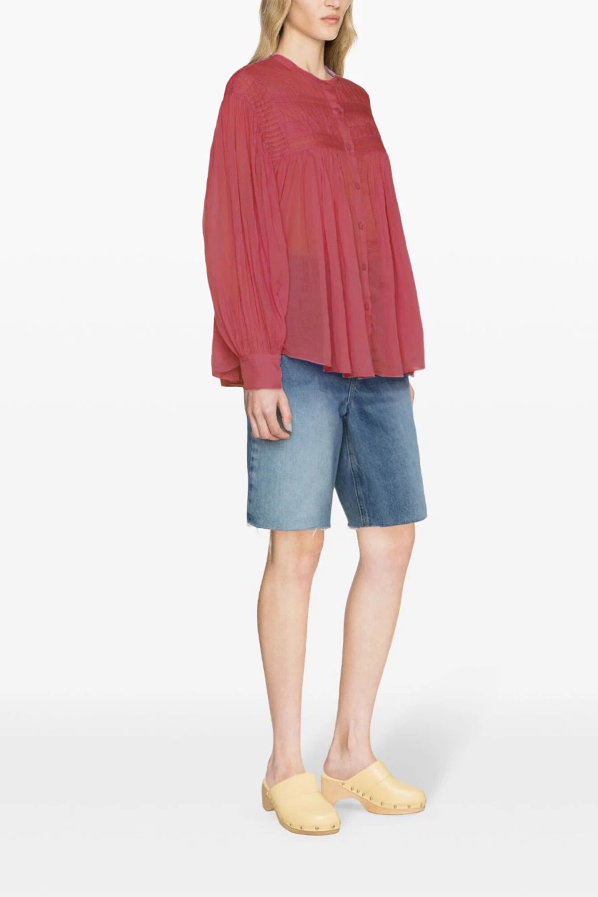 'Plalia' cotton shirt with ruffles and smock stitches, crew neck, long sleeves, button closure, long cuffed sleeves.