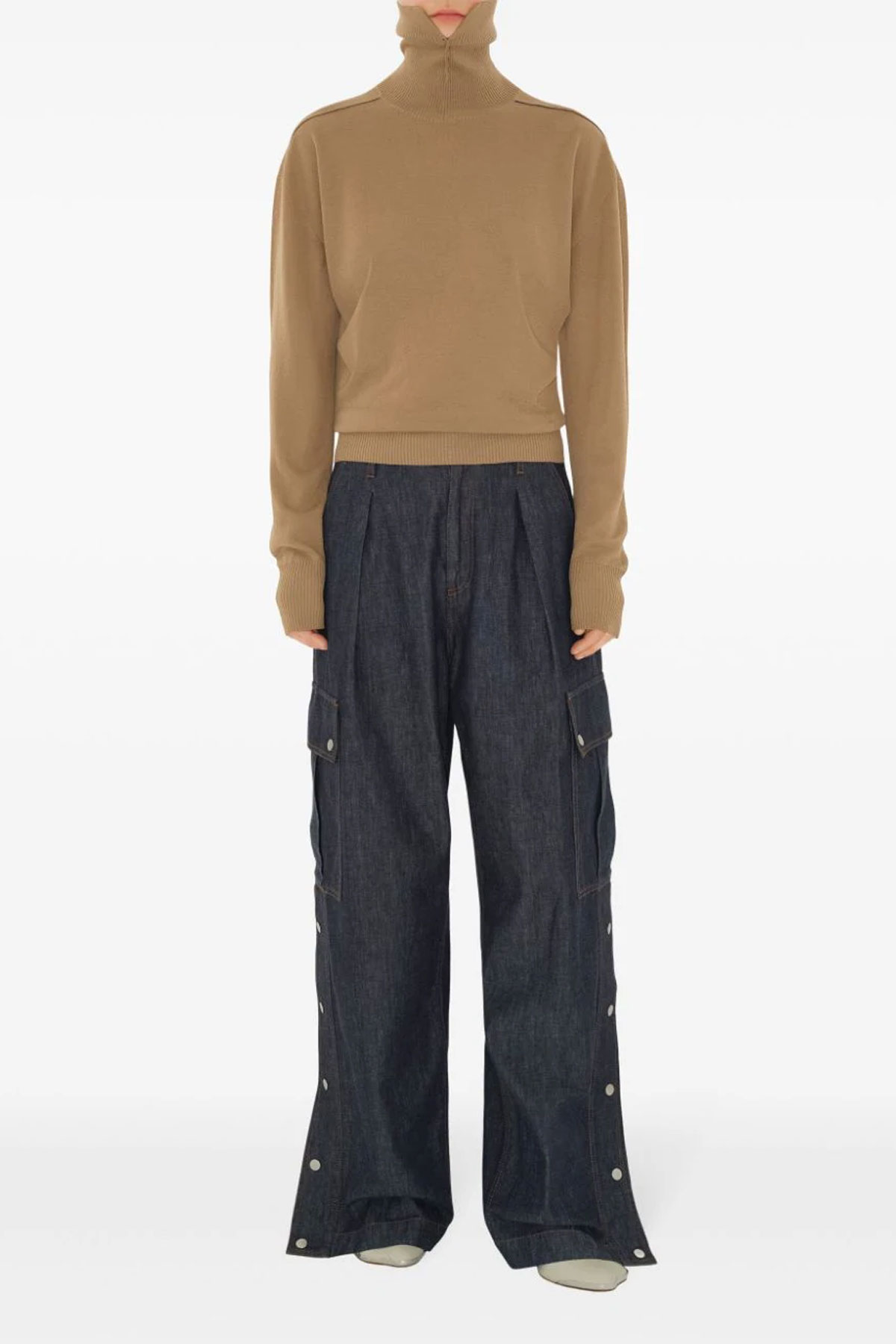 Wool sweater, high neck with split detail, front logo intarsia, long sleeves