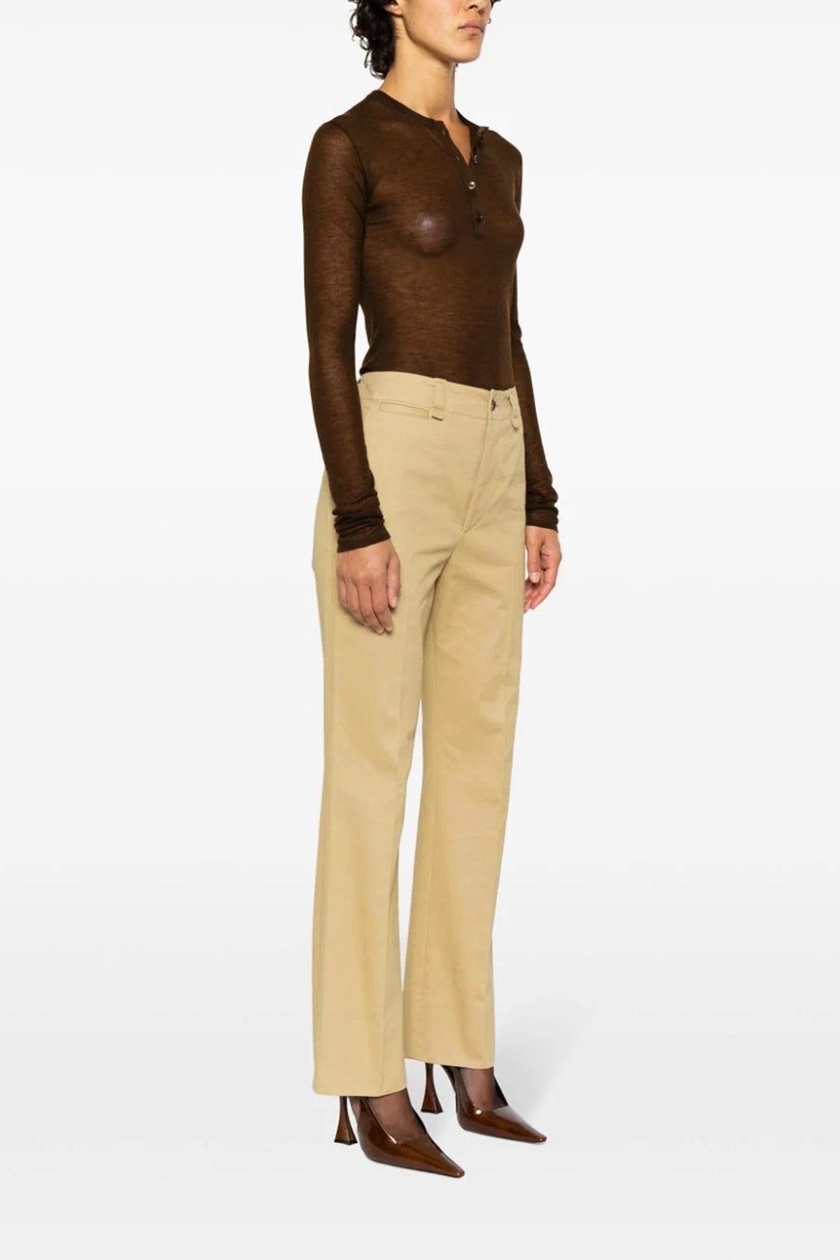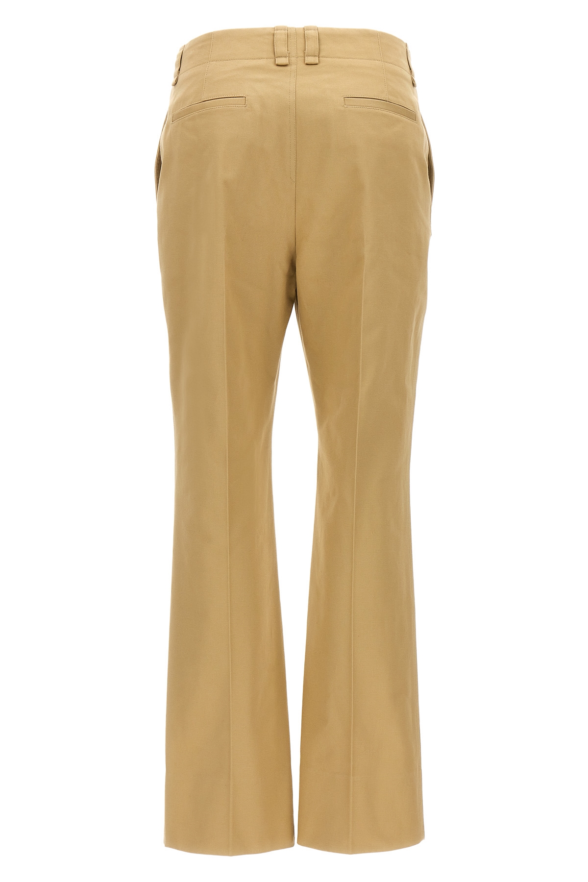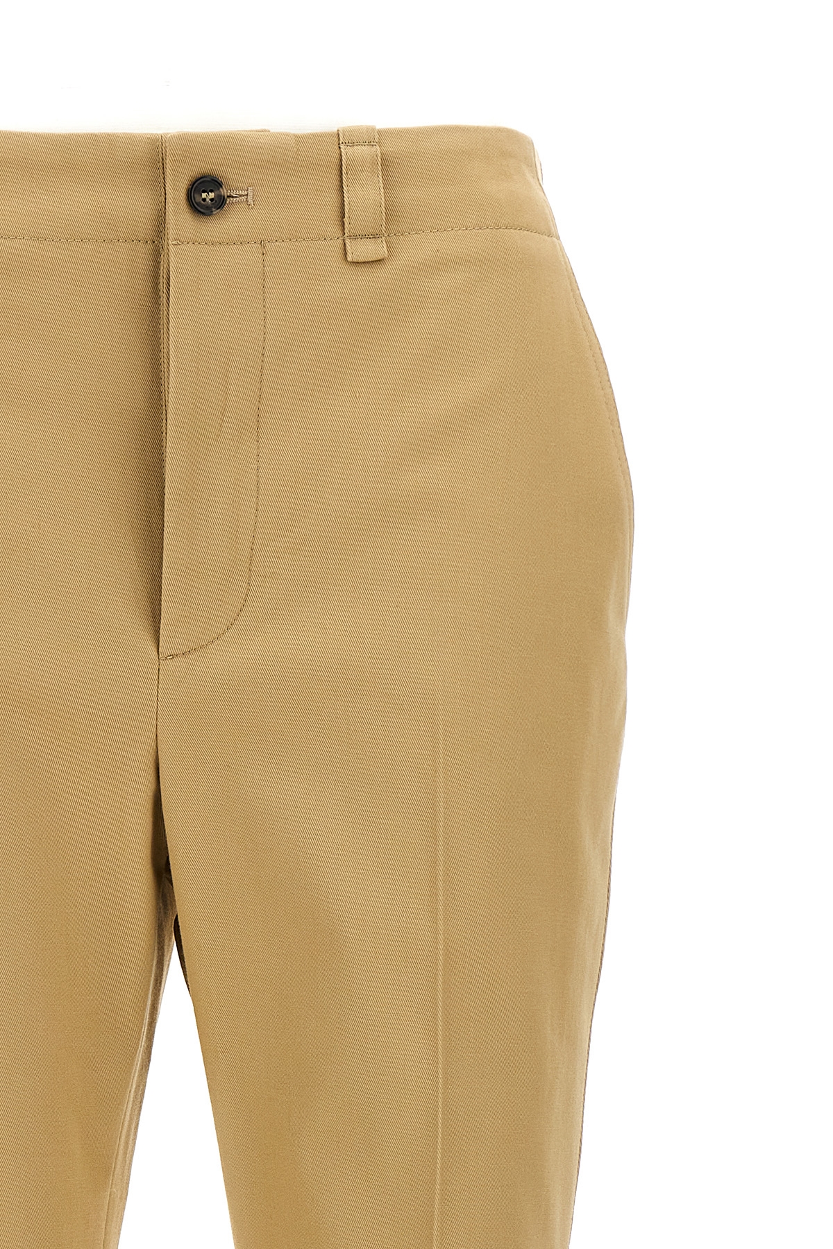 Cotton drill trousers, button closure, pockets, leg with stretched crease.