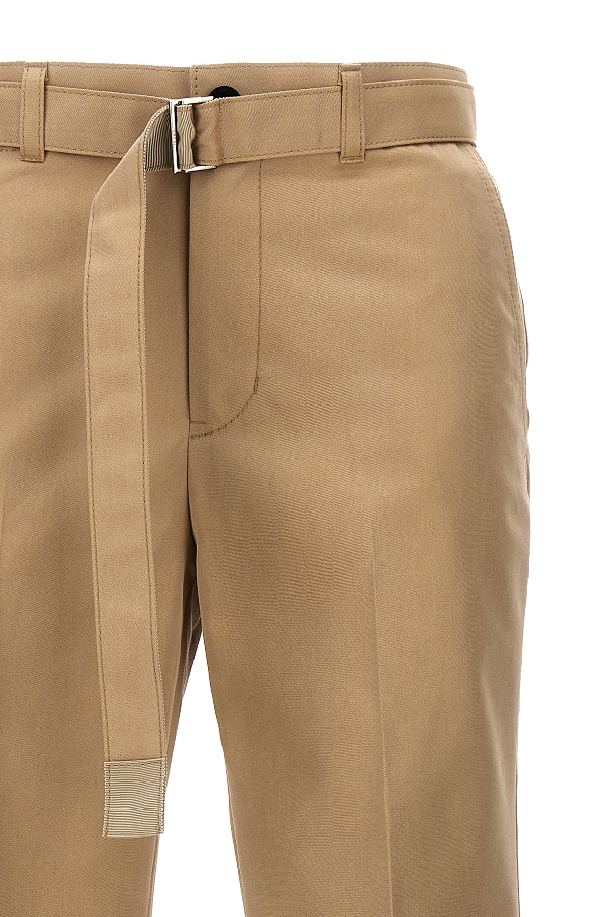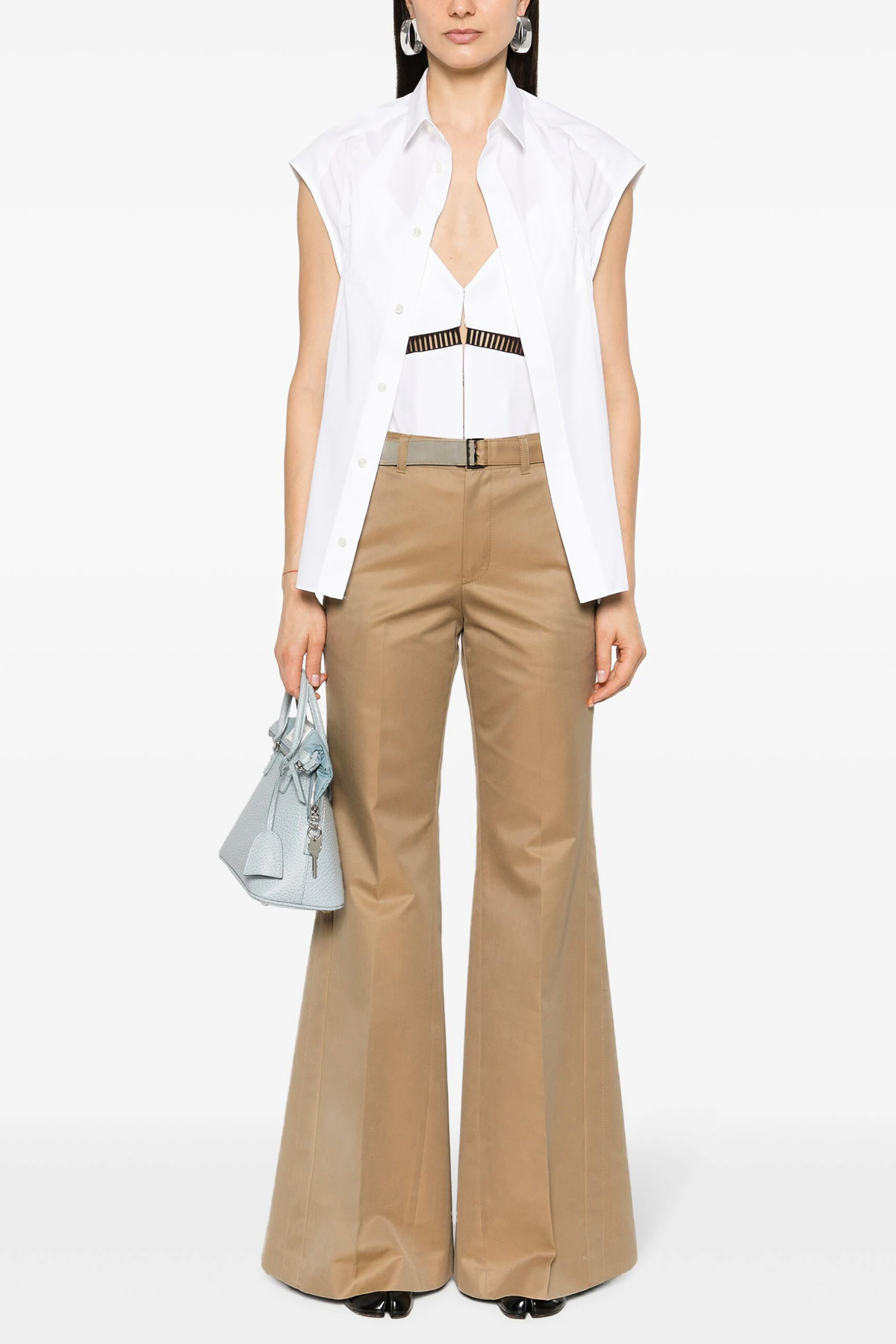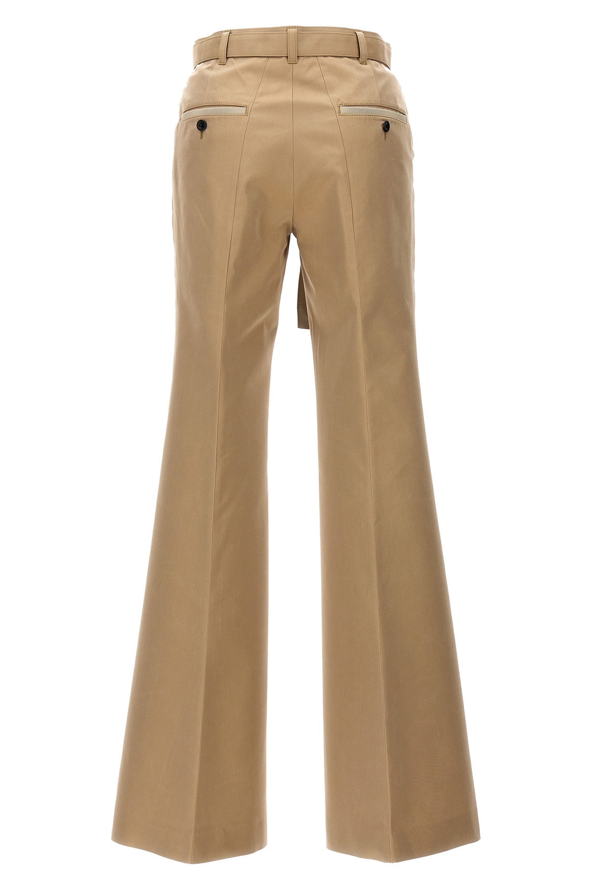 Cotton blend gabardine trousers with flared leg, zip and button closure, matching belt, pockets.