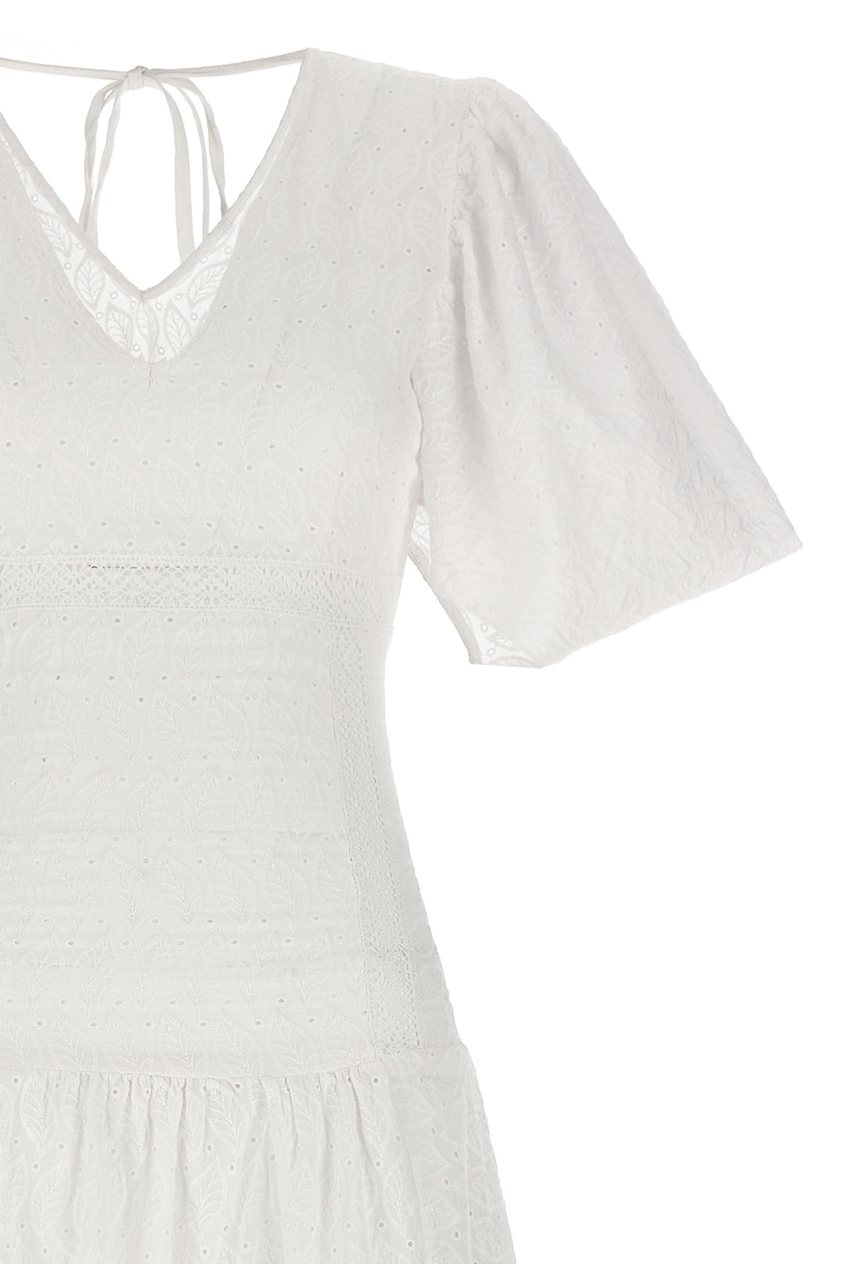 'Rosellina' dress in broderie cotton with V-neck front and back, long sleeves with opening, wide side slits, pockets.