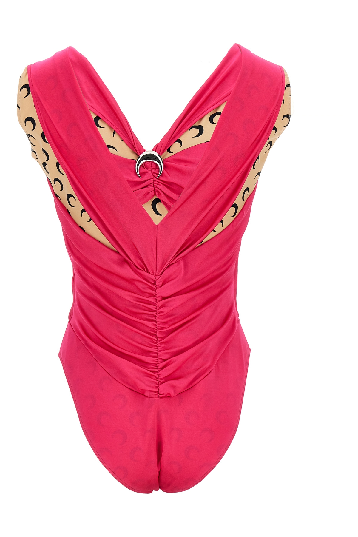 Bodysuit in patchwork fabrics with all-over logo print and coated effect. Sleeveless model with V-neck and moon-shaped brooch detail.