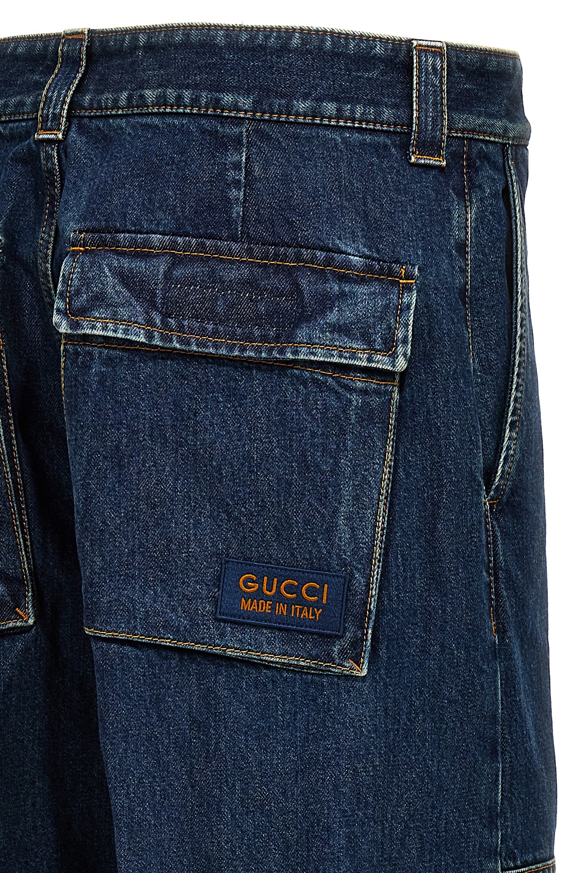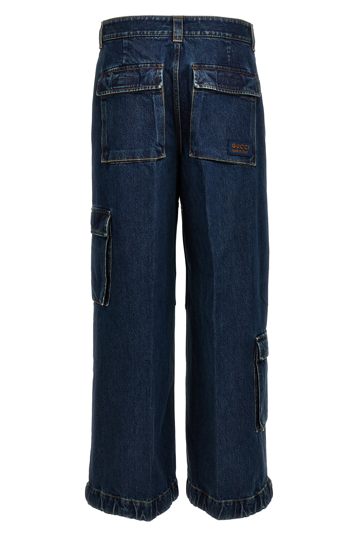Cotton denim cargo jeans with side, back and front pockets. Very wide leg.