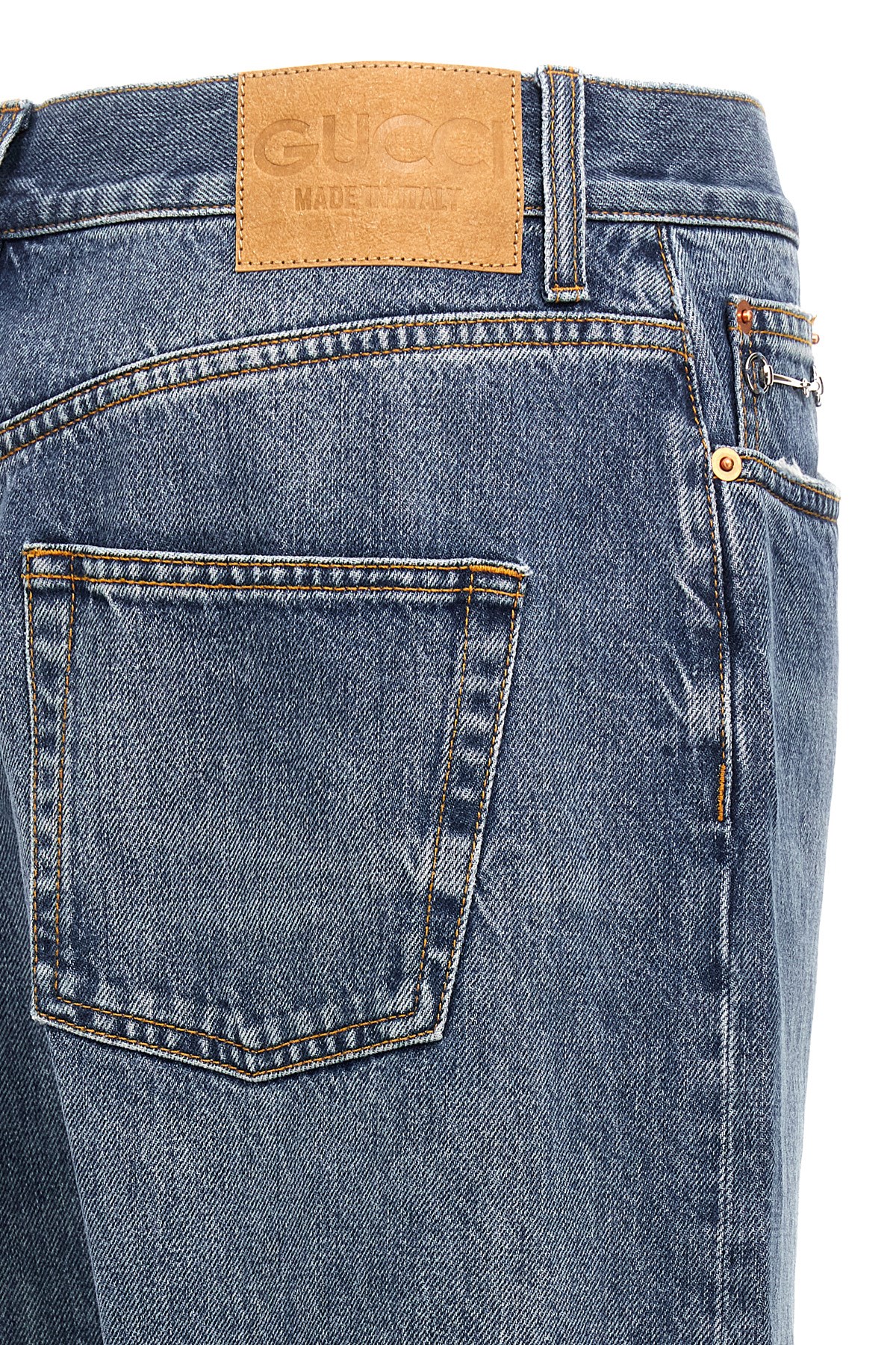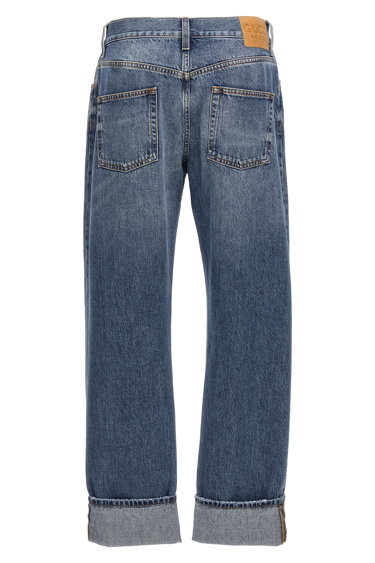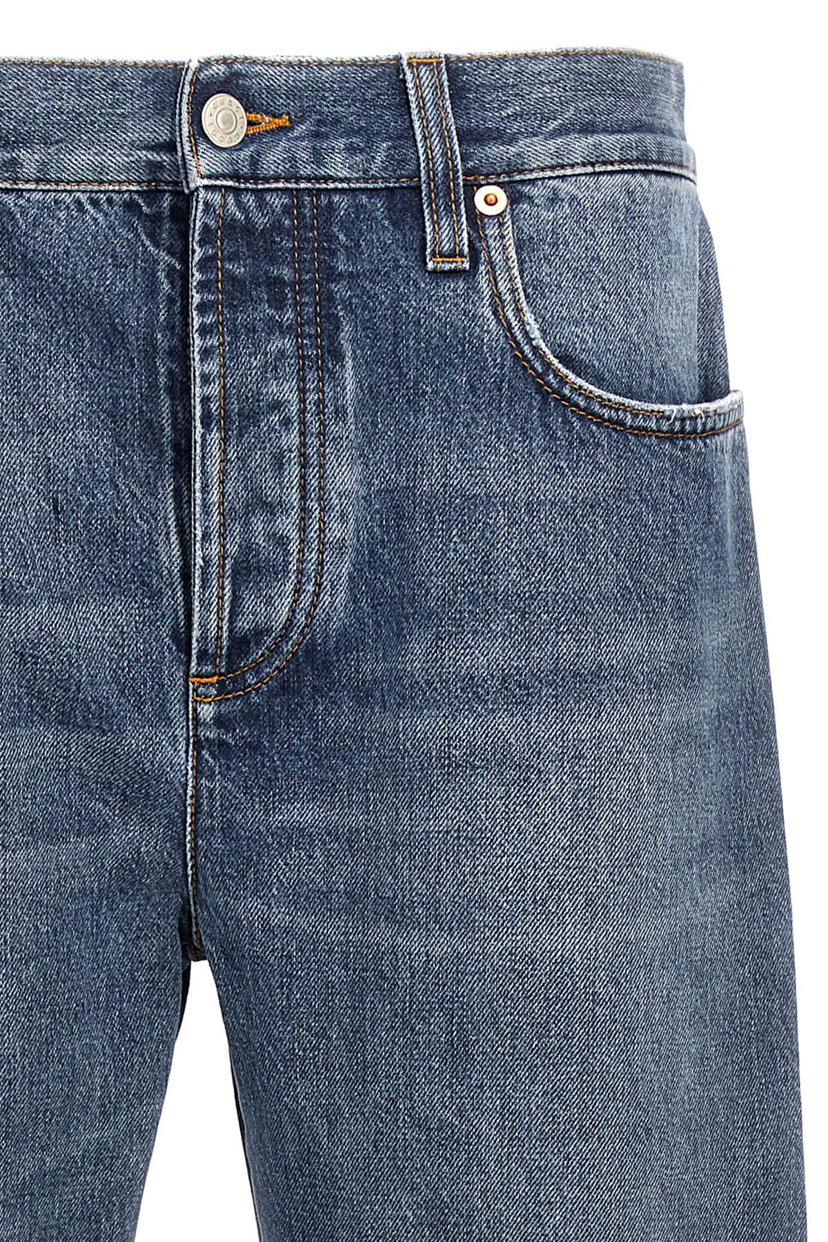 Cotton denim jeans with used-effect details, metal 'Morsetto' application, button closure, five pockets, turned-up hem.