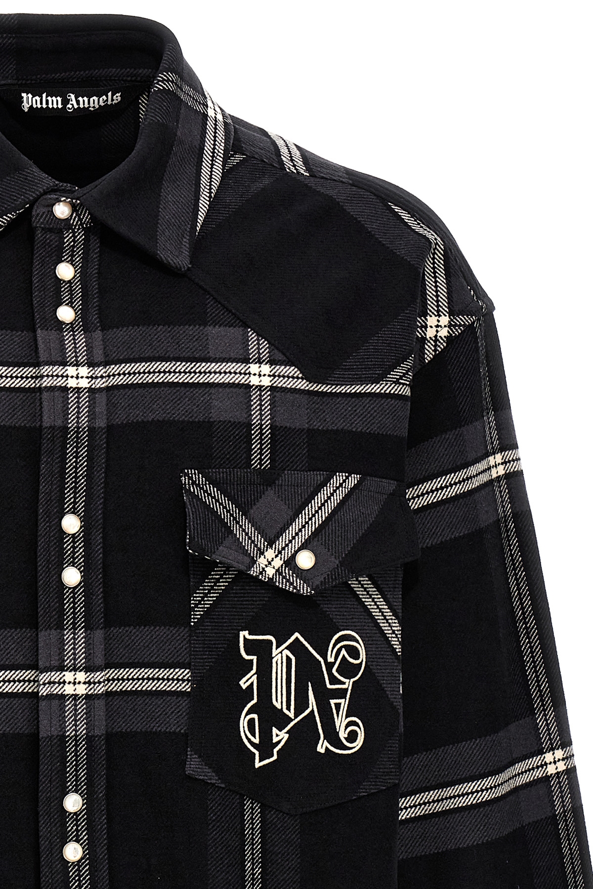 'Monogram Check' check-print cotton flannel overshirt, logo embroidery, front pockets, long cuffed sleeves.