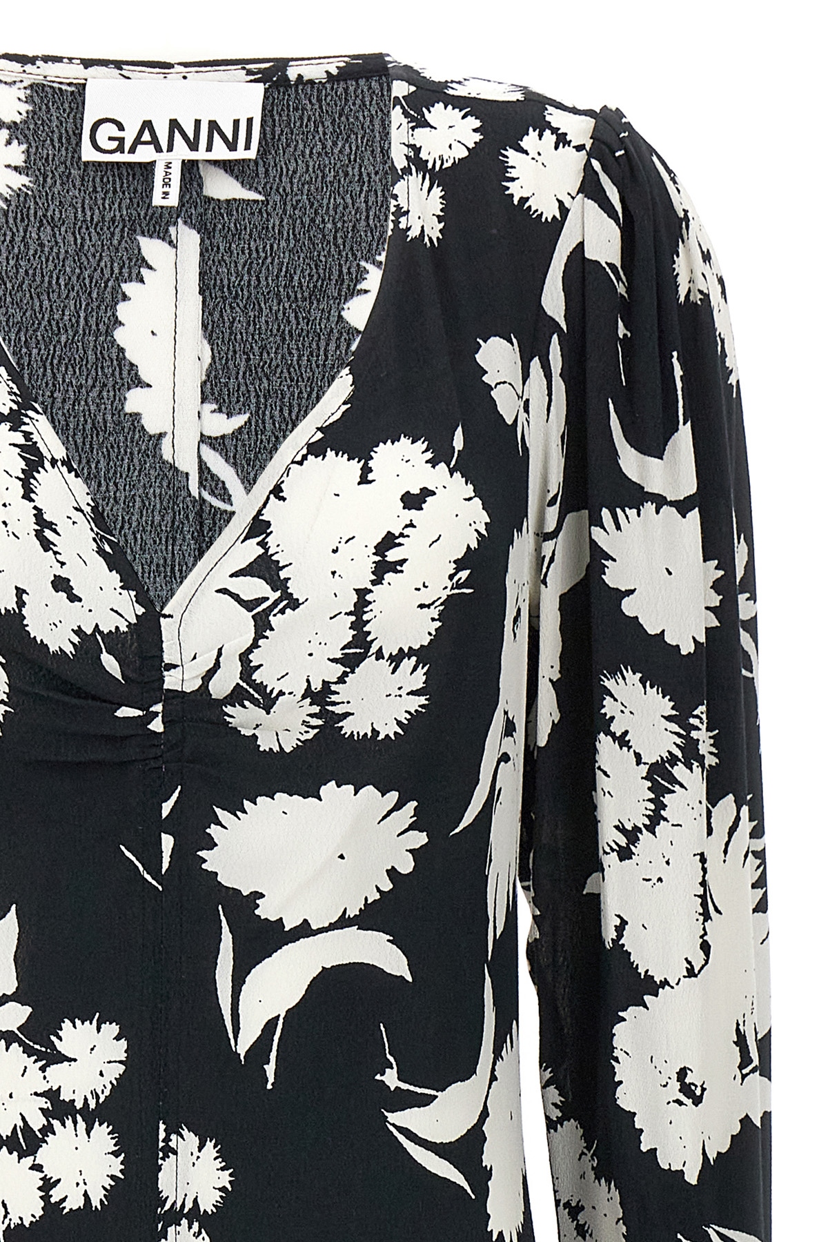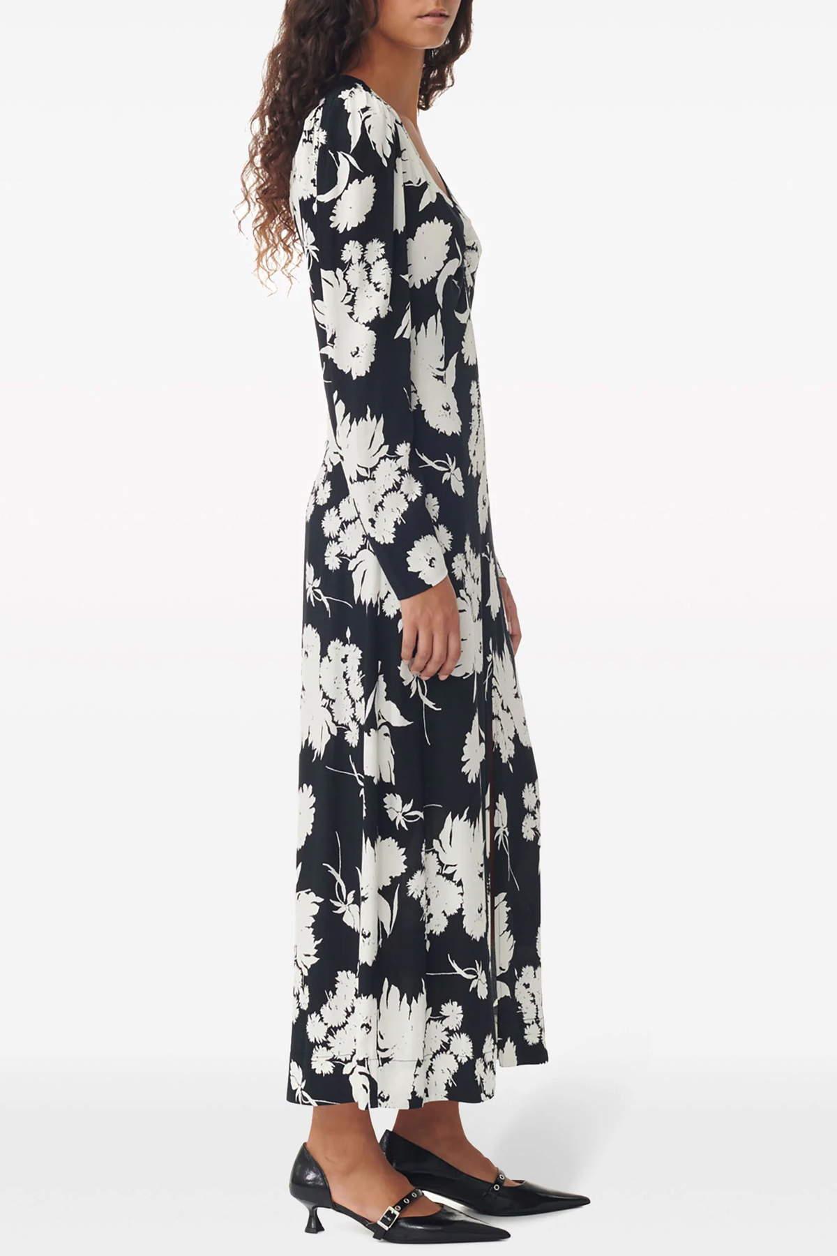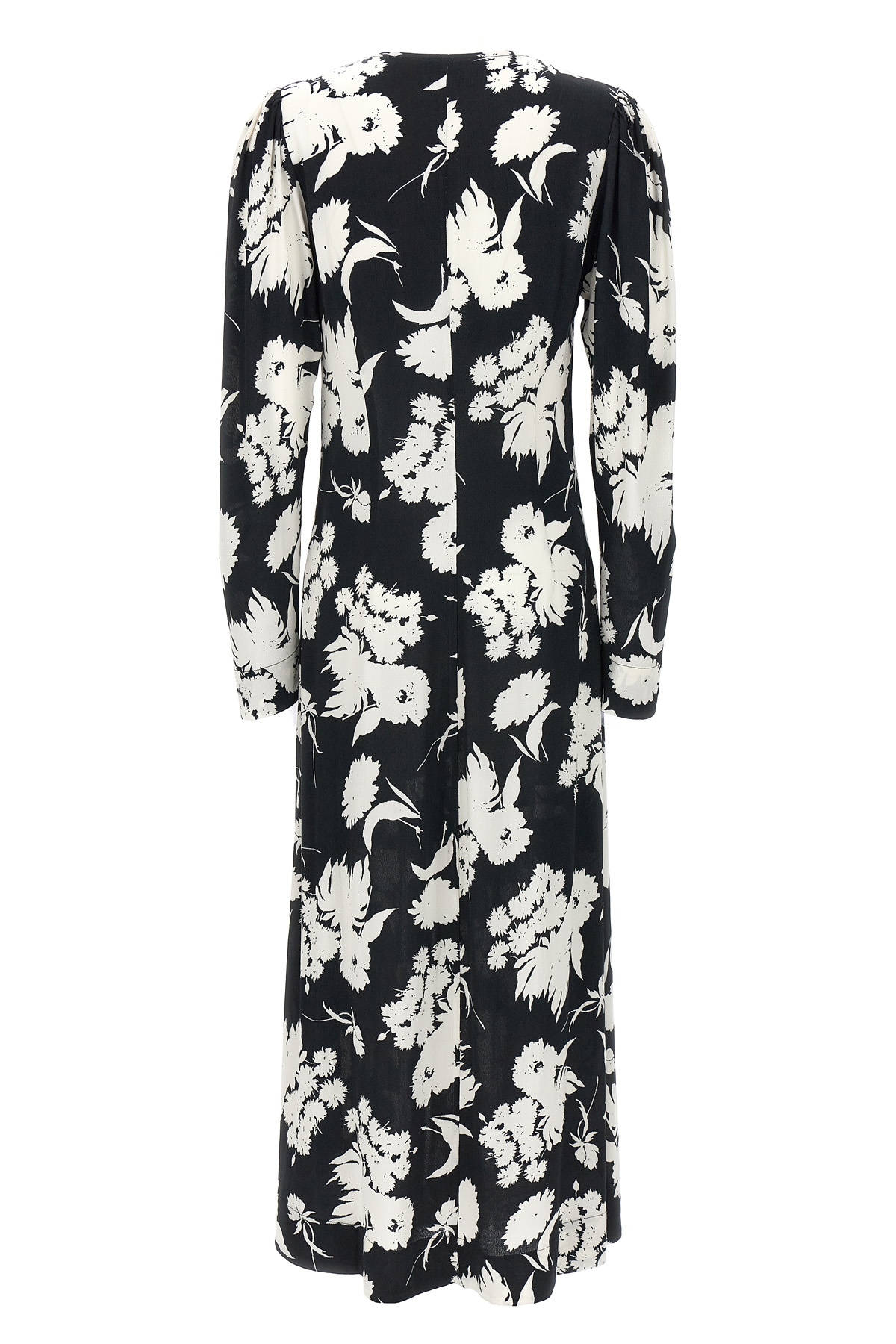 Floral print viscose dress, V-neck, long sleeves, side zip closure, front central split.