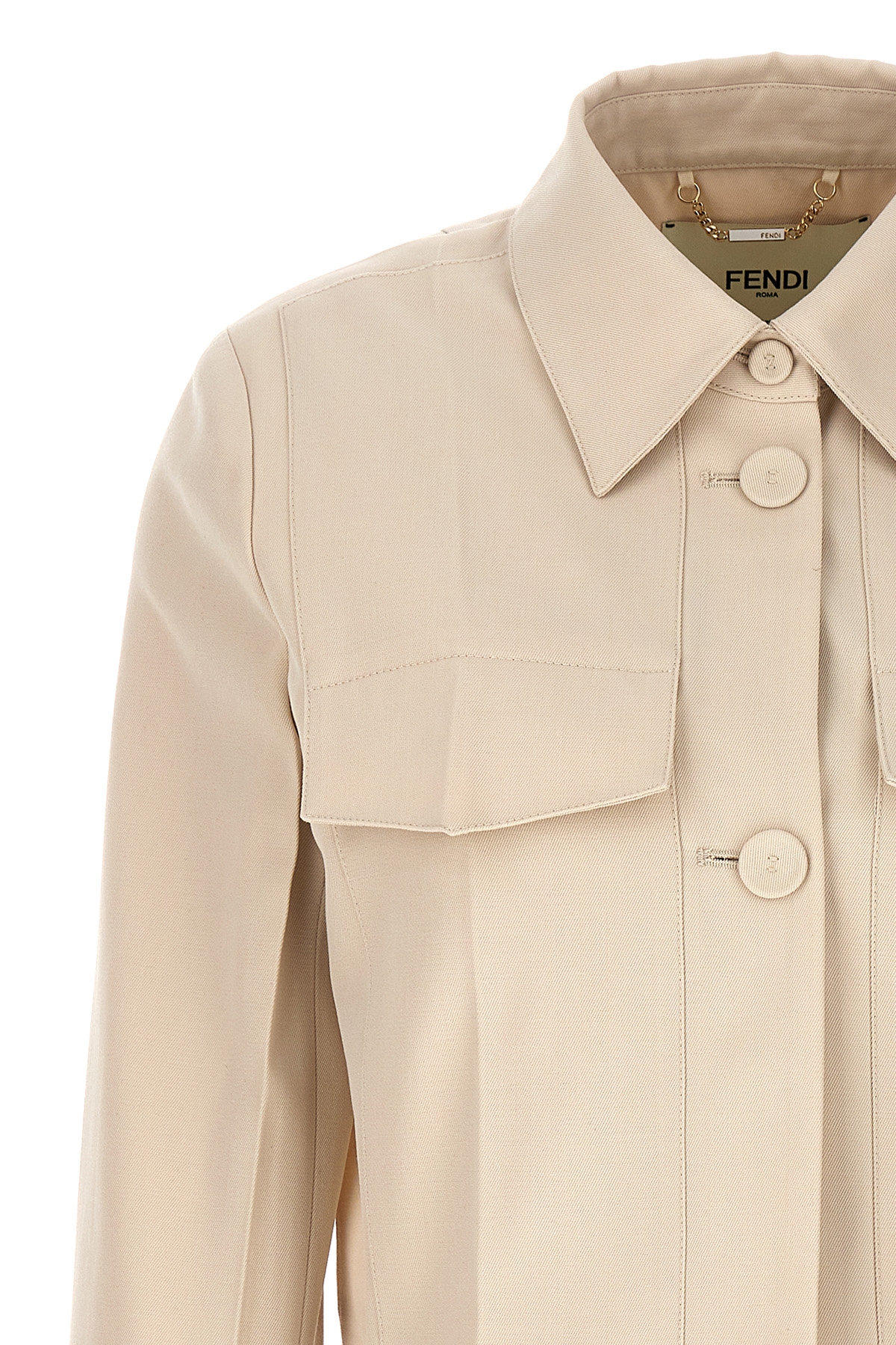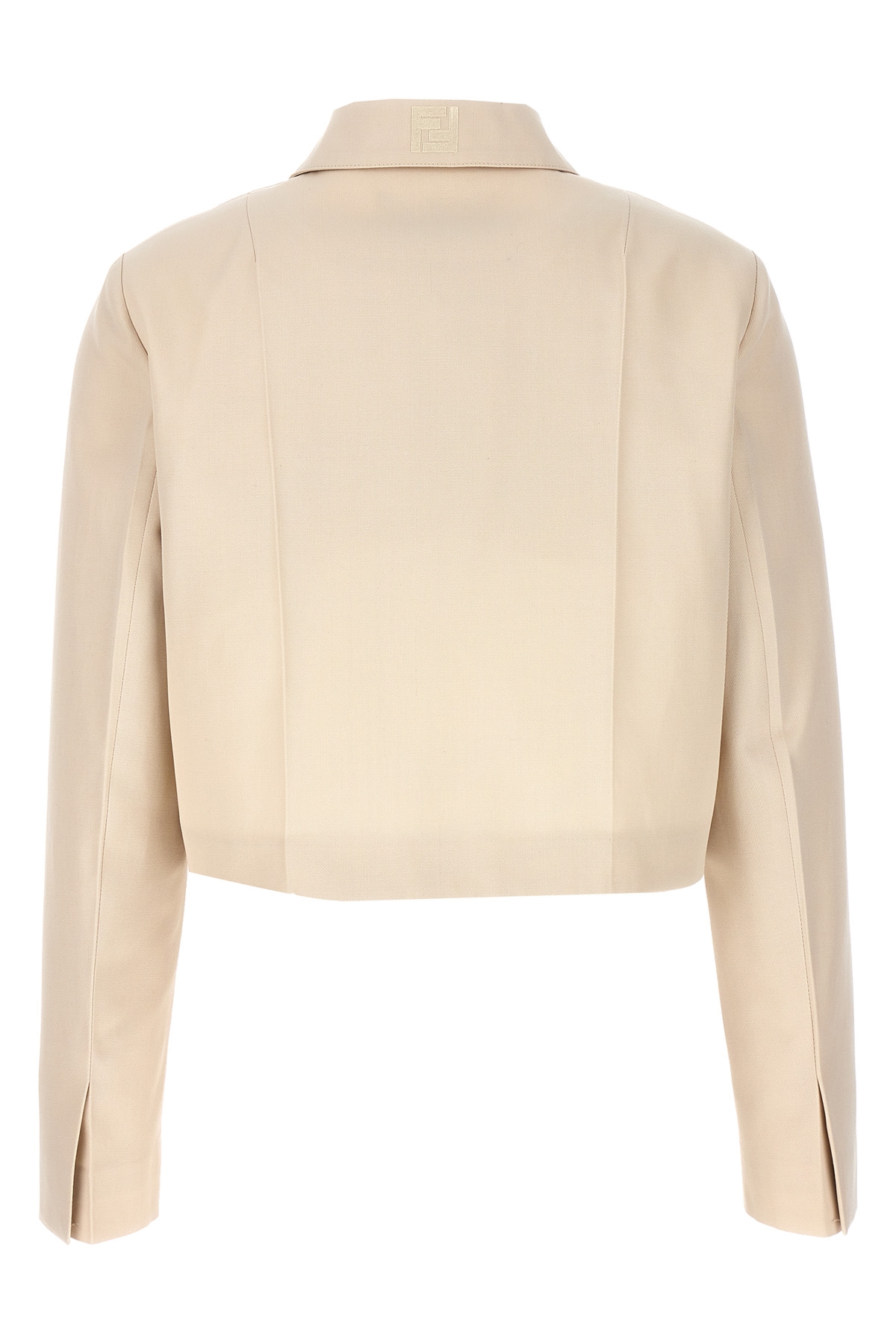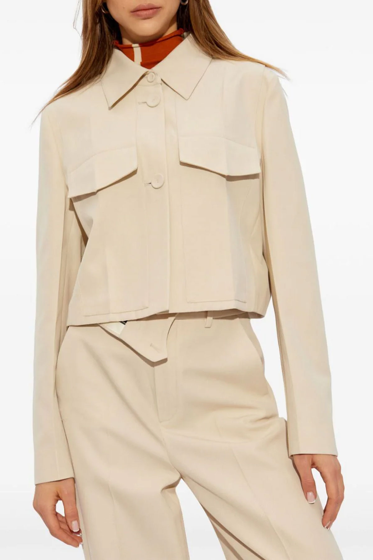 Tailored cropped jacket in wool and cotton gabardine with visible button closure, chest patch pockets, long sleeves.
