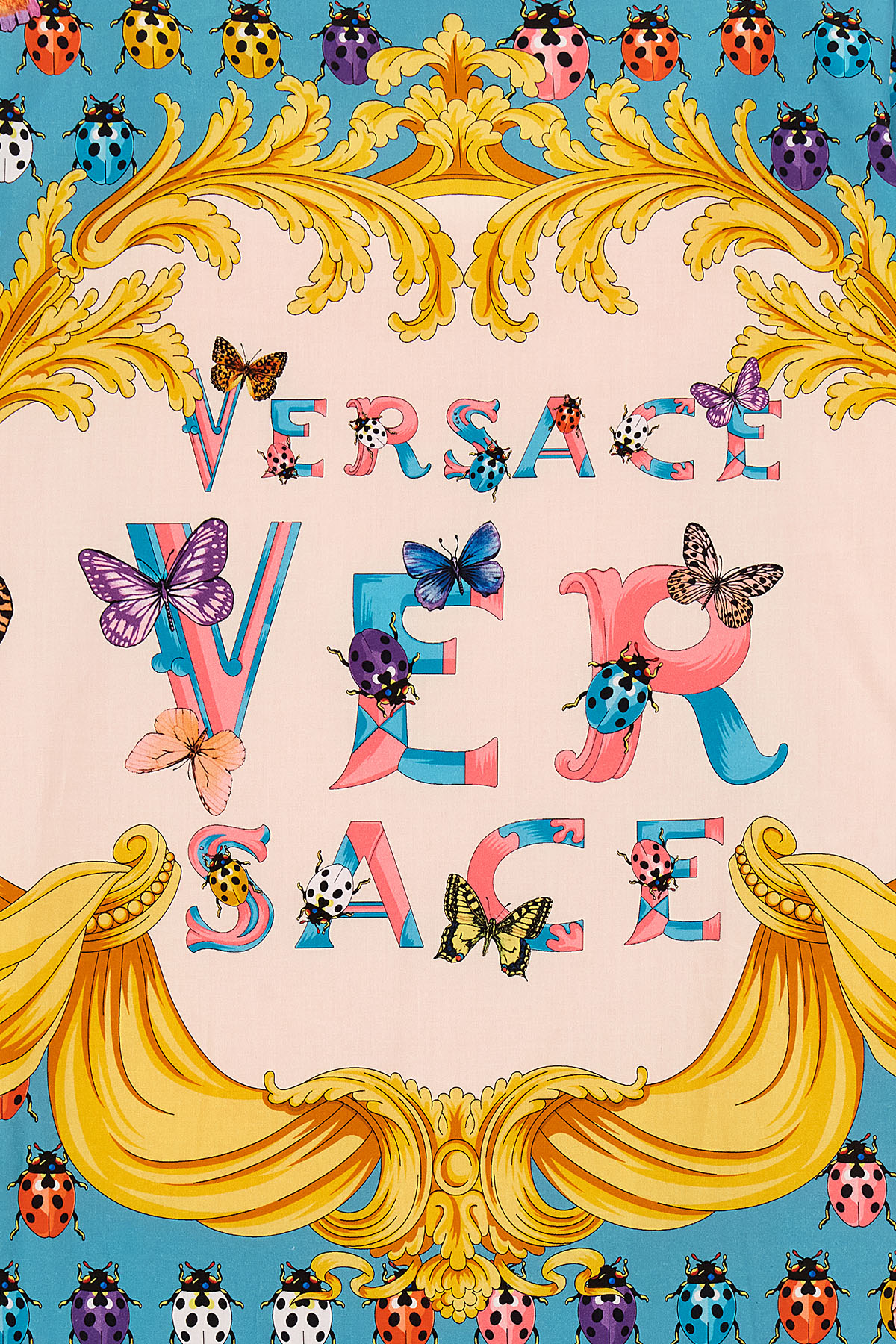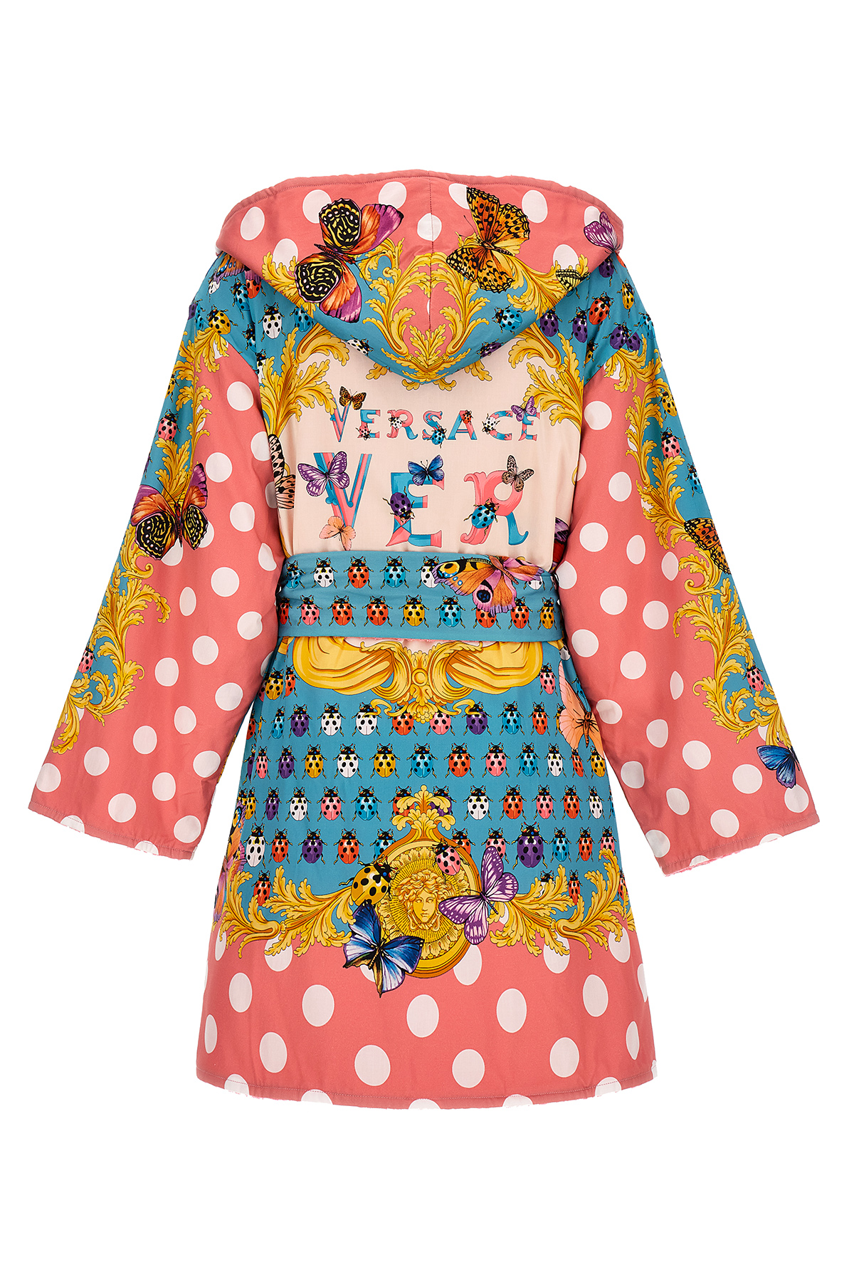 La Vacanza short cotton terry cloth capsule bathrobe with 'Heritage Butterflies & Ladybugs' print, 'Versace Allover' pattern on the inside, features a hood, pockets and a belt at the waist.