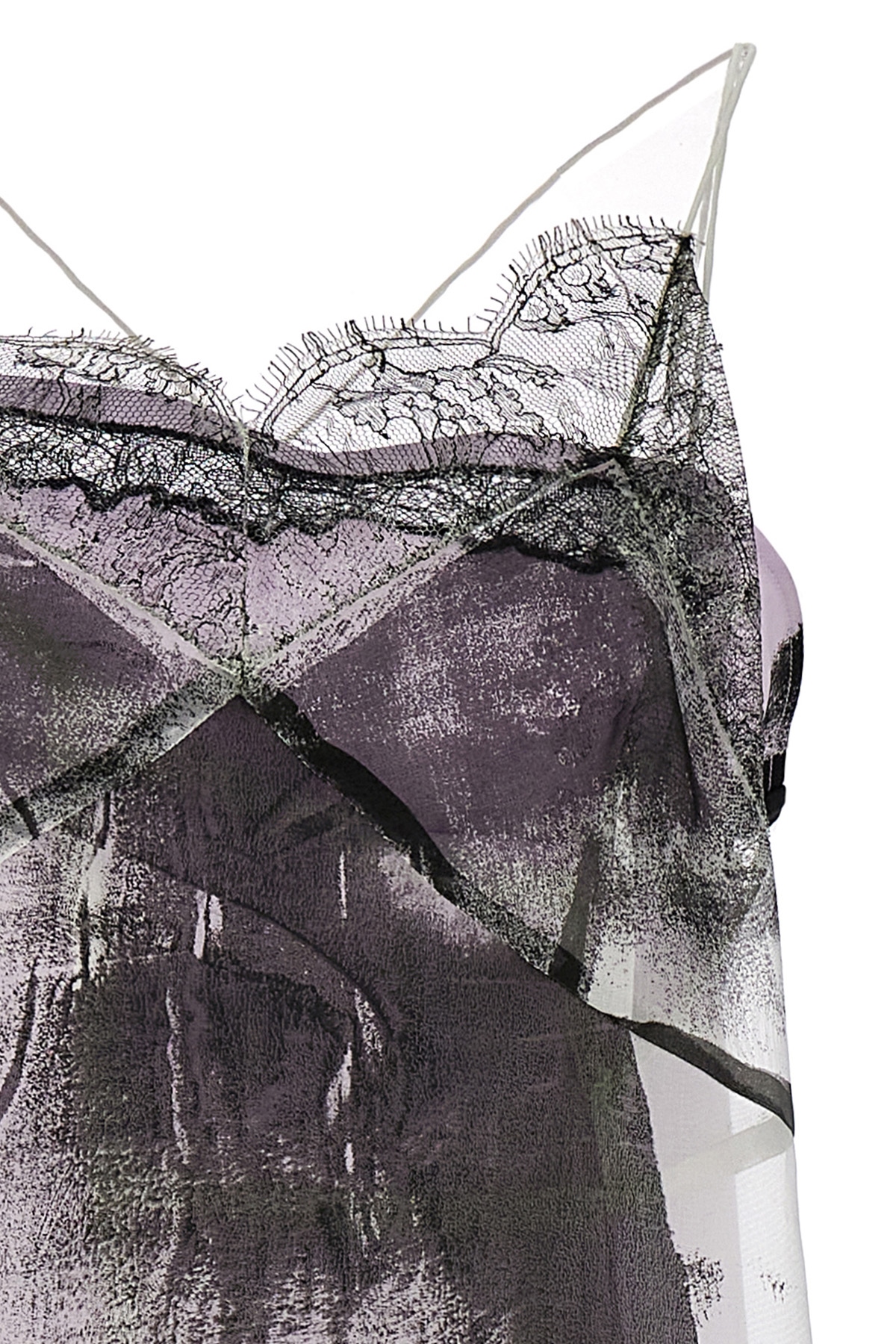 'freeze-frame' midi dress in silk and viscose-cupro printed with freeze frame technique, lace lingerie details and crossed back, thin straps.