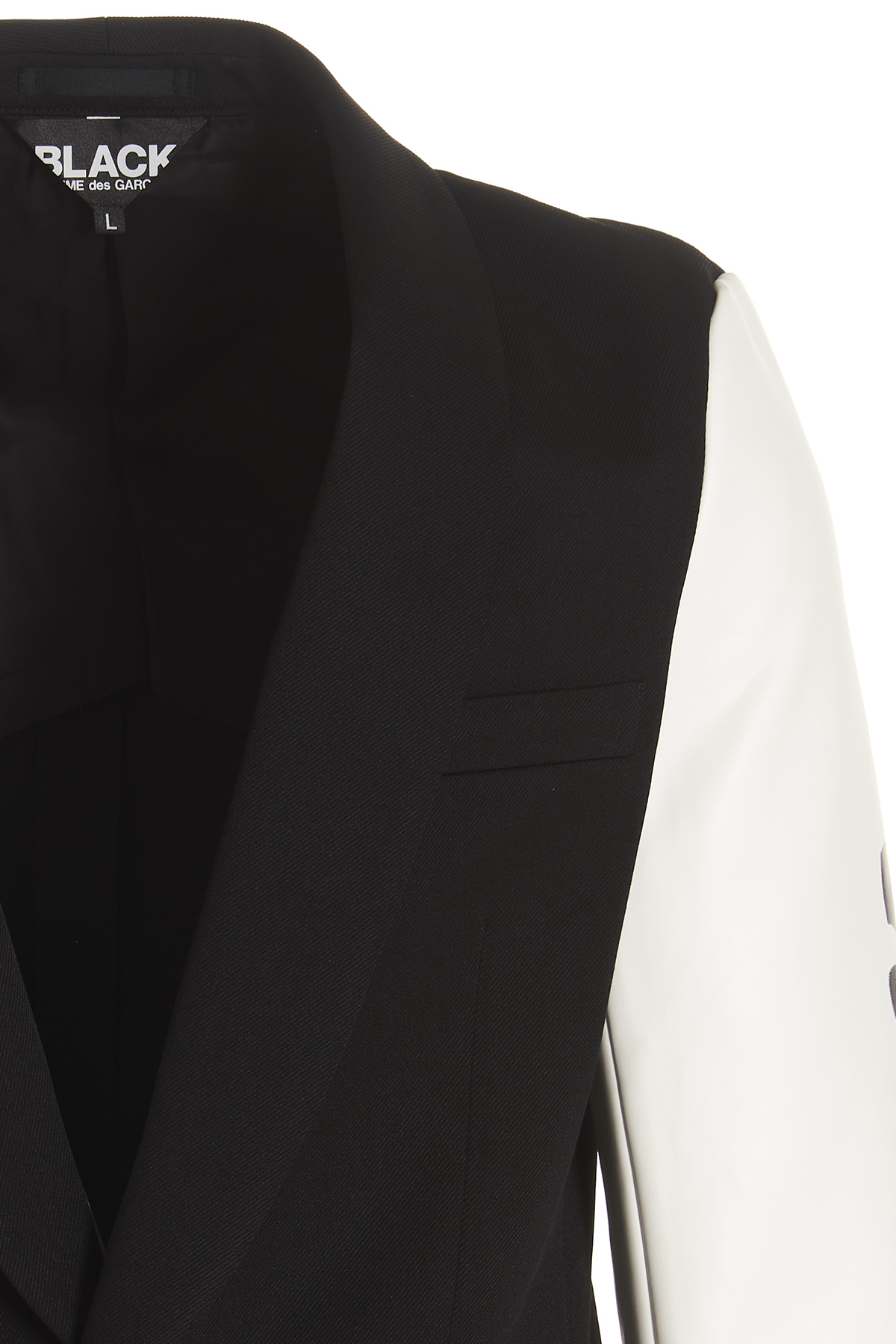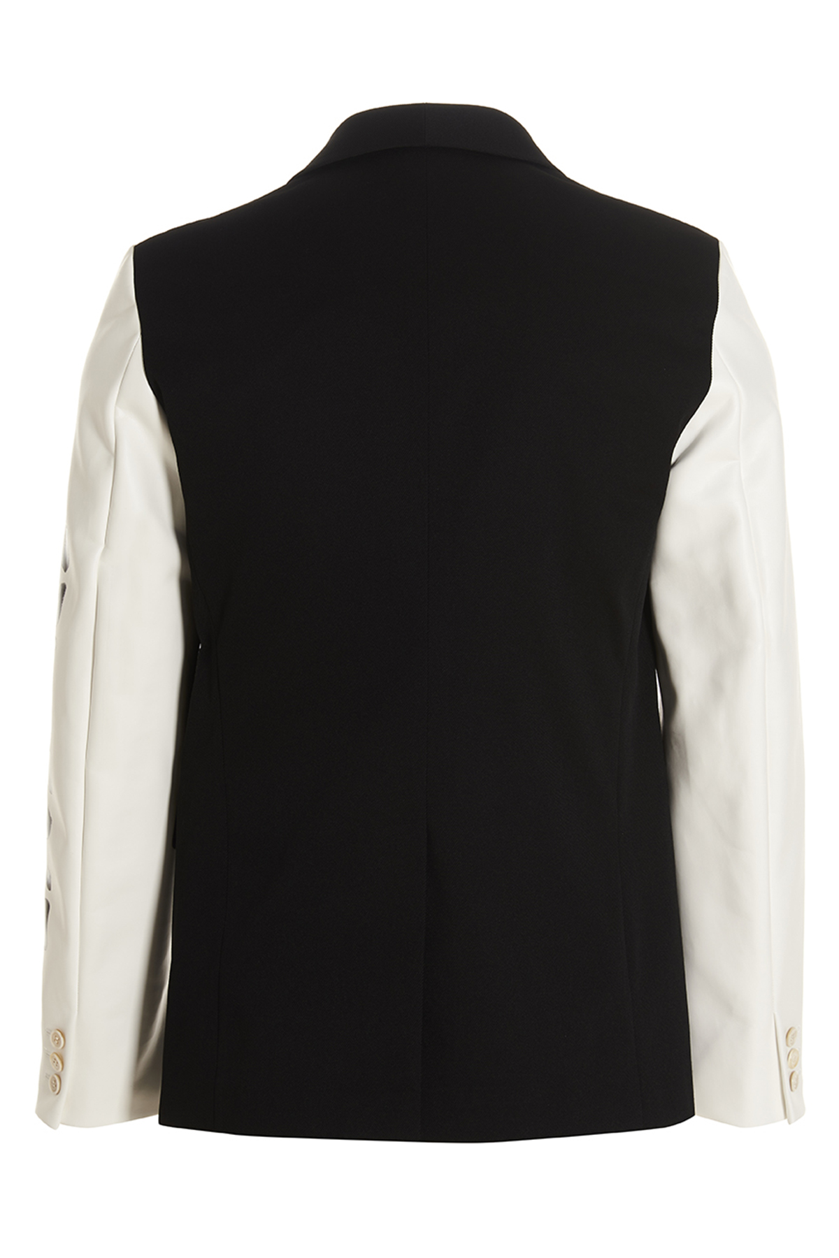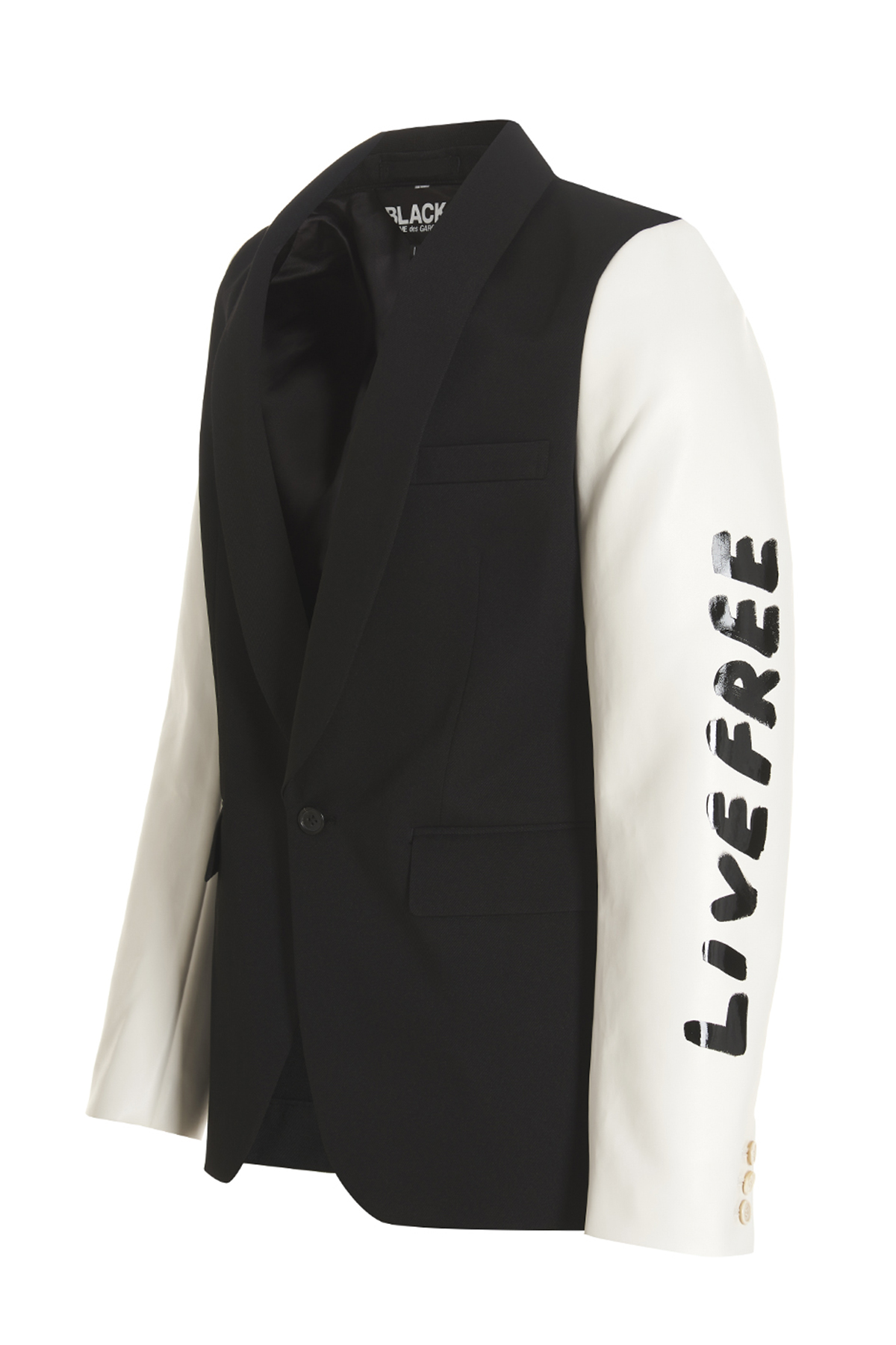 True heart strong mind' two-material blazer jacket with printed eco leather sleeves and a single breast style.