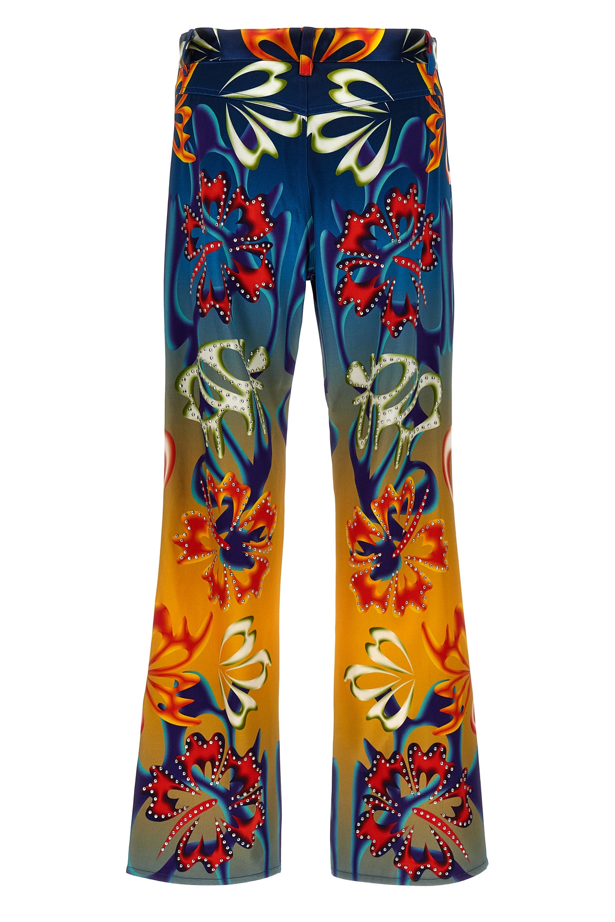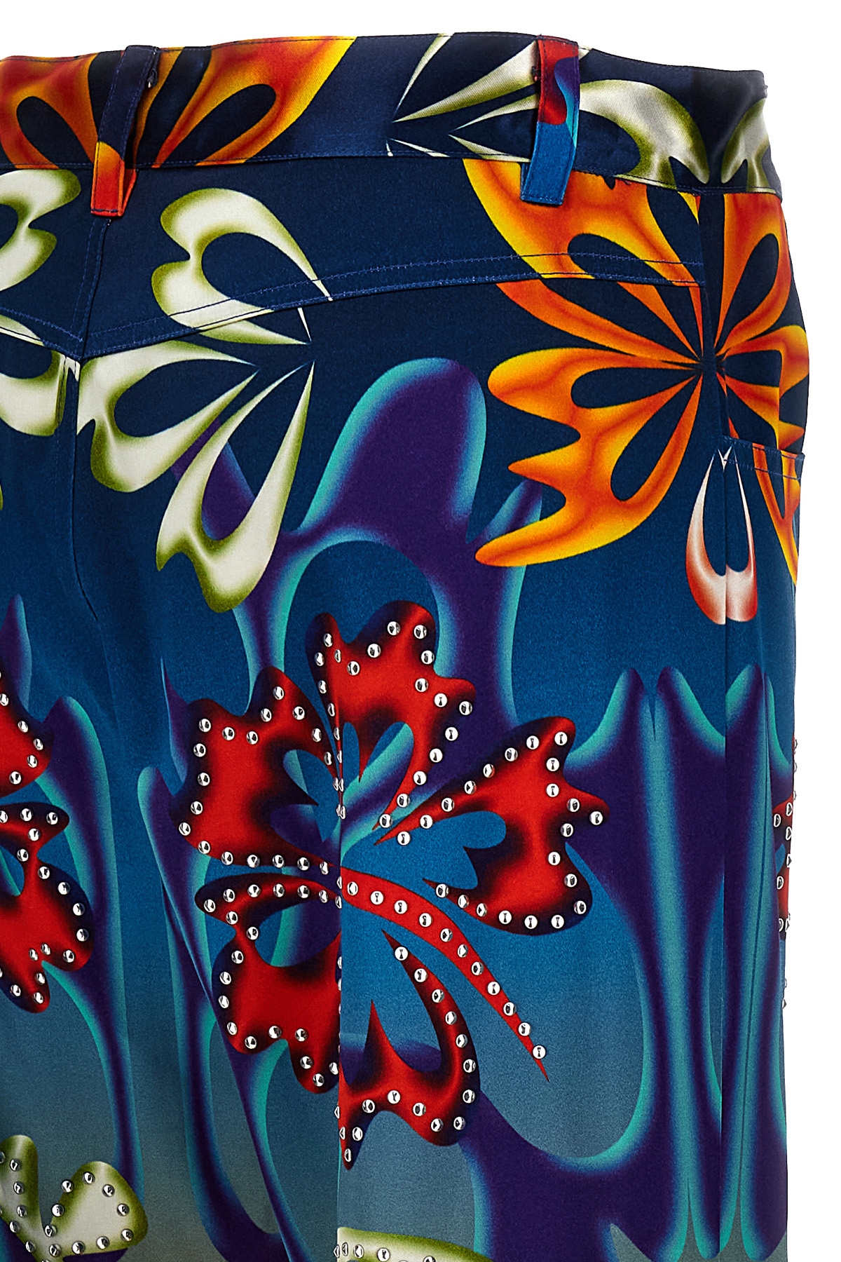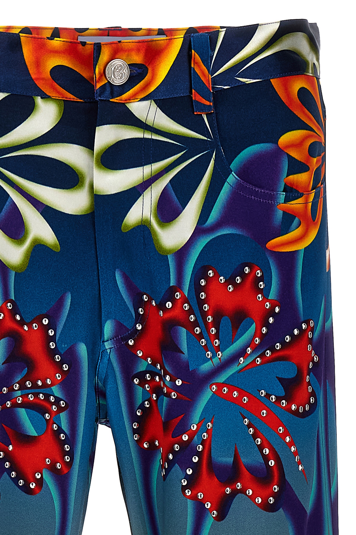 'Hibiscus' printed satin trousers, stud application, zip and button closure, pockets.