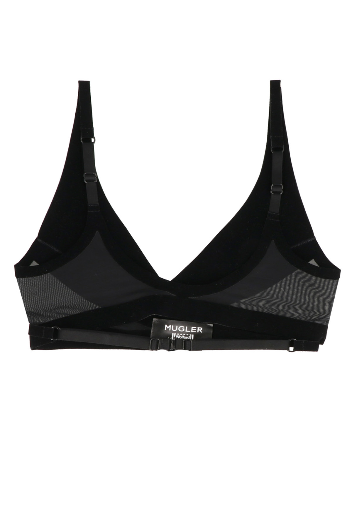 Wolford x Mugler 'Flock Shaping’ bra in mesh and velvet fabric, adjustable.