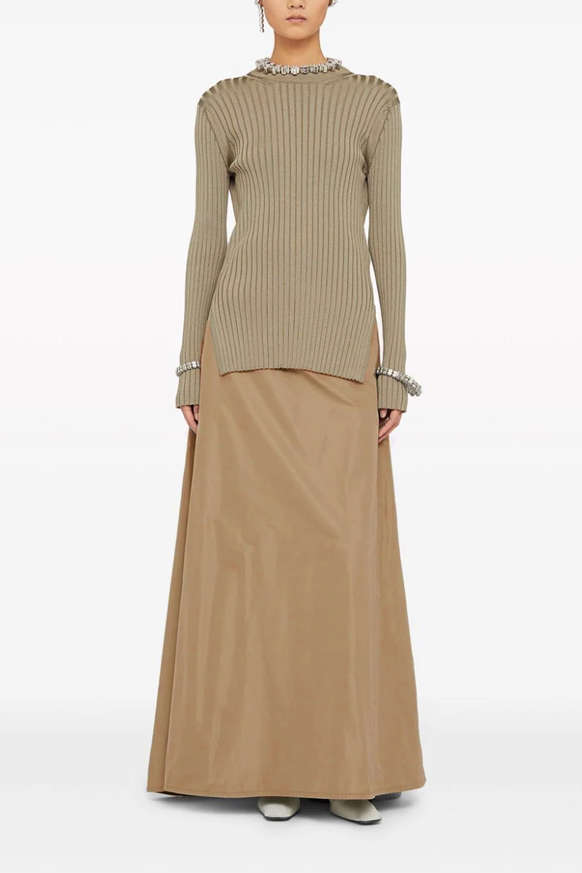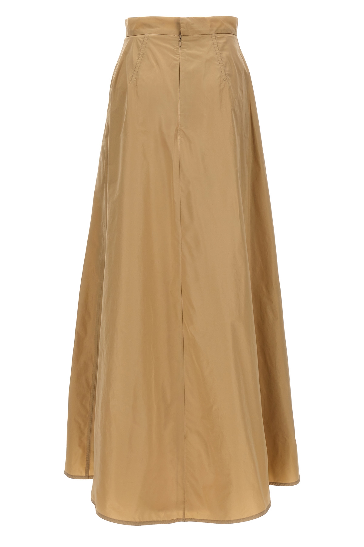 Long skirt in technical fabric, flared, high waist with pockets, zip hook and back button closure.