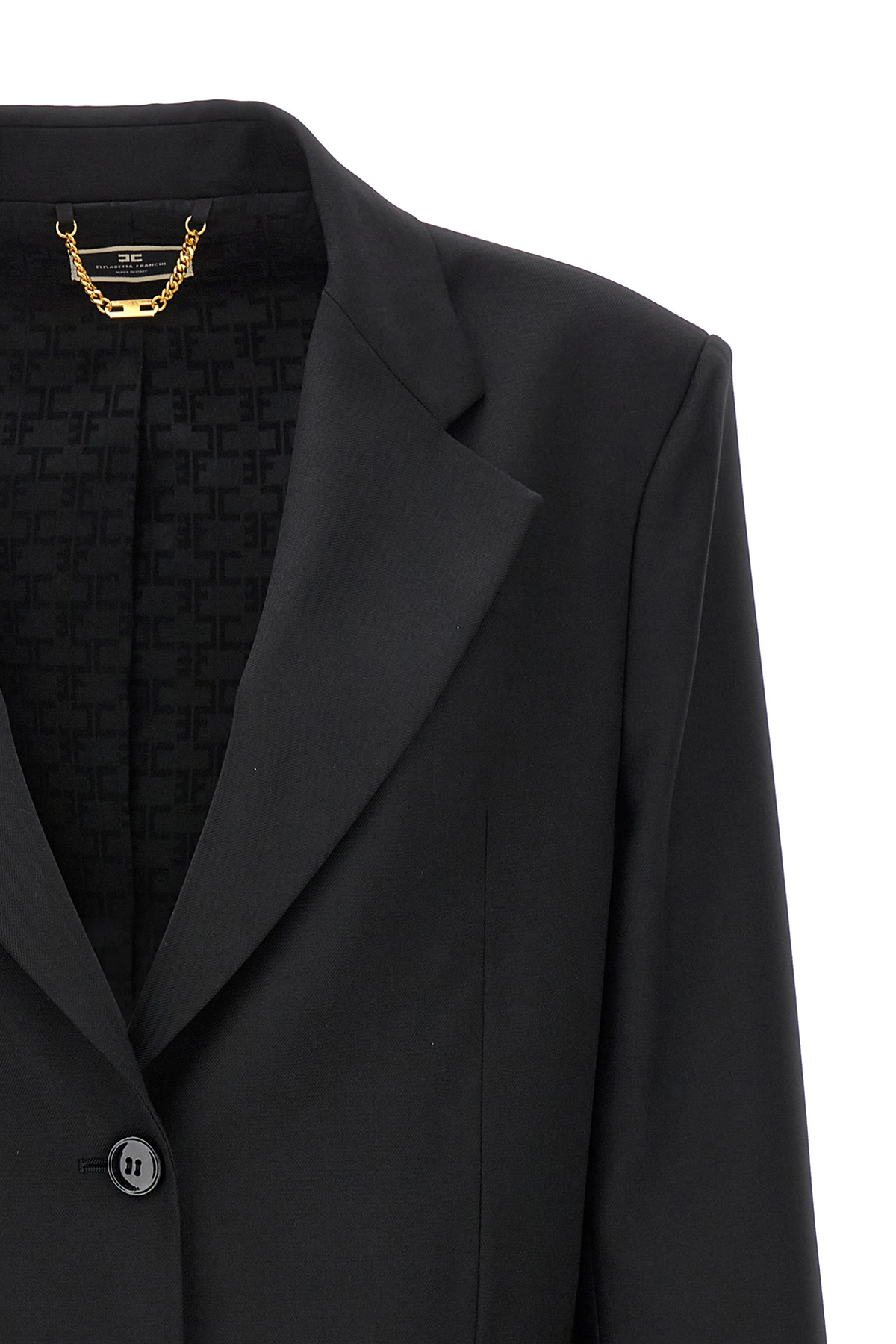 Double-breasted wool blazer with button closure, pockets, padded shoulders, long sleeves, back split.