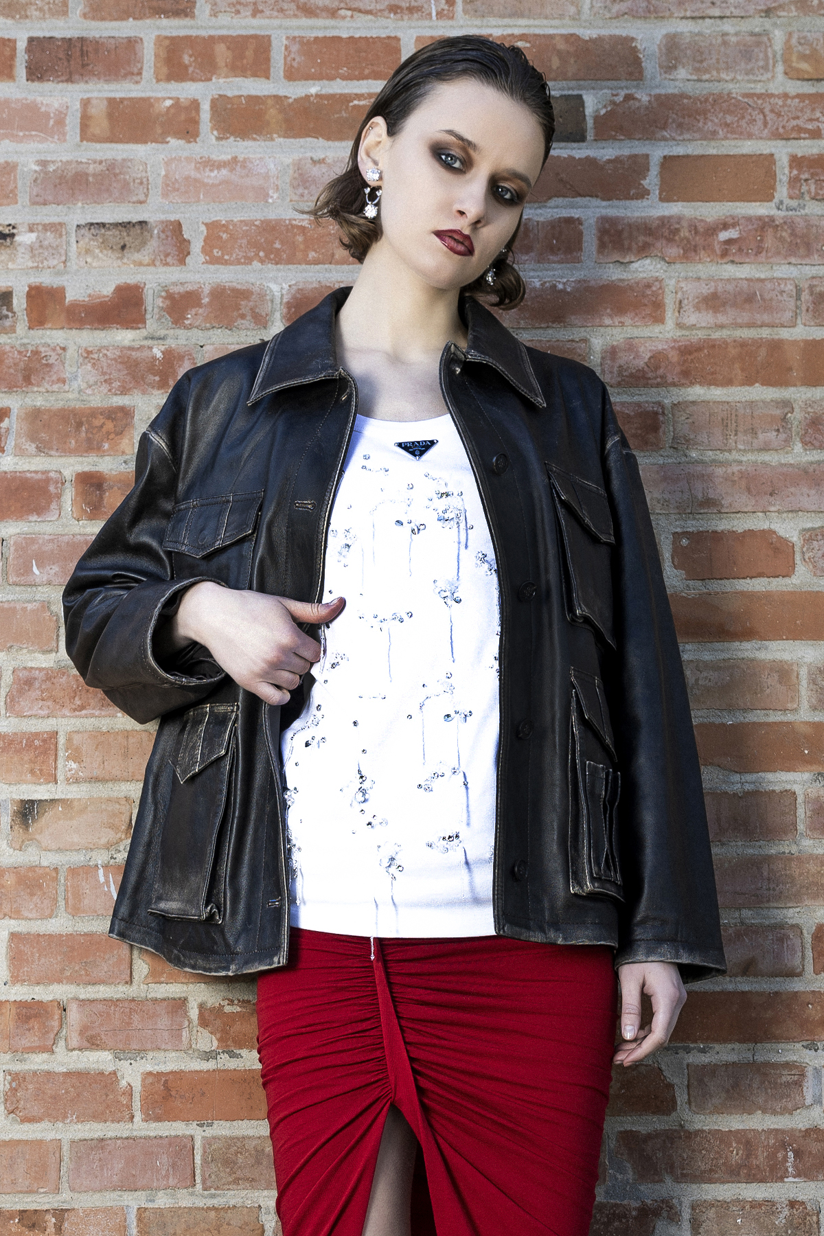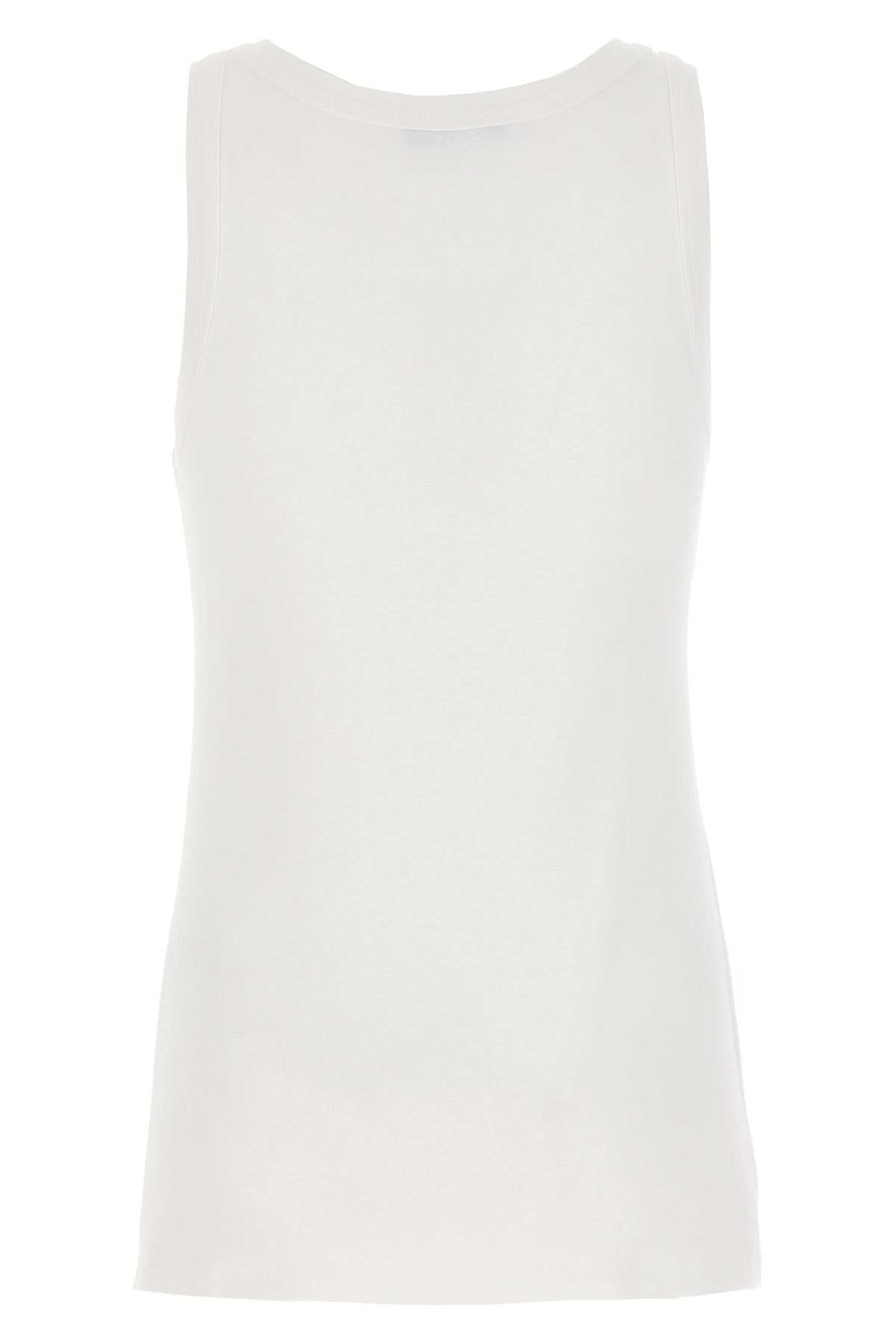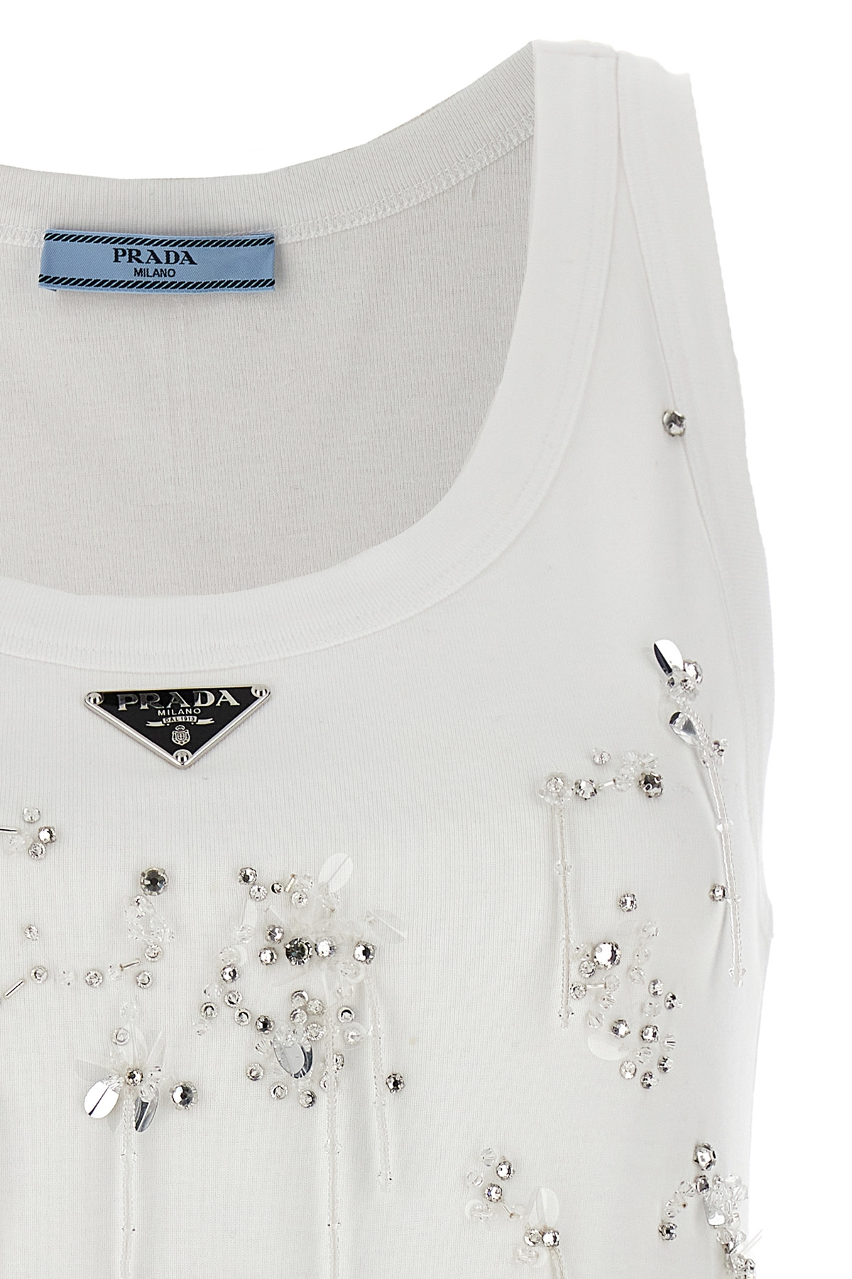 Cotton top with crystal beads application, triangle logo in enameled metal on the front, round neckline, sleeveless.