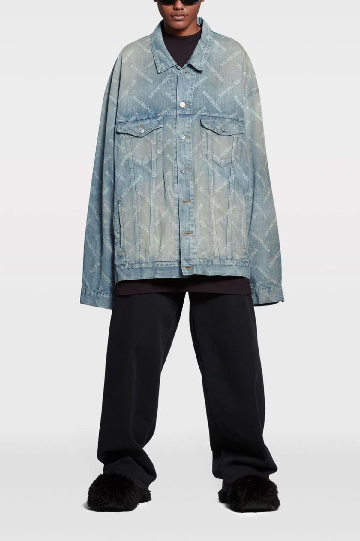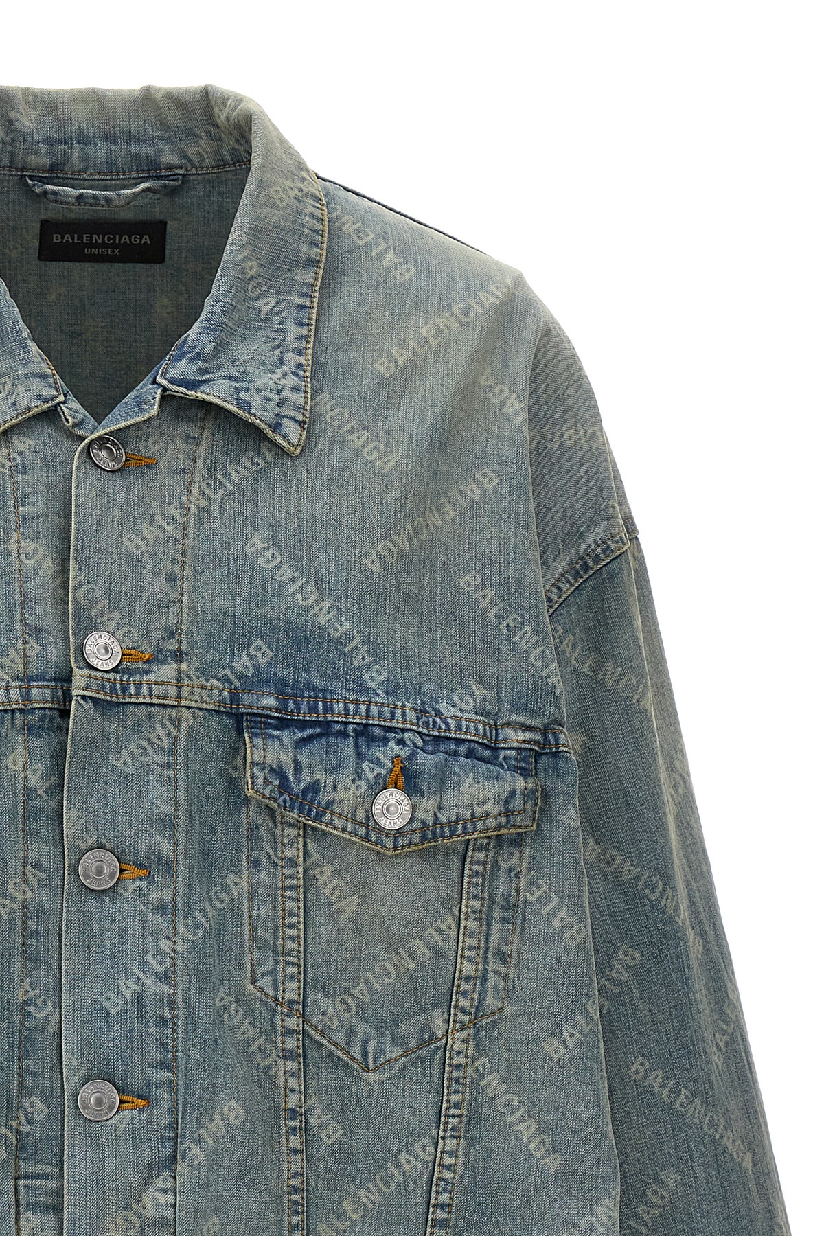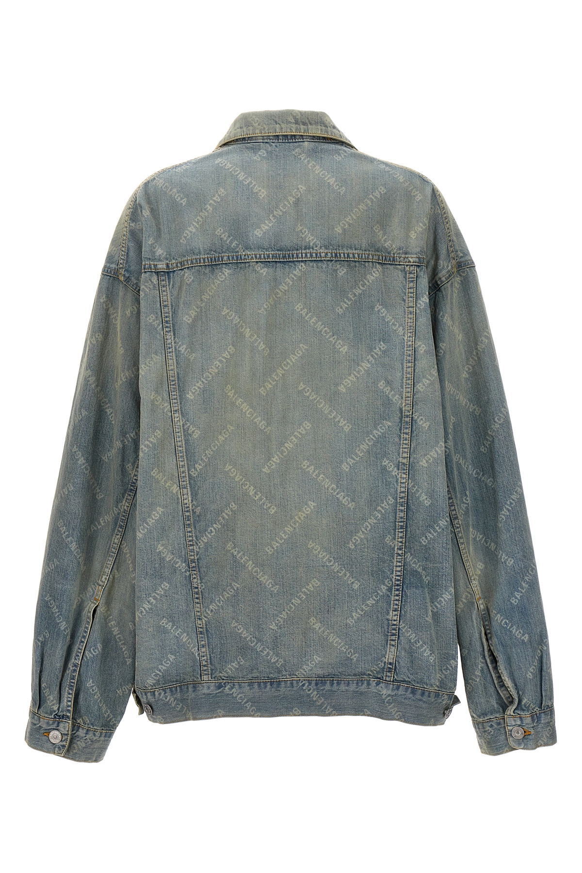 Japanese twisted denim jacket with 'Bal Diagonal Allover' logo print, button closure, pockets, long cuffed sleeves.