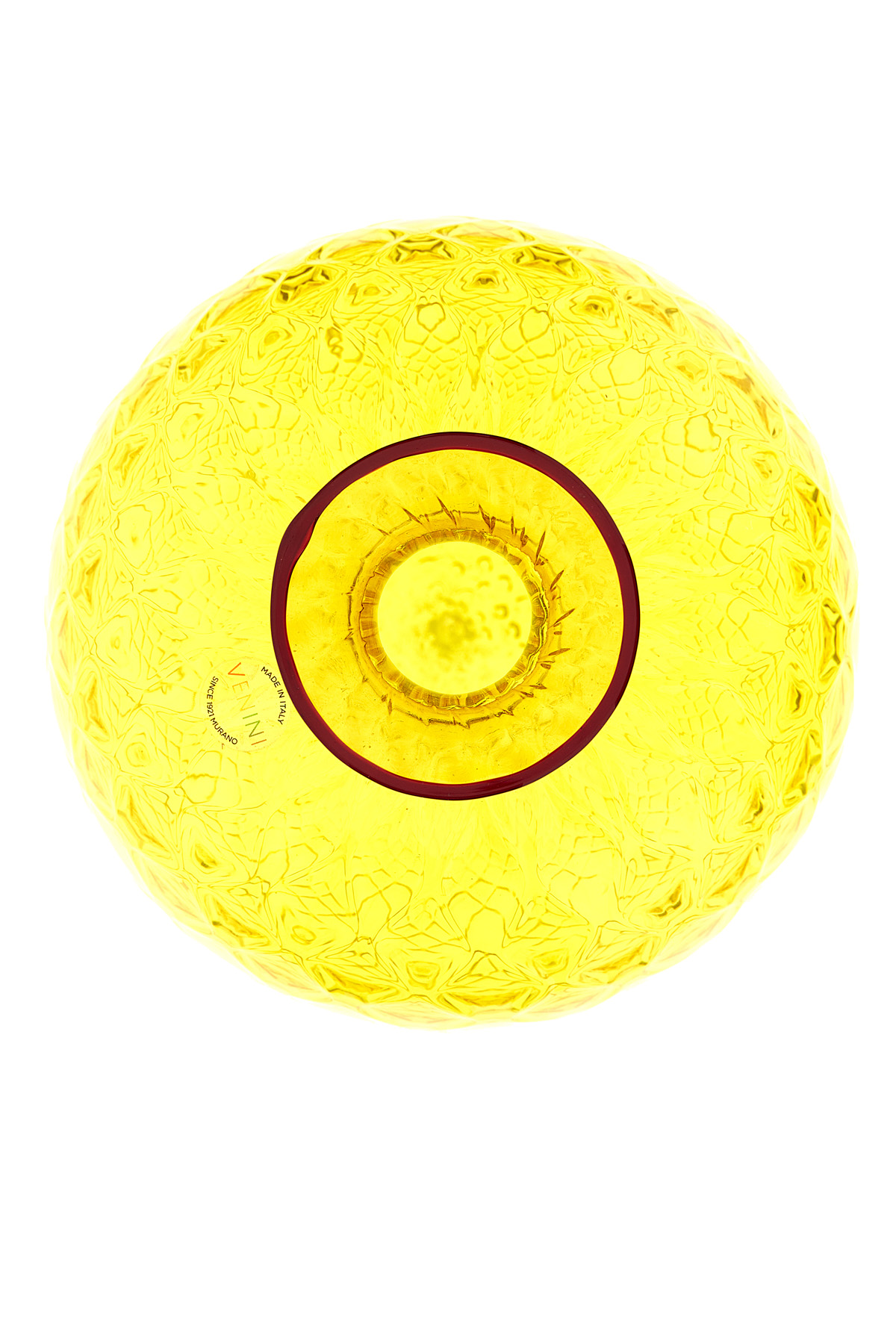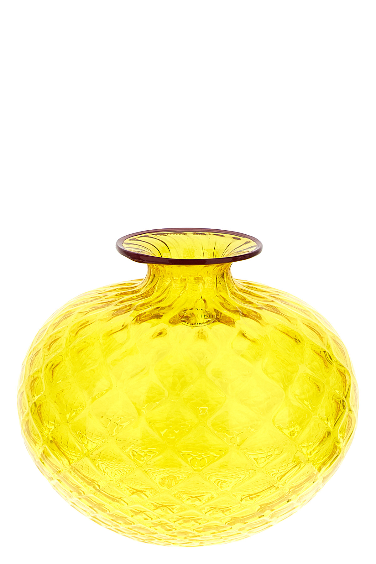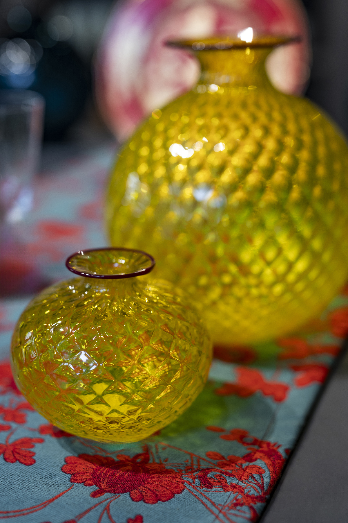 It looks soft, yet it is glass. The optical illusion of the VENINI Monofiori of 1970 is in its name: Balloton, the unique workmanship that recreates the matelasse effect on the surface. The work is handmade, blown into the characteristic metal mold and finished in the thin neck with a hot colored thread, which varies in color.
