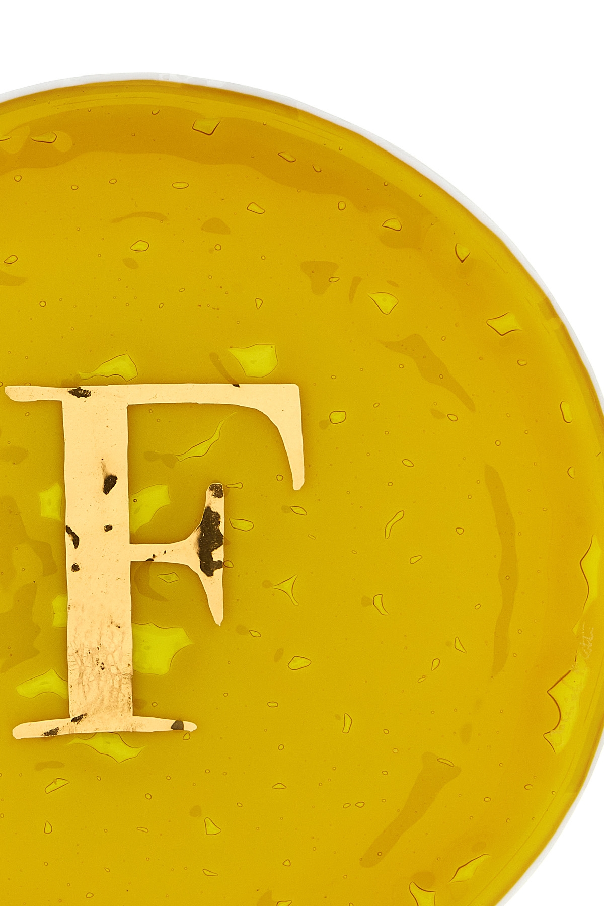 Glass plate with hand-painted letter 'F' in pure gold and dragonfly application.