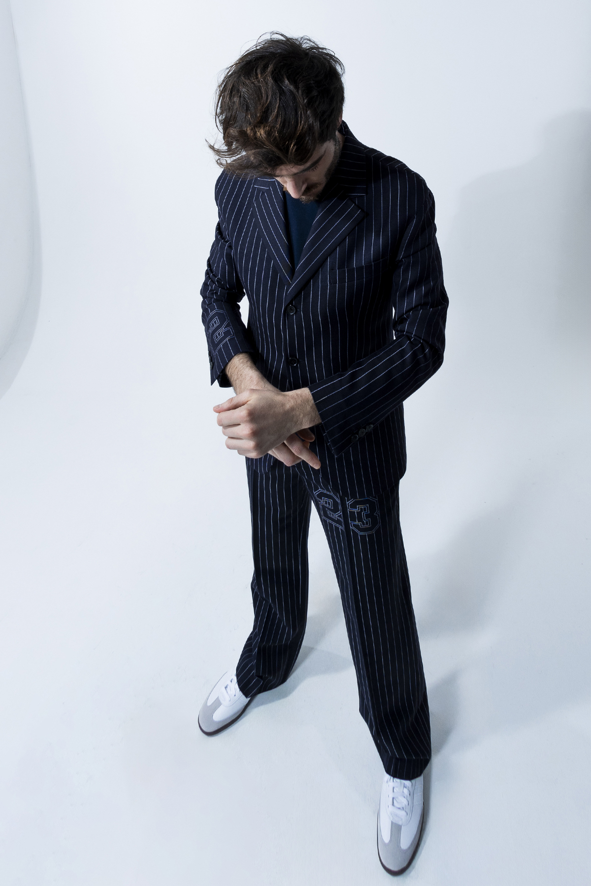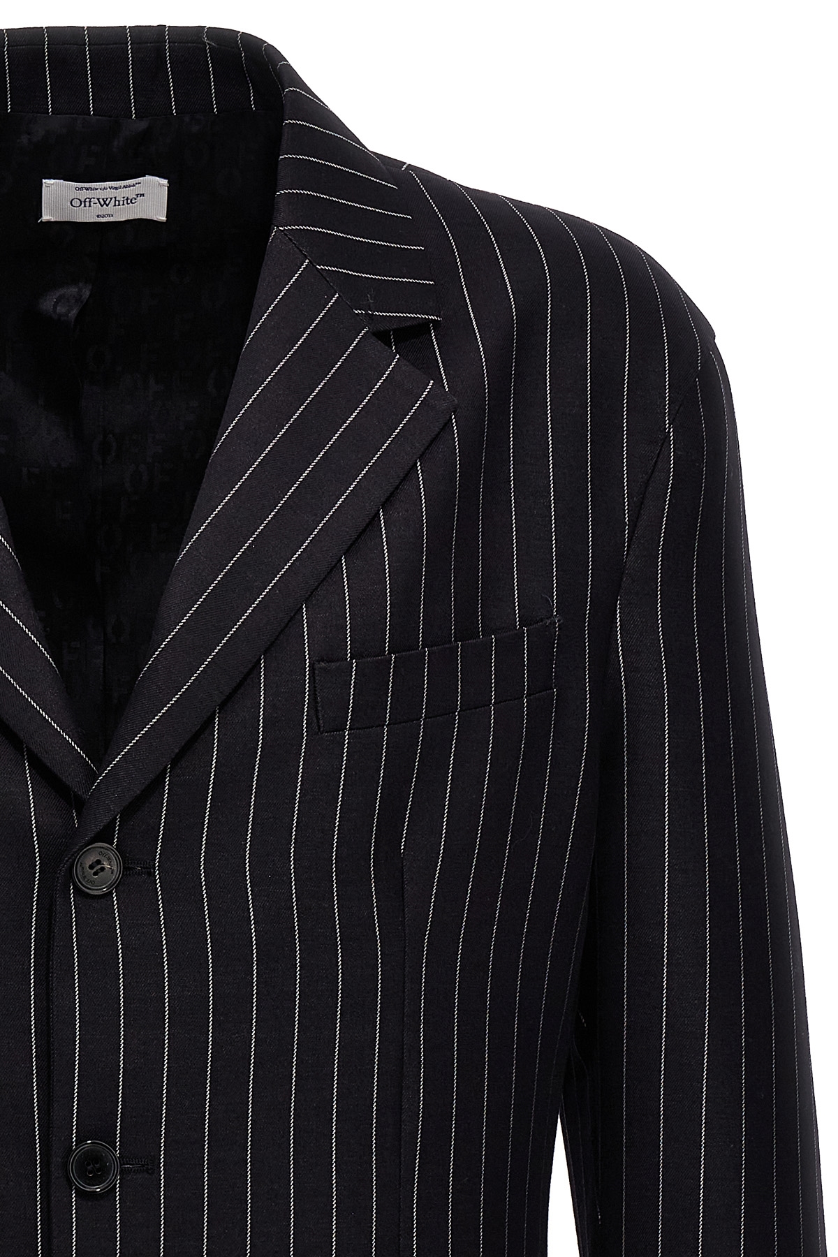 '23 pinstripes' single-breasted wool blend blazer with pinstripe pattern.