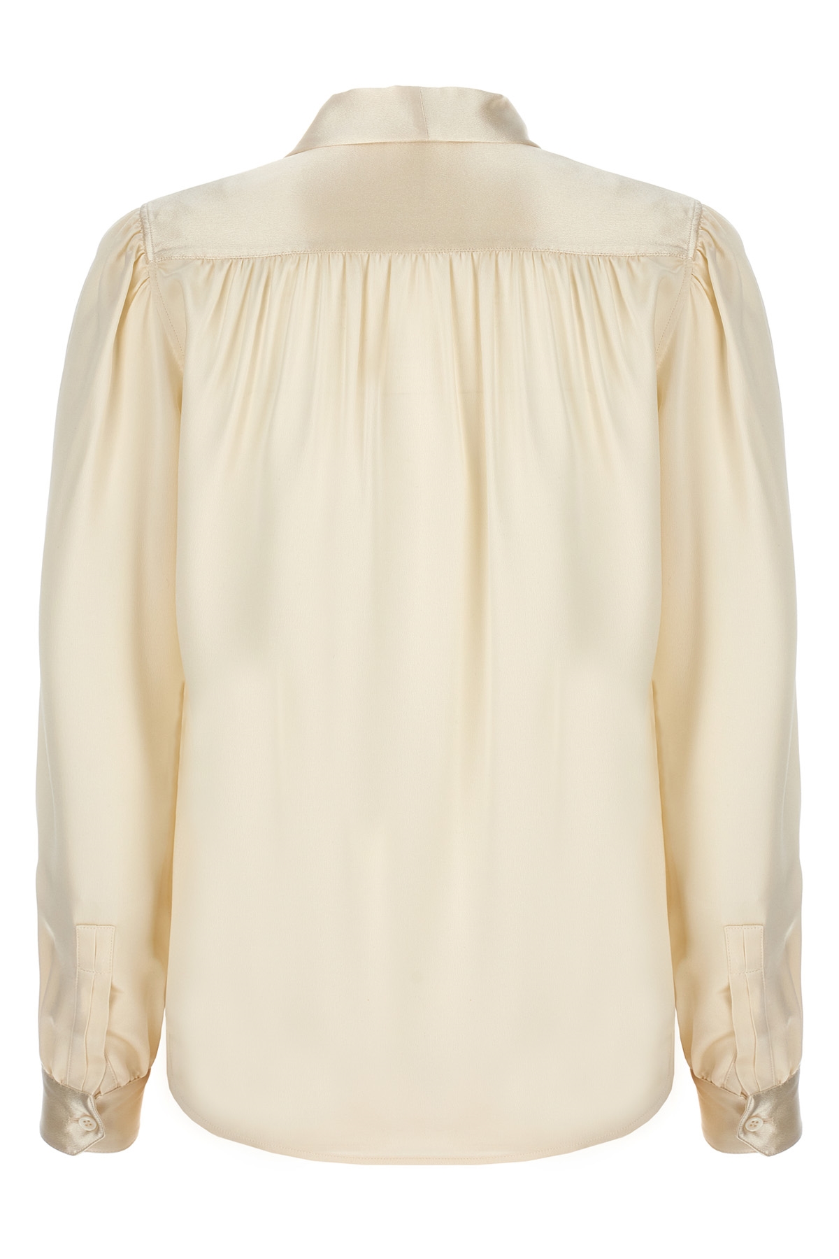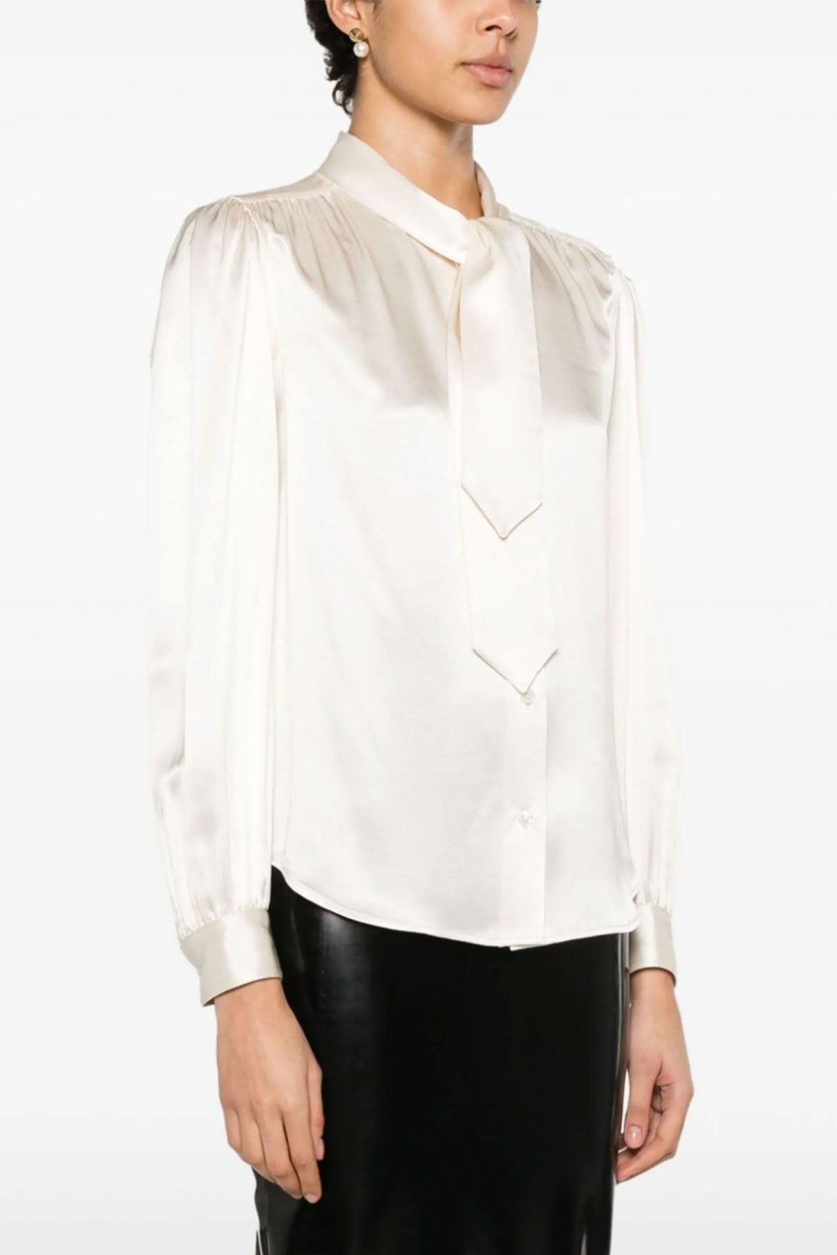 Silk shirt with button closure, lavalliere collar, long cuffed sleeves.