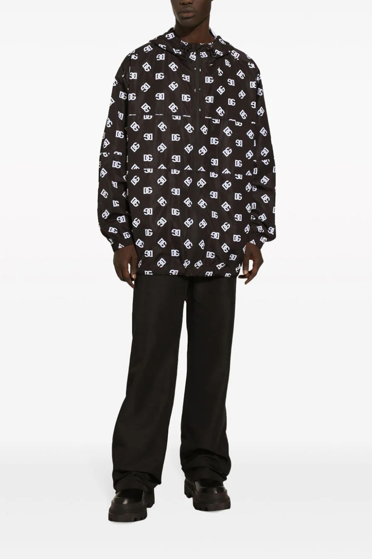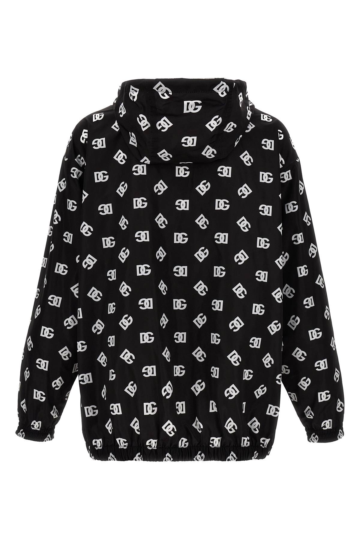 All-over logo print nylon hooded jacket, zip closure, pockets, long sleeves with elastic cuffs, adjustable drawstring at the hem.