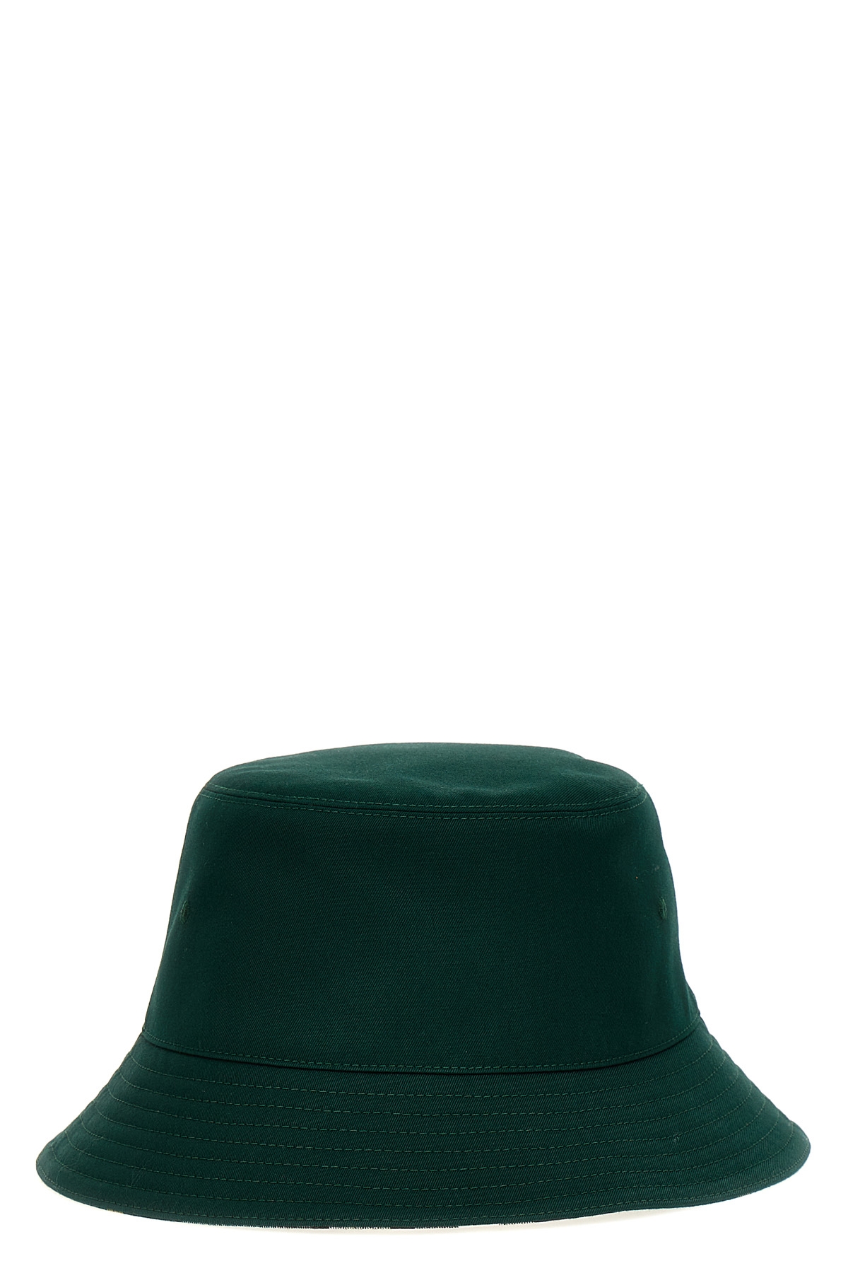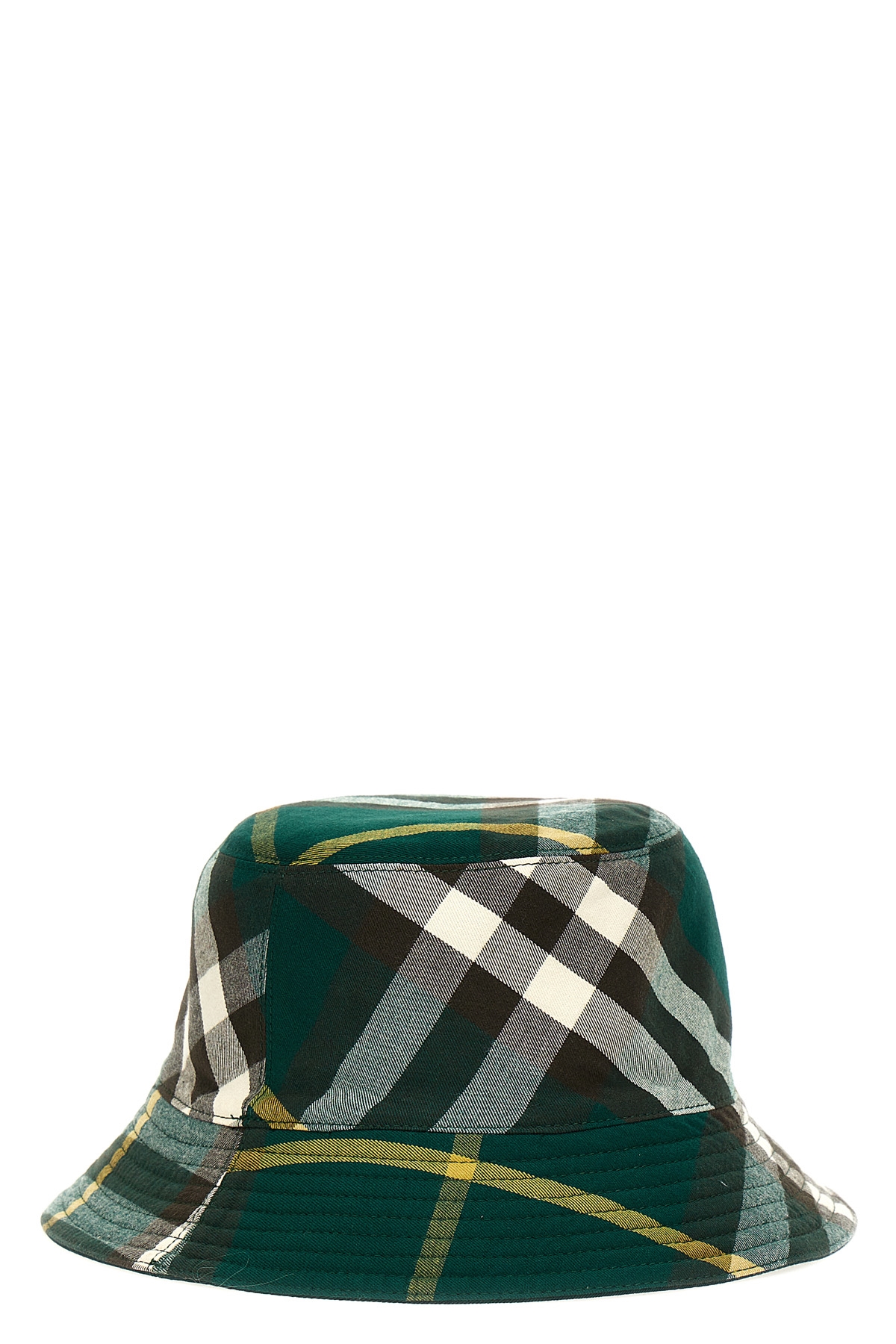 Reversible bucket hat in cotton blend twill with solid color side and check print side.