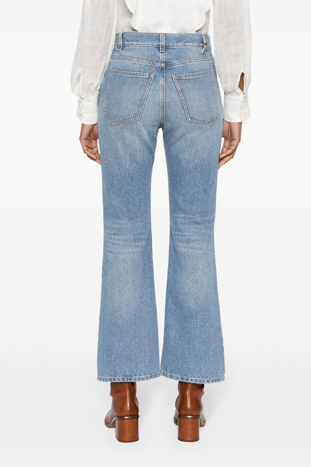 Denim jeans, high waist model with zip and button closure, straight leg, 5 pockets.