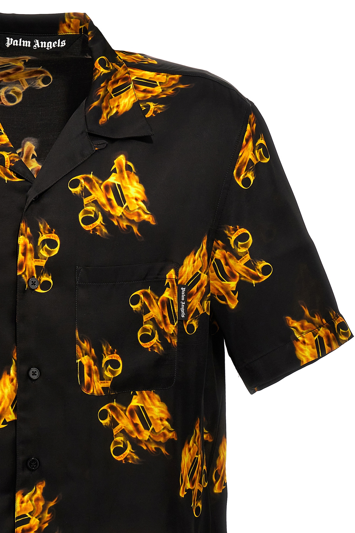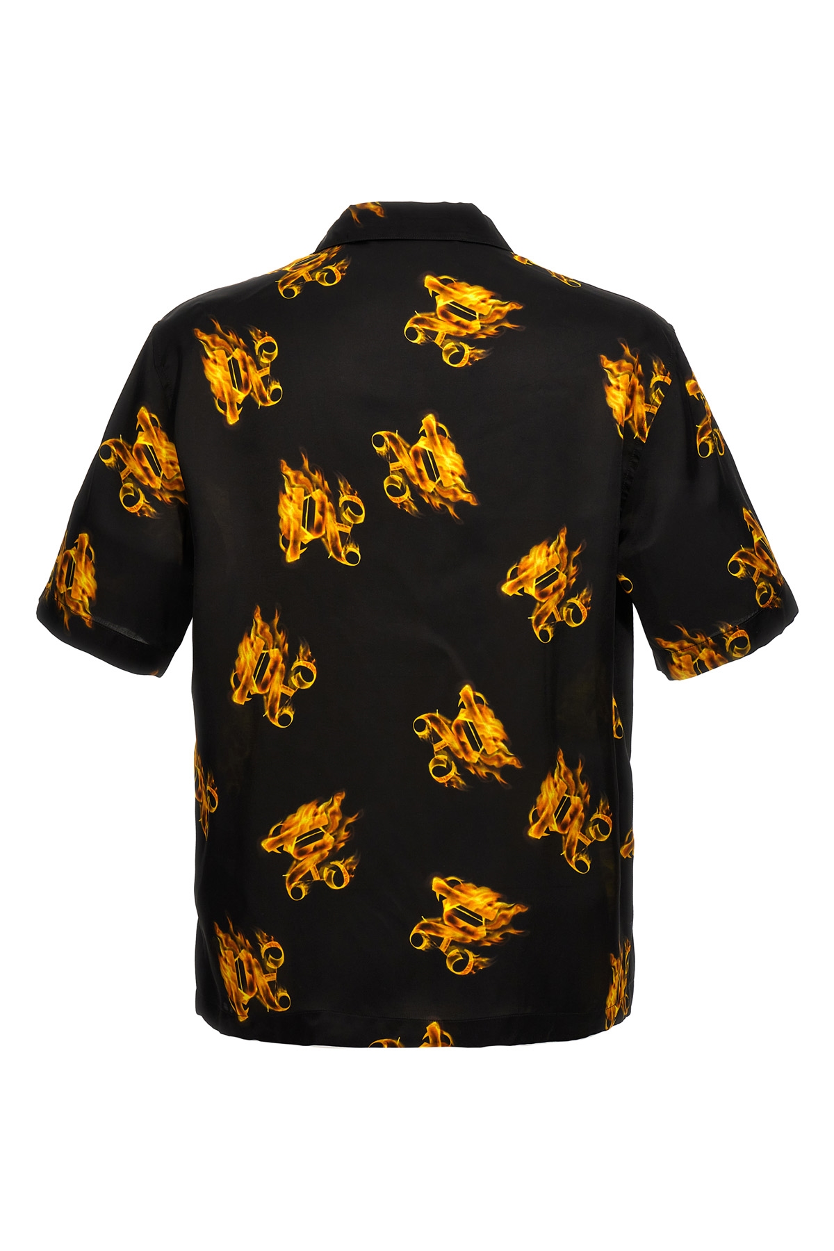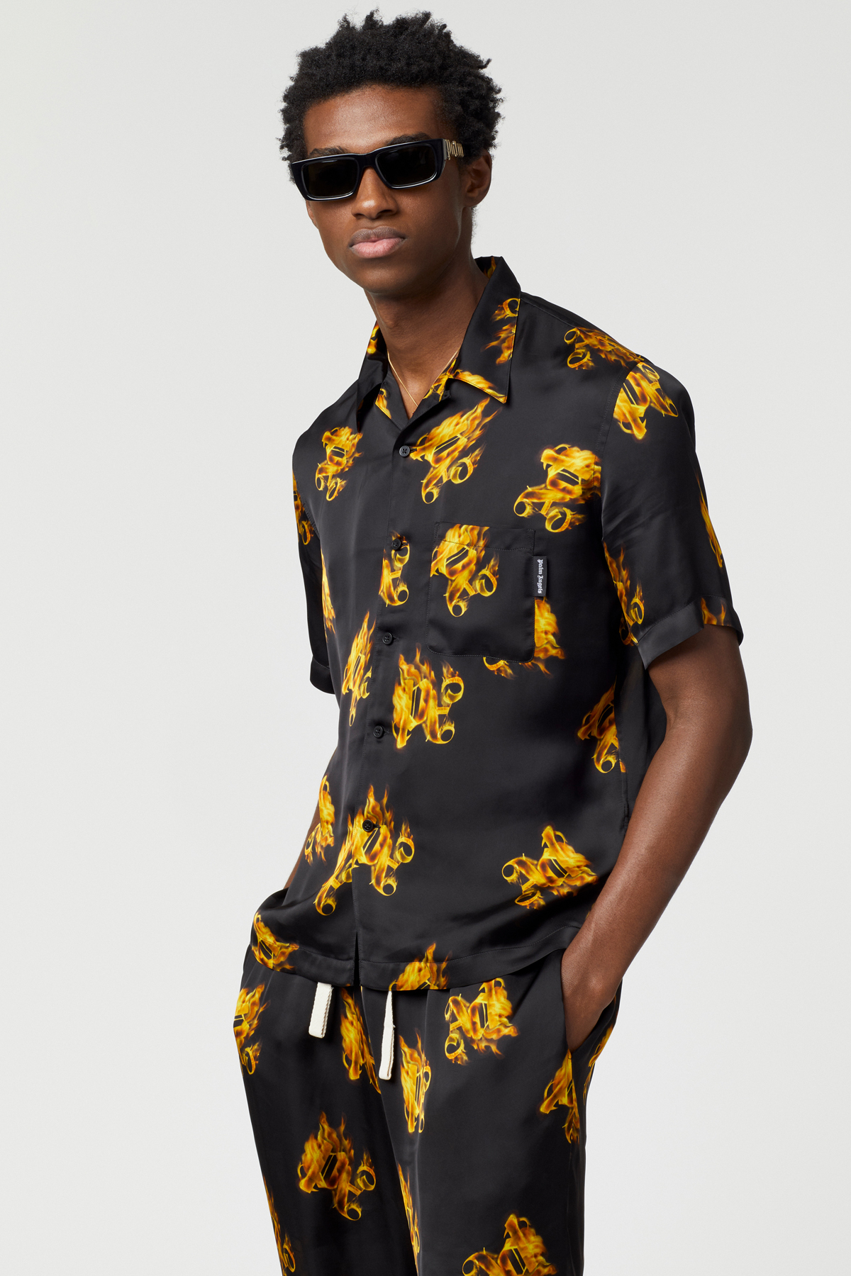 'Burning Monogram' satin shirt with all-over logo print, front pocket, button closure, short sleeves.