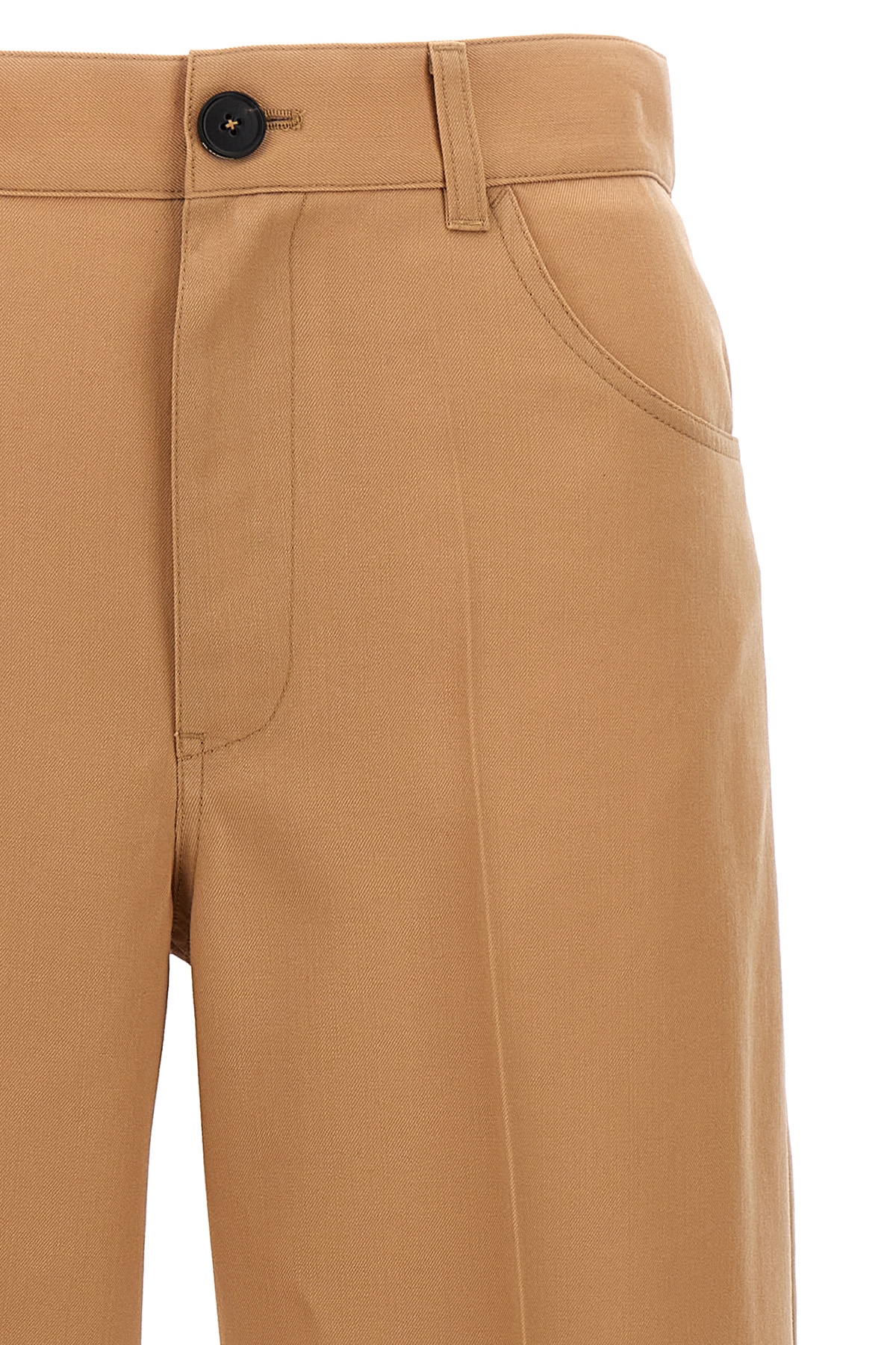 Wool gabardine pants with loose leg, uncle and button closure, five pockets.
