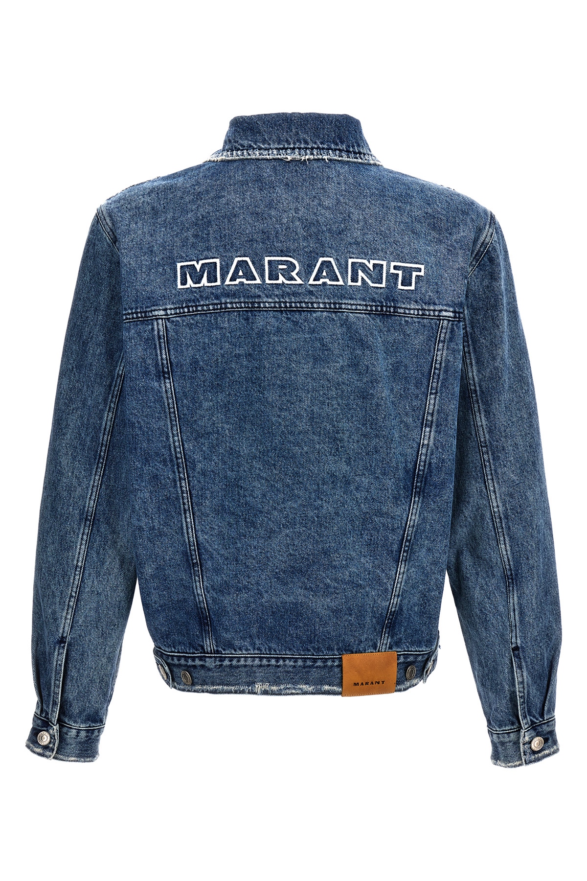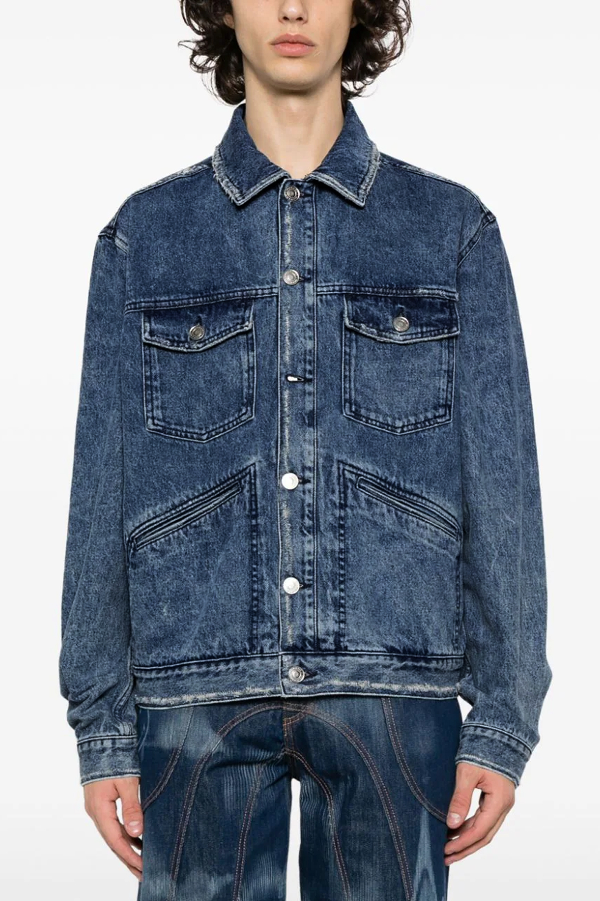 'Jango' cotton denim jacket with frayed details, pockets, button closure, long cuffed sleeves, and back logo embroidery.