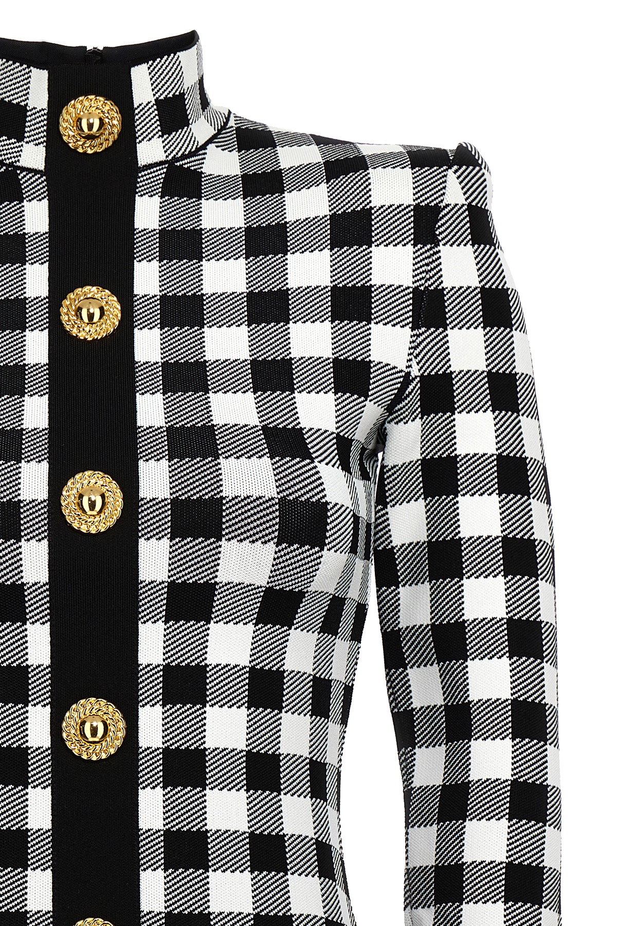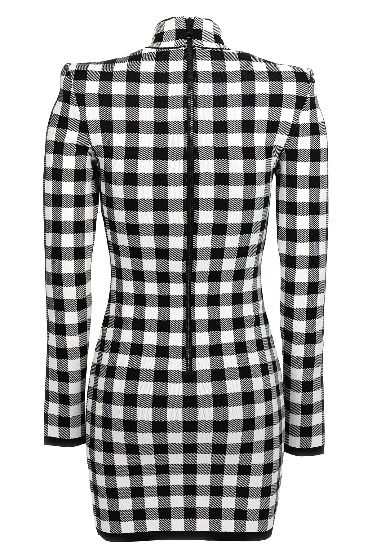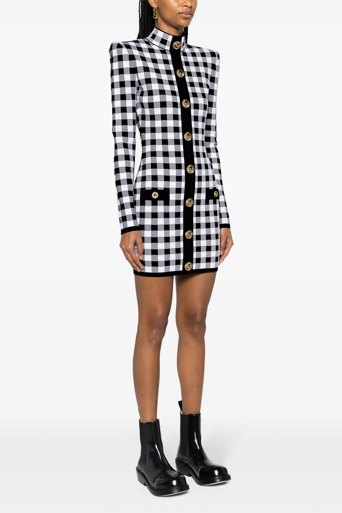 Vichy print viscose blend knit dress, high neck, long sleeves, back zip closure, padded shoulders, front logo buttons.