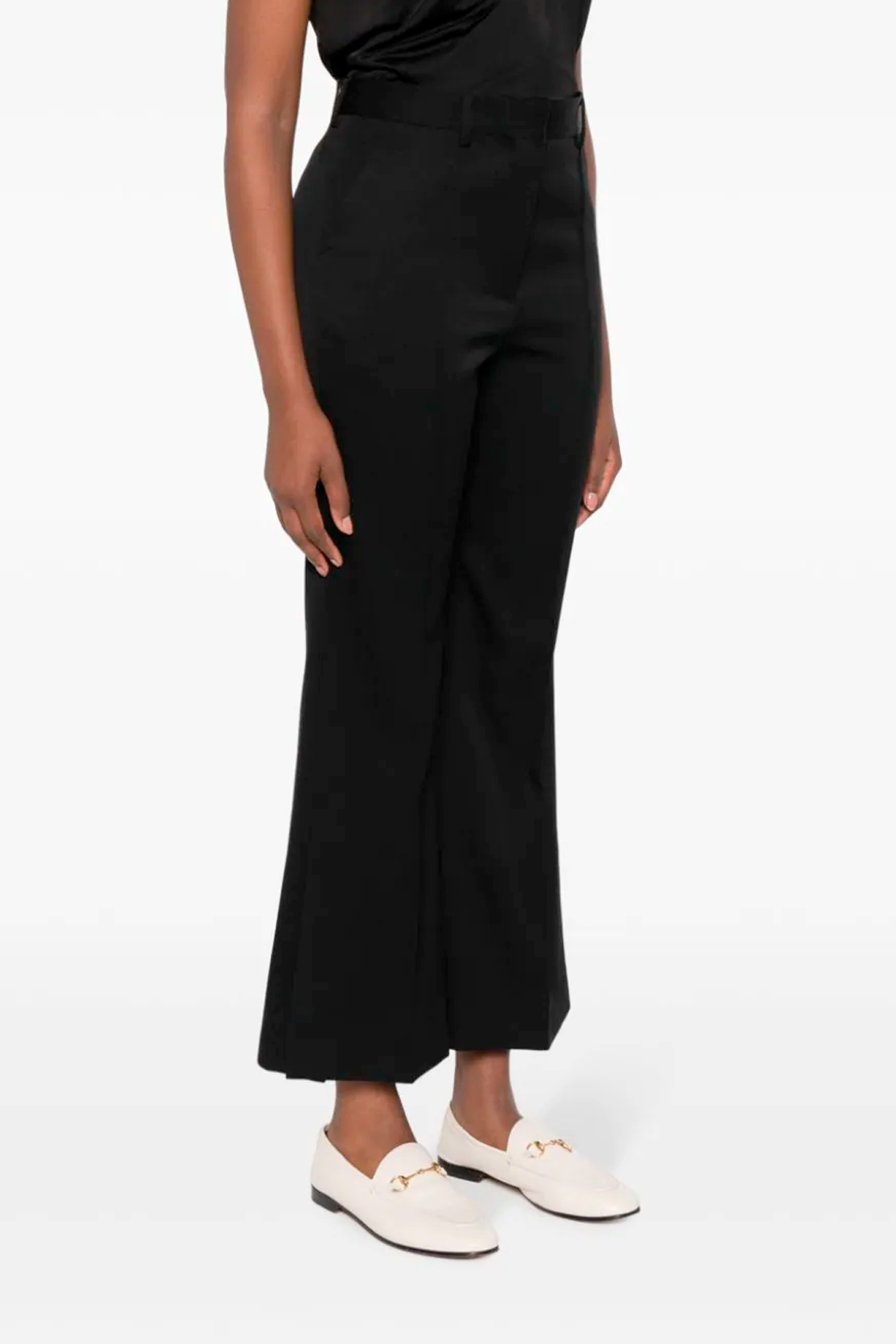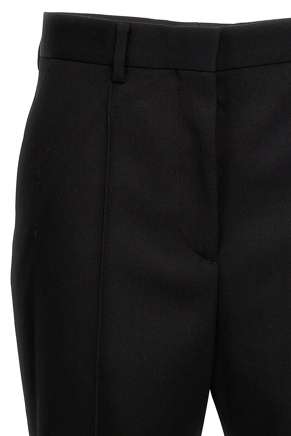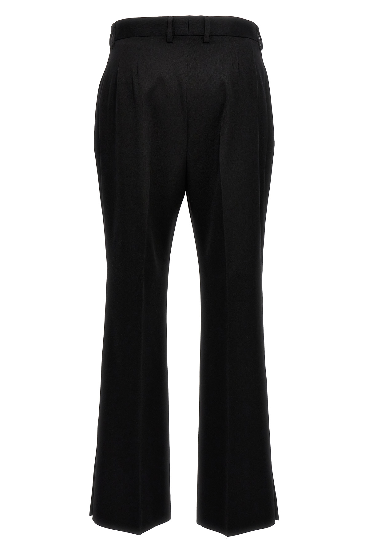 Flare wool pants, hook and button zip closure, leg with central pleat and split detail on the bottom, pockets.