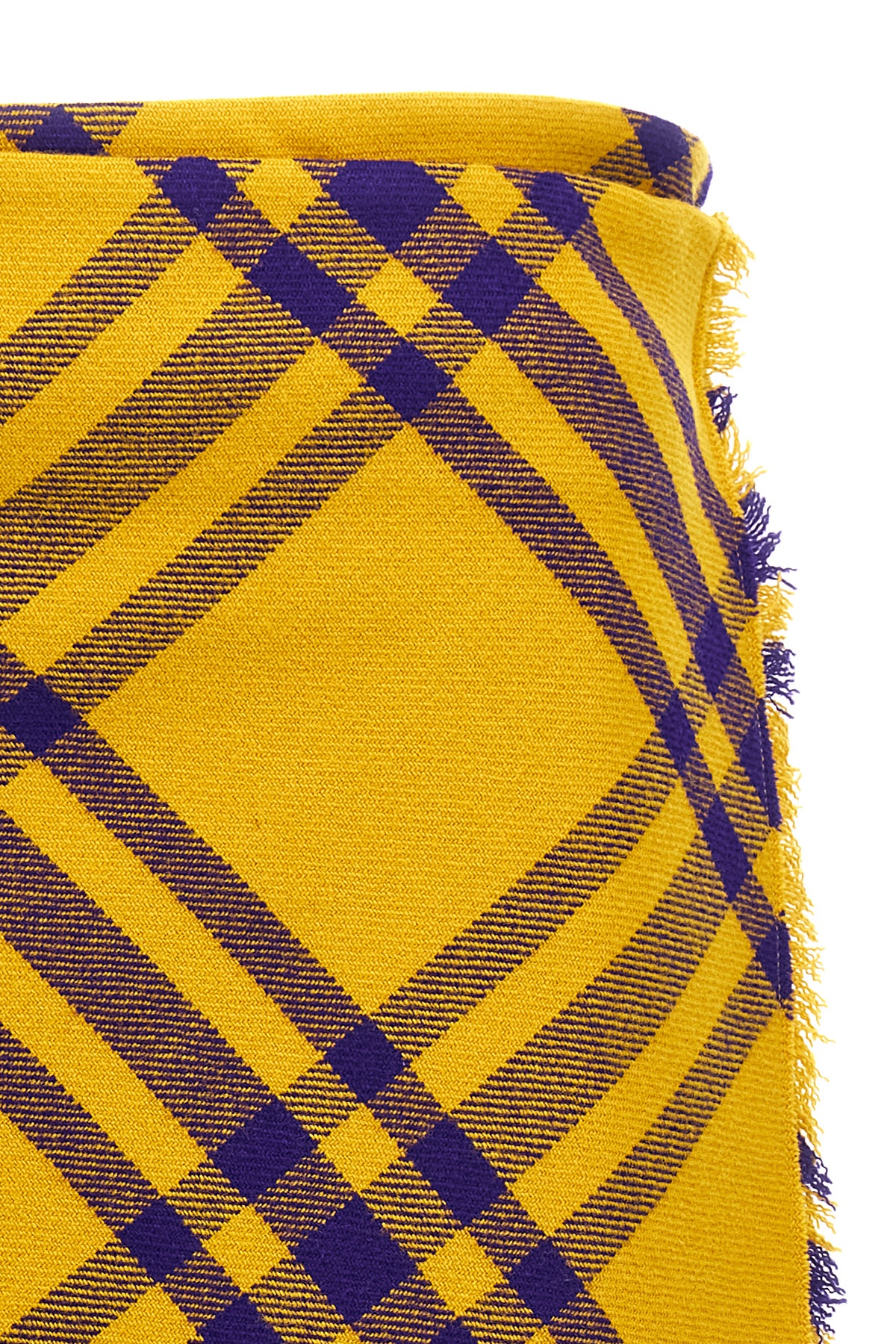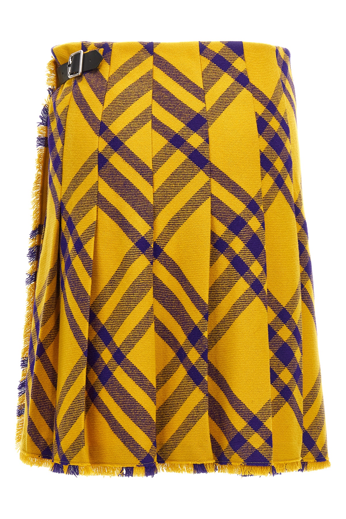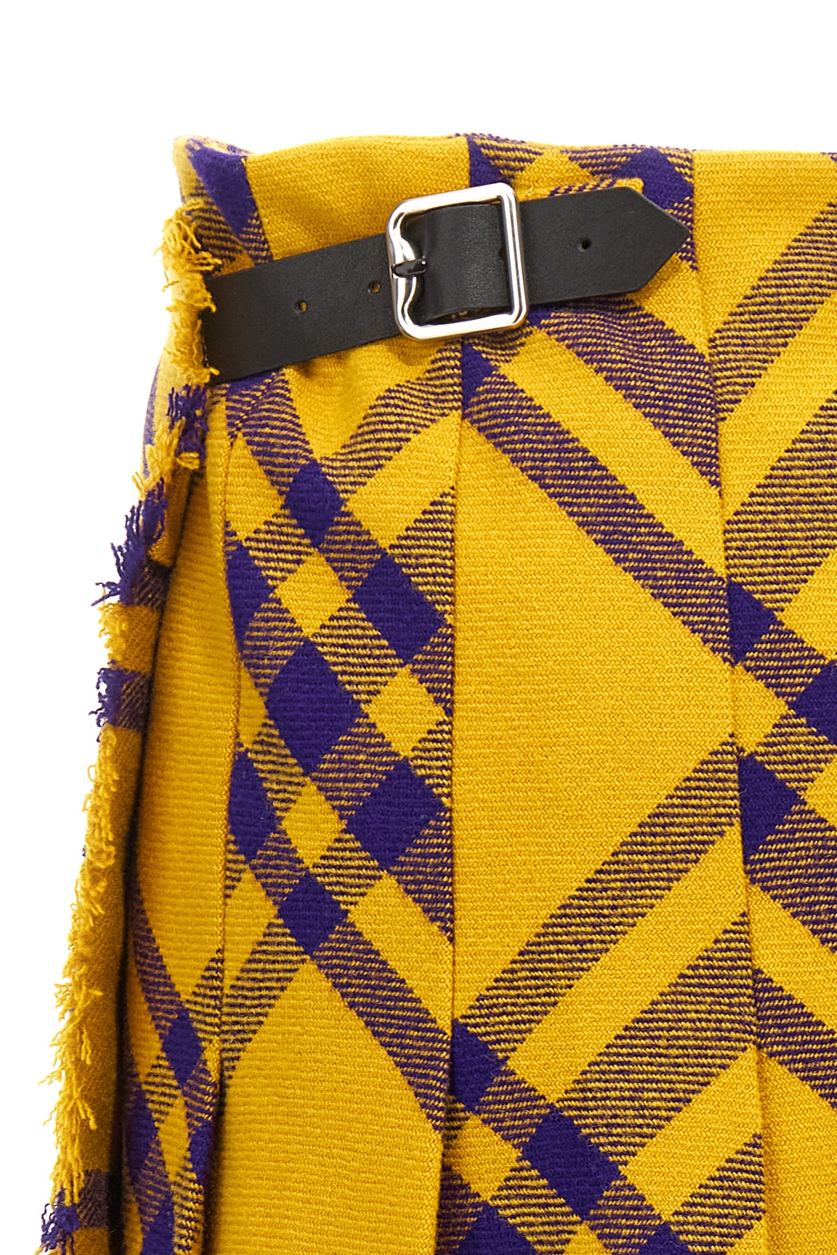 'Kilt' check print wool skirt, side button closure, B-shaped buckle, fringed edges.